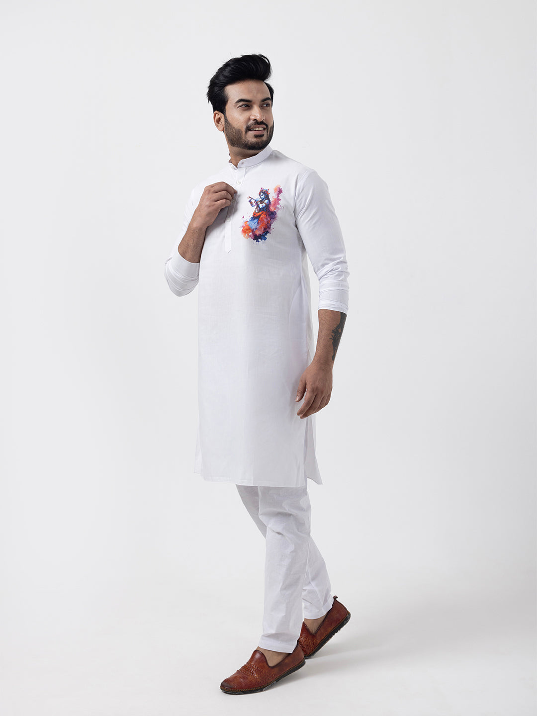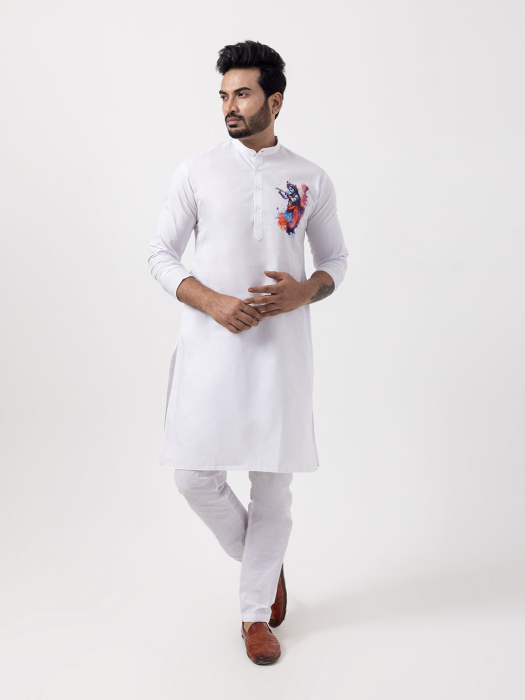 "Elevate your ethnic style with this White cotton kurta and white pyjama set. Designed for comfort and elegance, it features a subtle print and a mandarin collar, perfect for festive and cultural occasions."