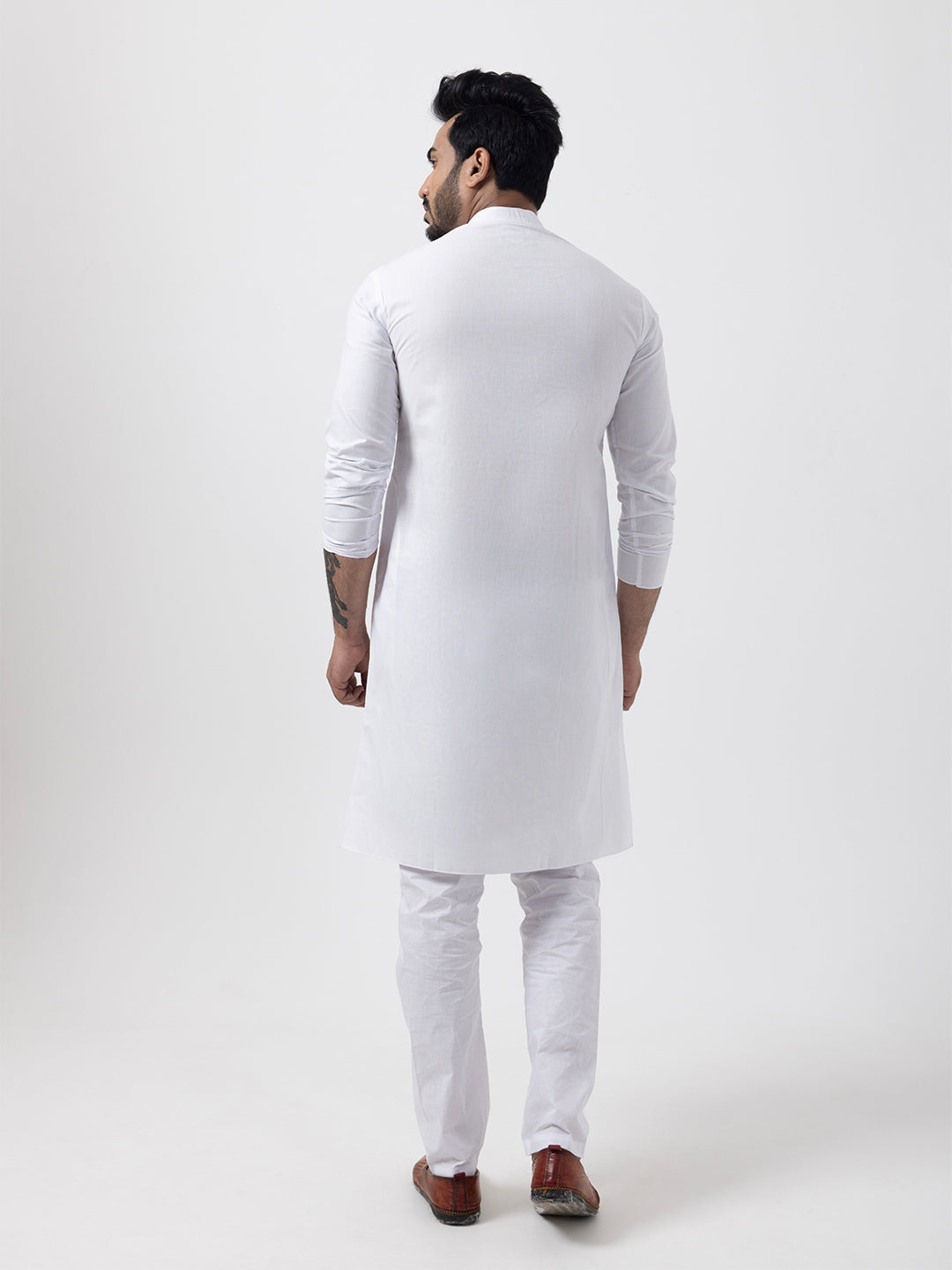 Pair this White kurta with white churidar or slim-fit trousers for a timeless ethnic look. Complete the outfit with leather loafers or traditional juttis to make a bold style statement.