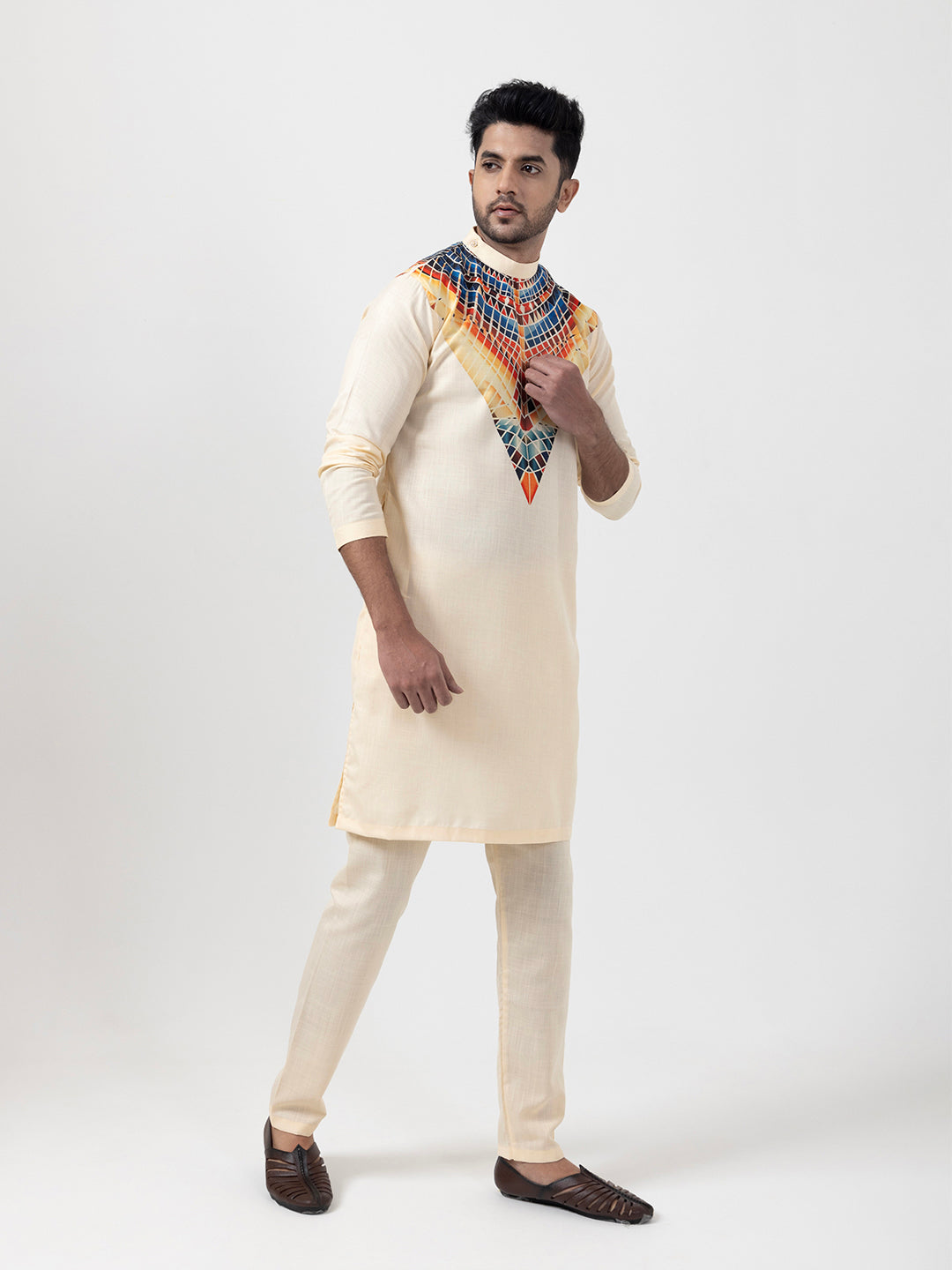 Pair this Beige Cotton Kurta with a contrasting churidar or straight-fit pyjama to achieve a refined ethnic look. Complete the outfit with classic mojaris or leather sandals.