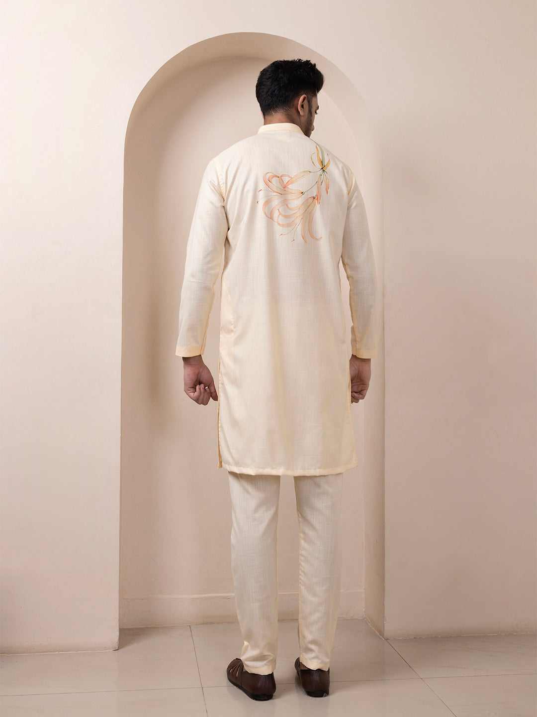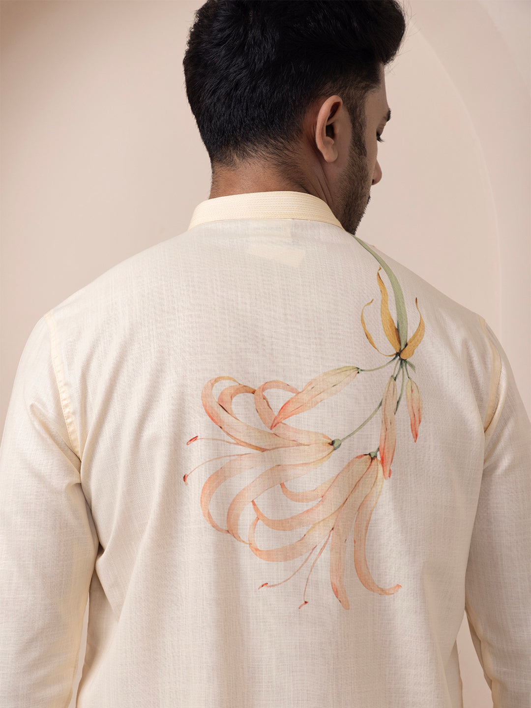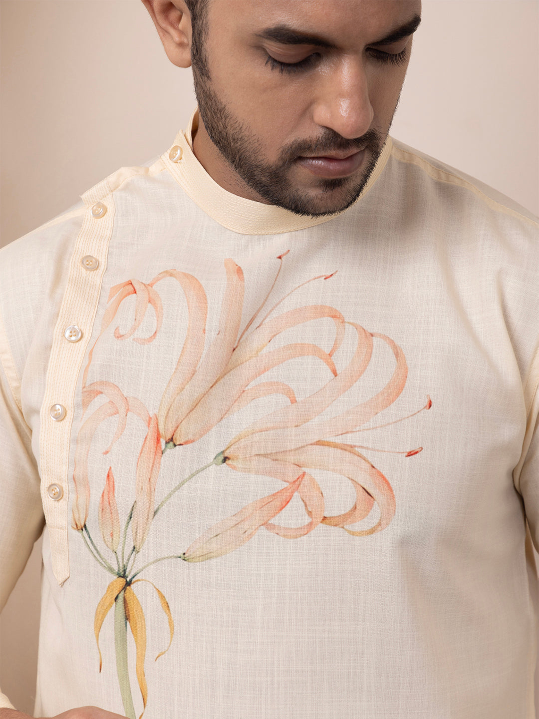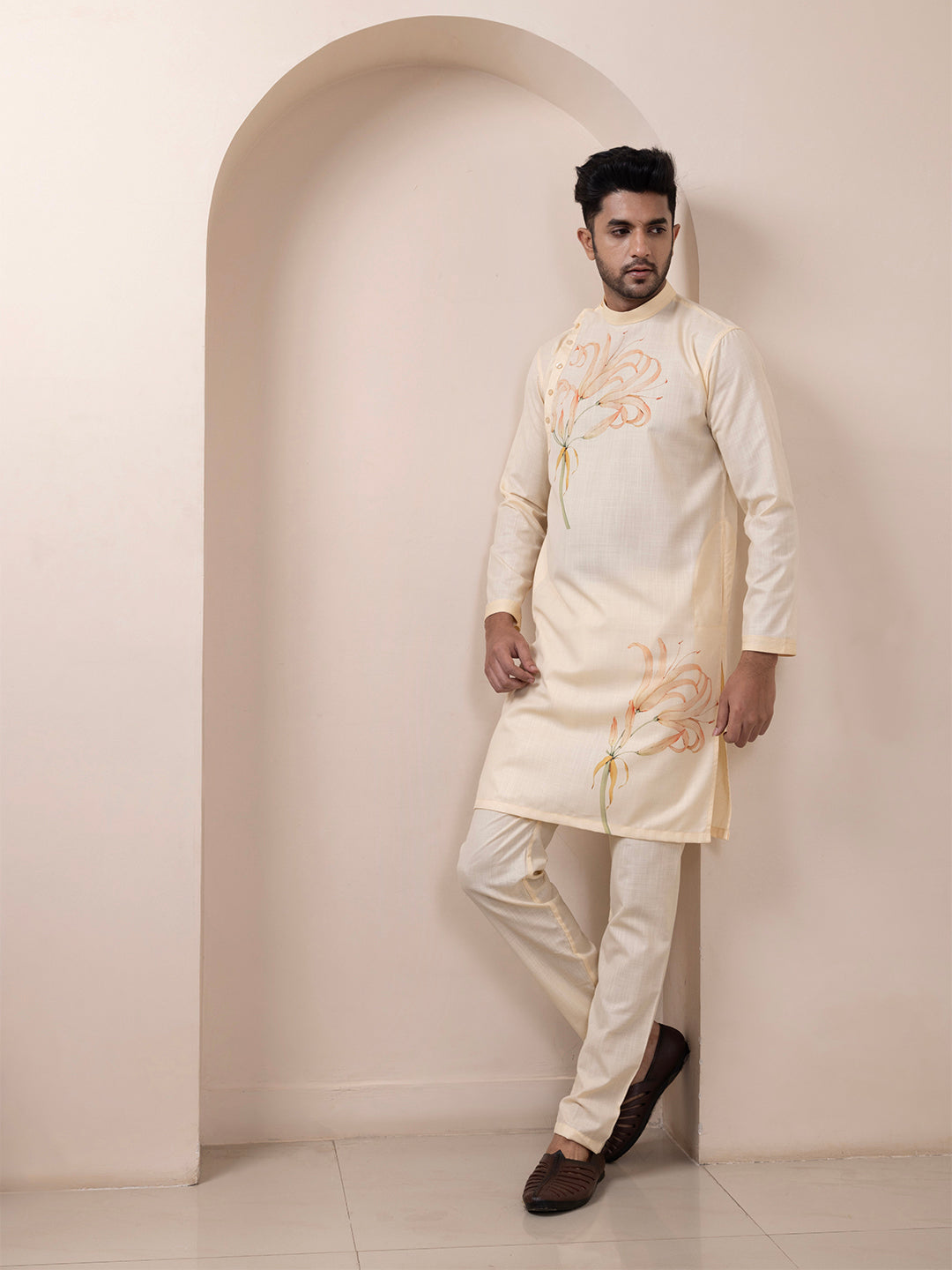Exude elegance and tradition with this Beige Cotton Kurta With Pyjama Set, featuring an exquisite ethnic motif print that enhances its regal appeal. Designed for comfort and style, this kurta is perfect for festive occasions, weddings, and cultural celebrations.