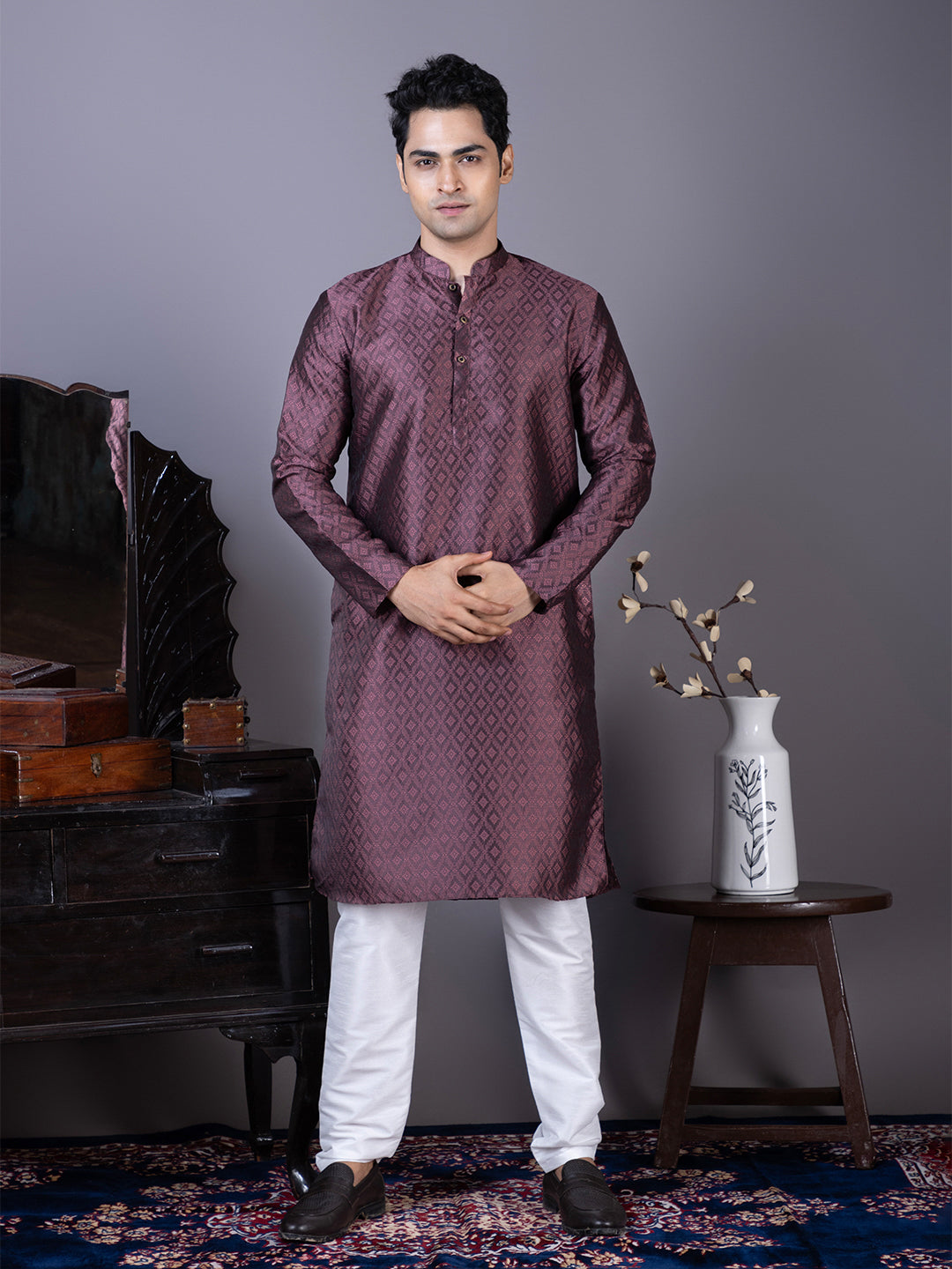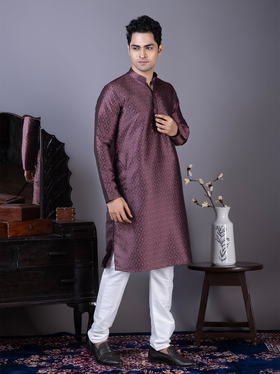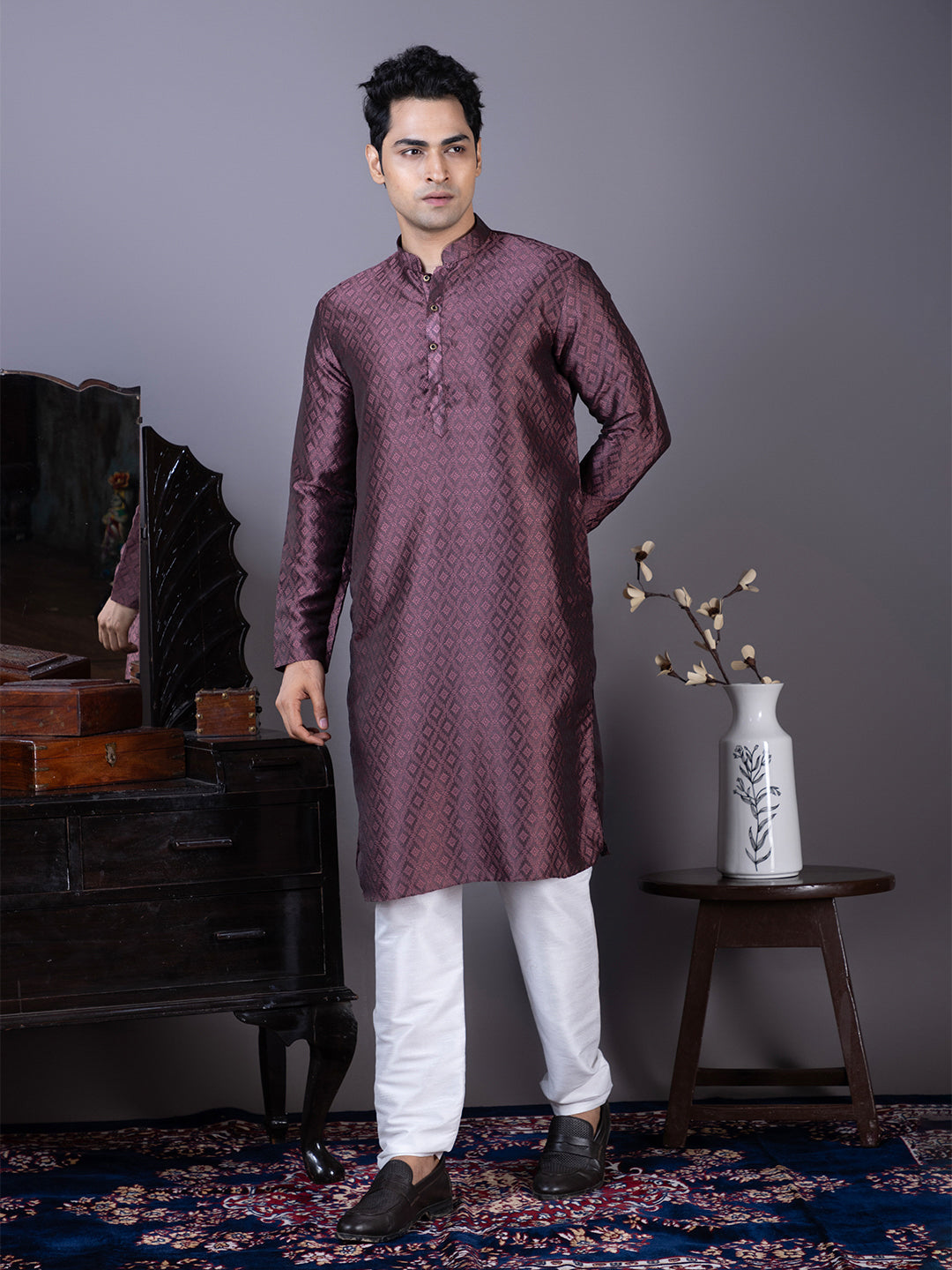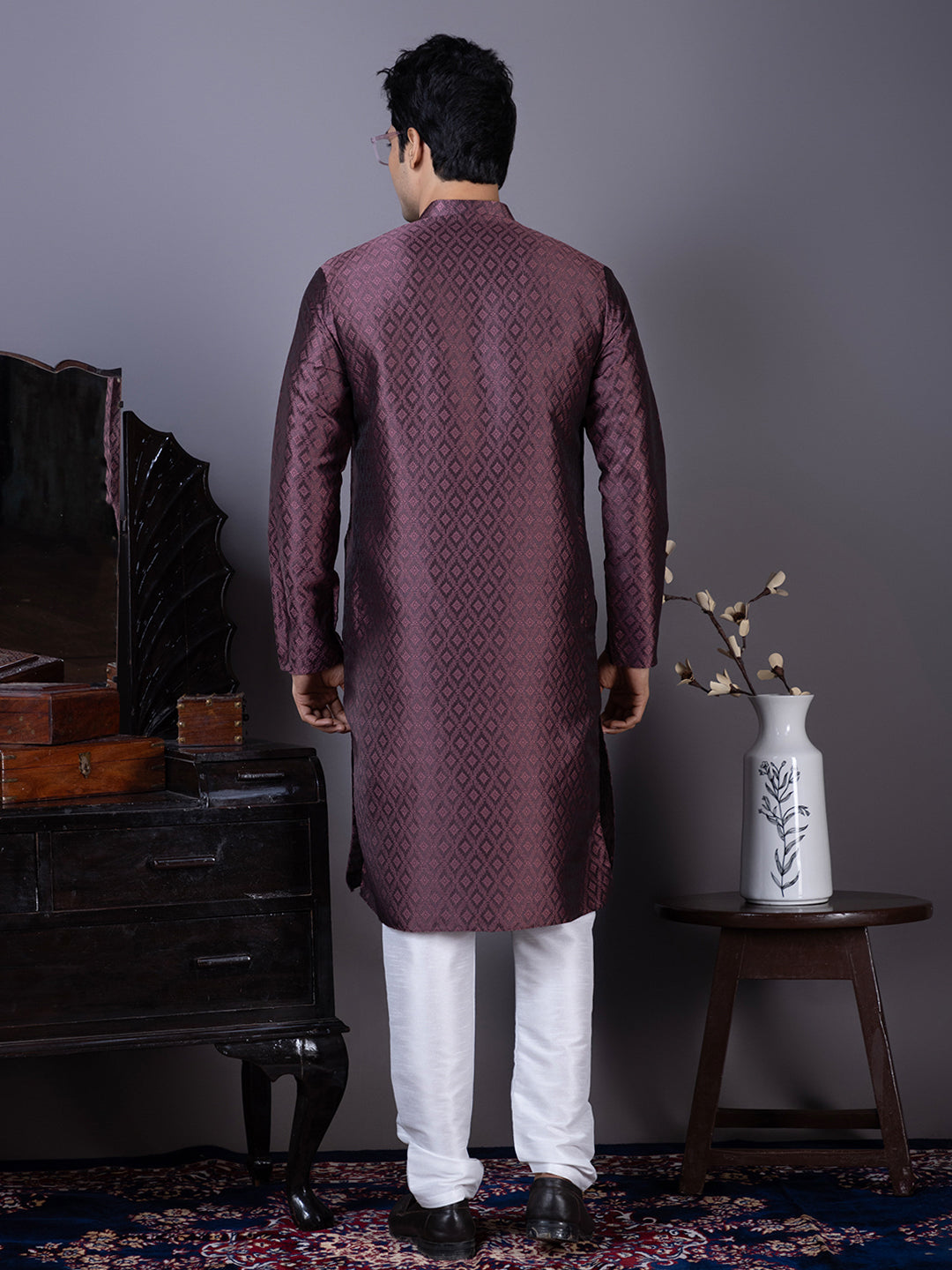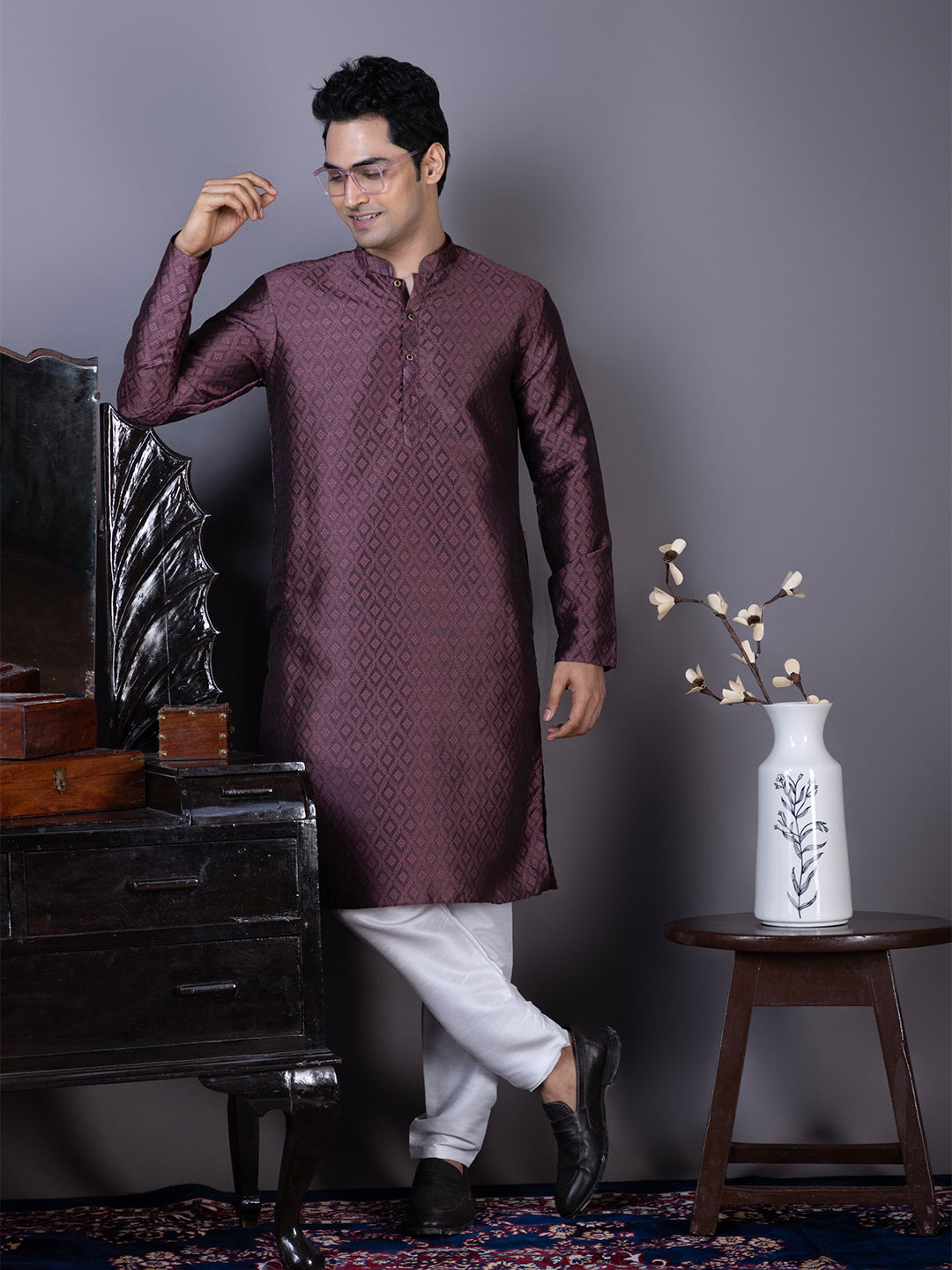 Pair this Purple Jacquard kurta with white churidar or trousers for a bold yet sophisticated ethnic look. Perfectly suited for evening parties and traditional celebrations.