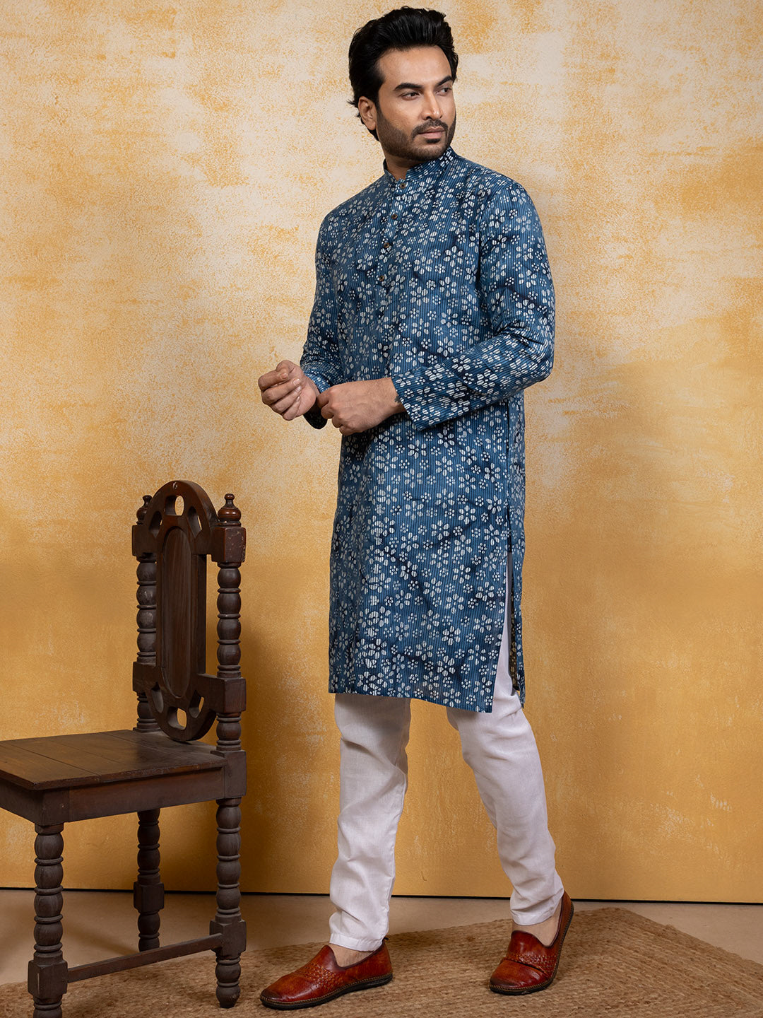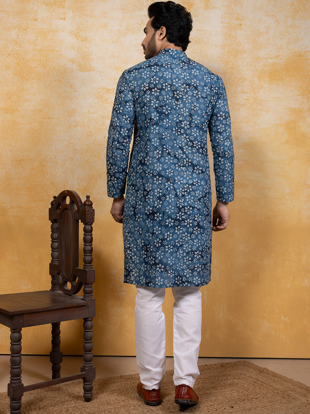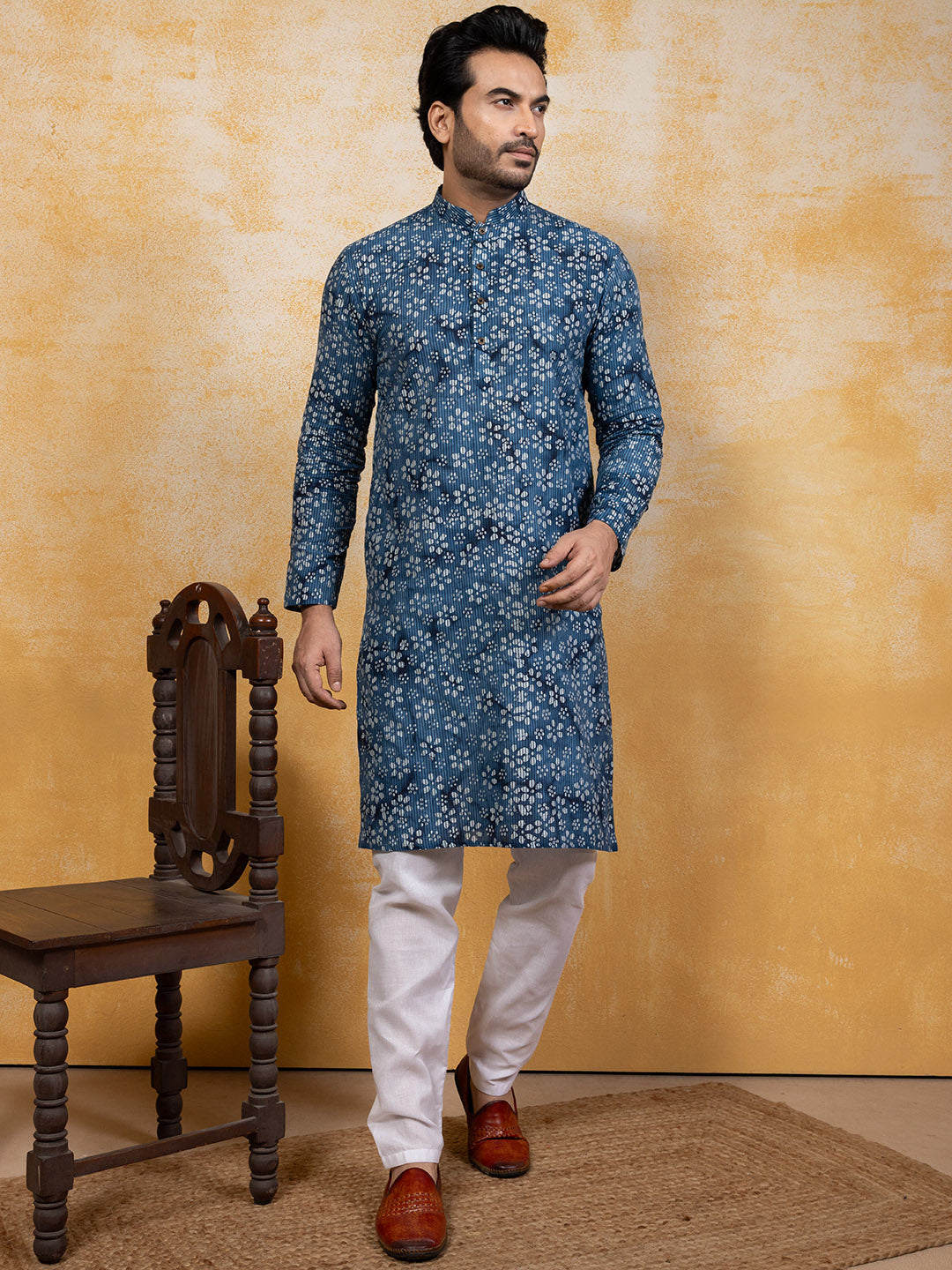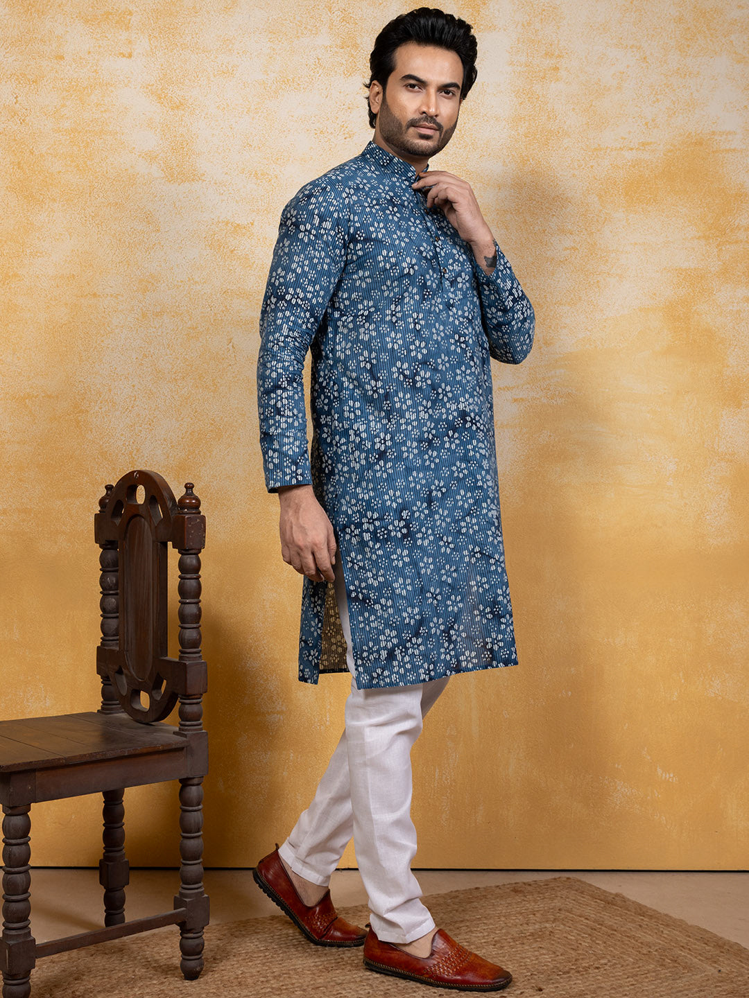 Elevate your ethnic style with this elegant Blue Cotton kurta set. Designed for festive and wedding occasions, it features a refined look with a stylish print, making it a timeless wardrobe addition.