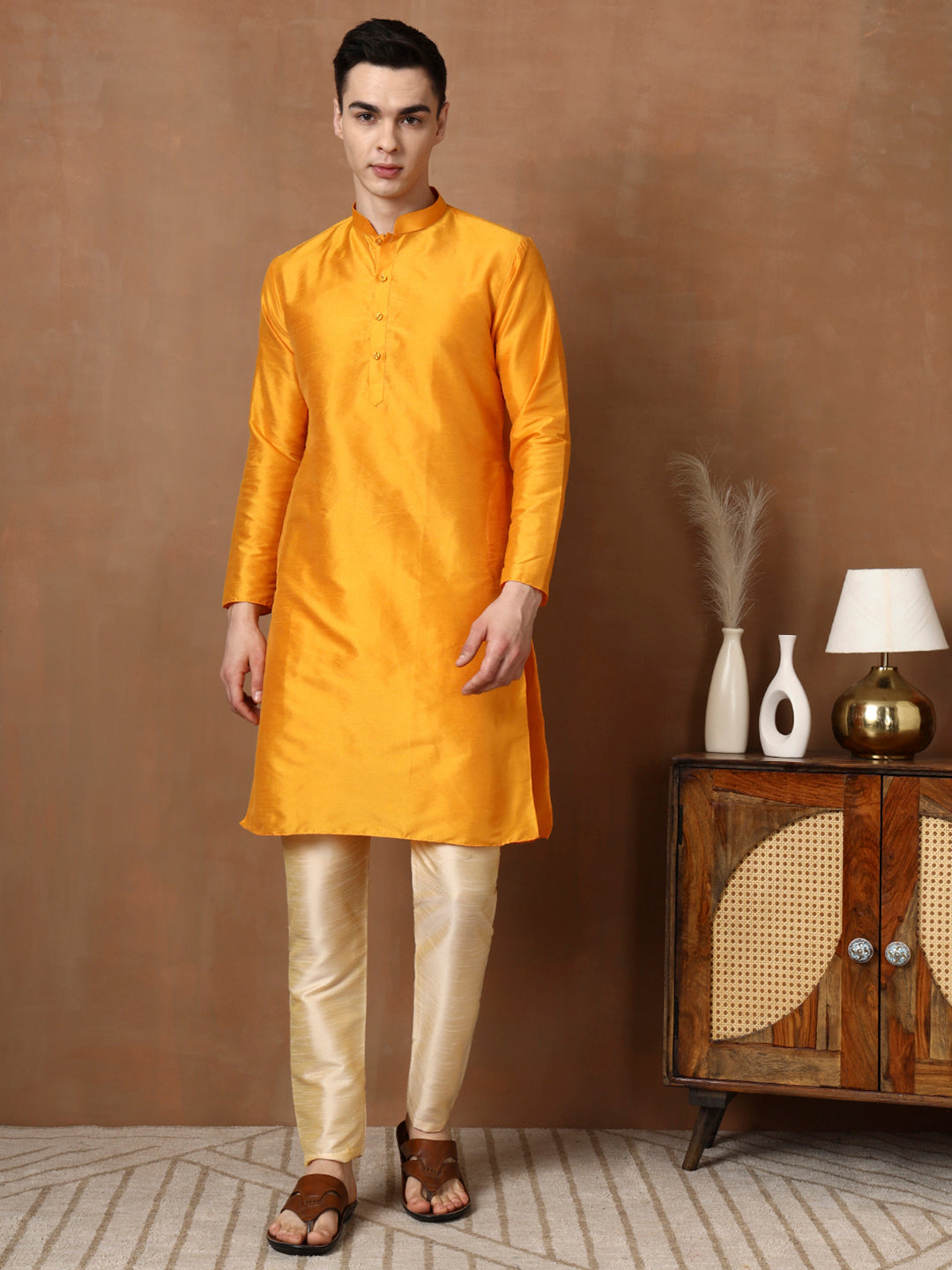Elevate your ethnic style with this Mustard Dupion Silk Kurta and Beige pyjama set. Crafted from premium fabric, it offers a regal look with a refined finish. Perfect for festive occasions and celebrations.