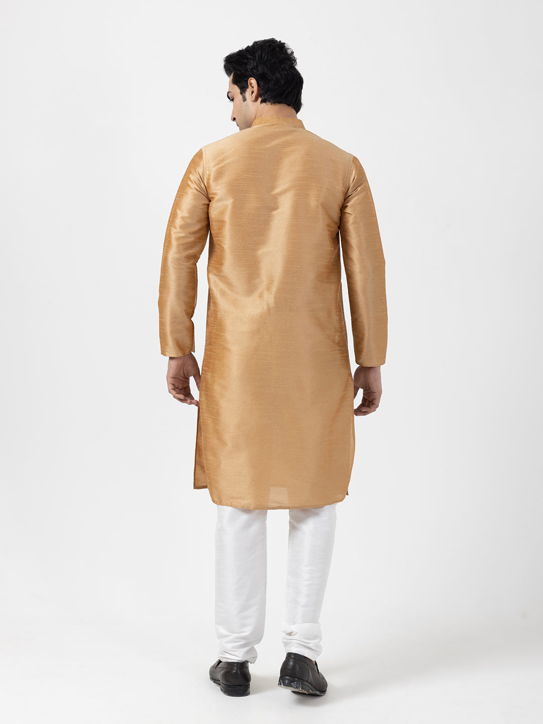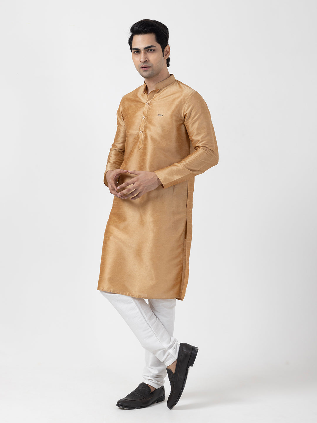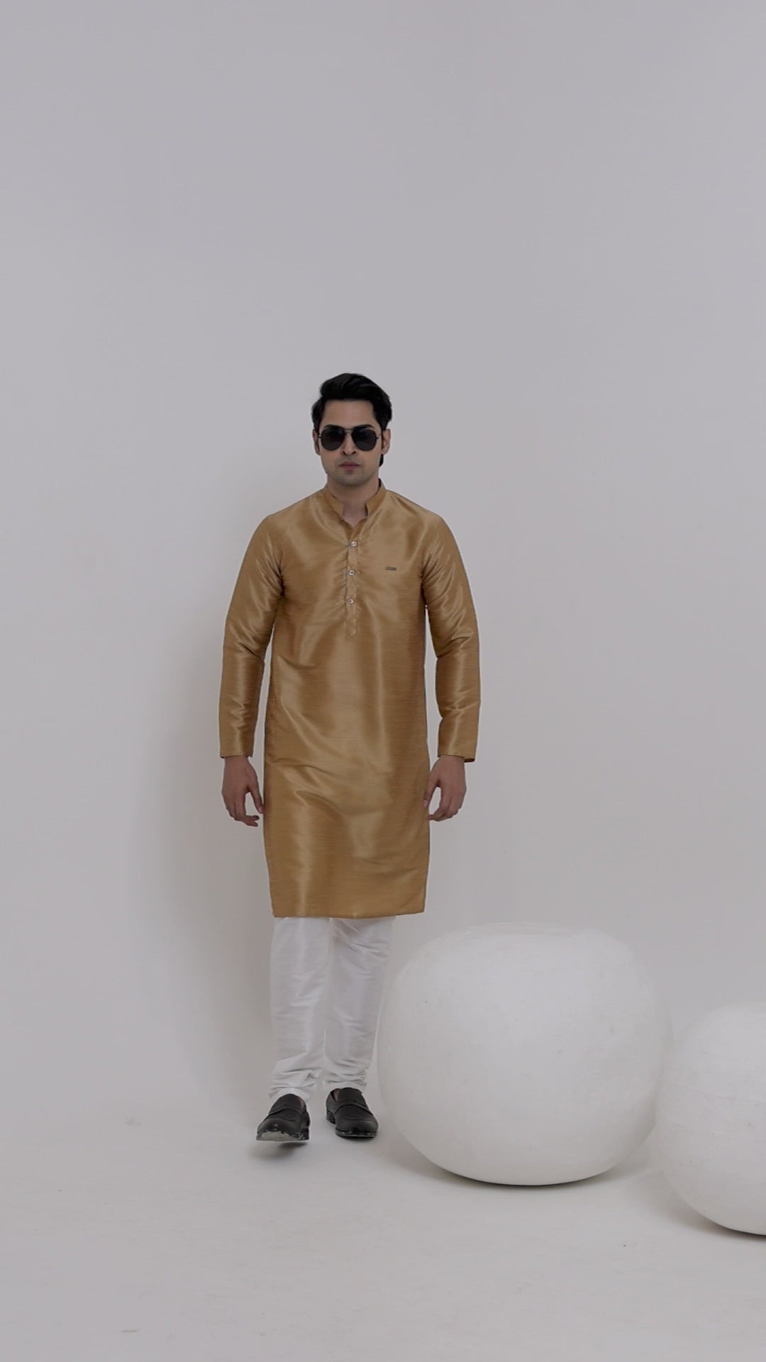 Elevate your ethnic style with this Brown Dupion Silk Kurta and White pyjama set. Crafted from premium fabric, it offers a regal look with a refined finish. Perfect for festive occasions and celebrations.