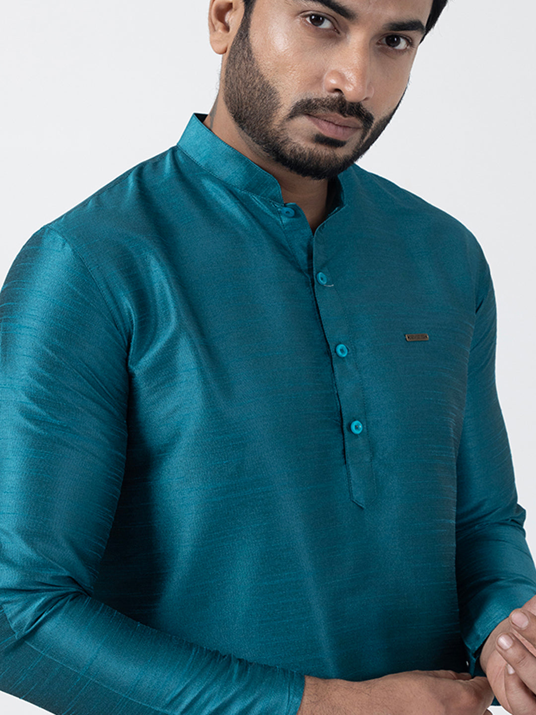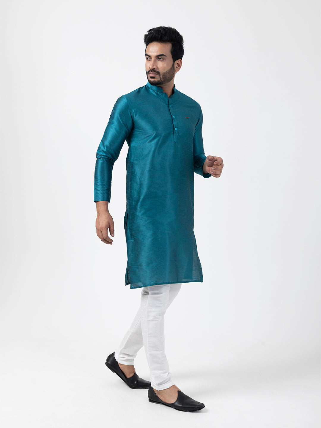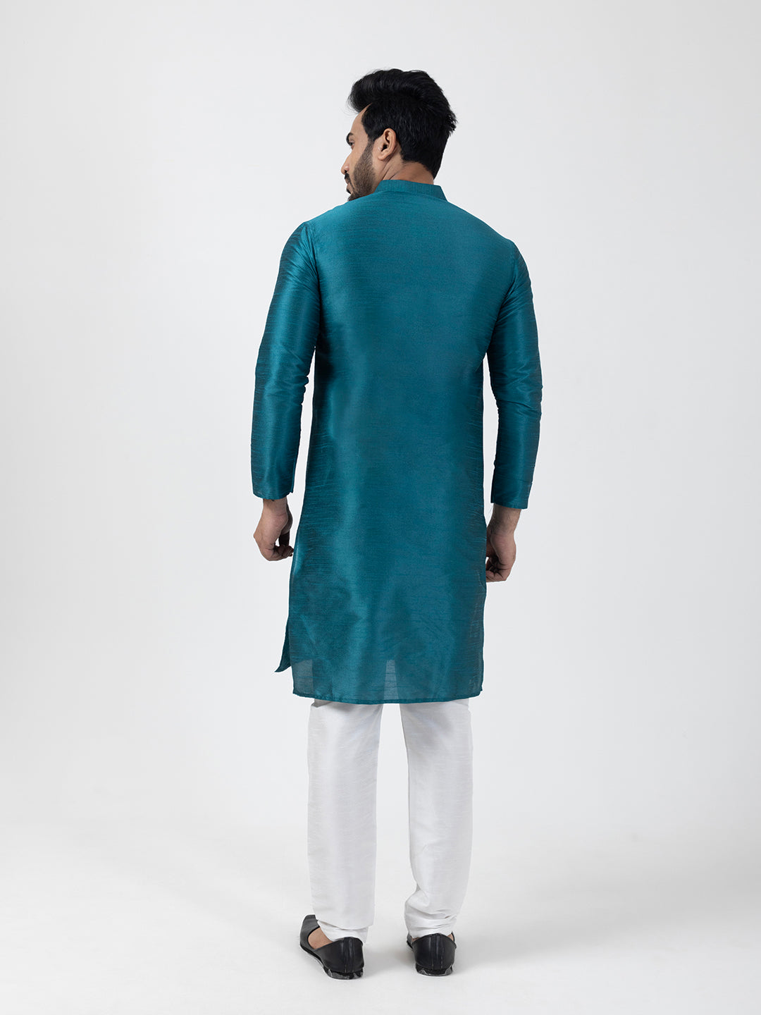 Elevate your ethnic style with this Teal Dupion Silk Kurta and White pyjama set. Crafted from premium fabric, it offers a regal look with a refined finish. Perfect for festive occasions and celebrations.