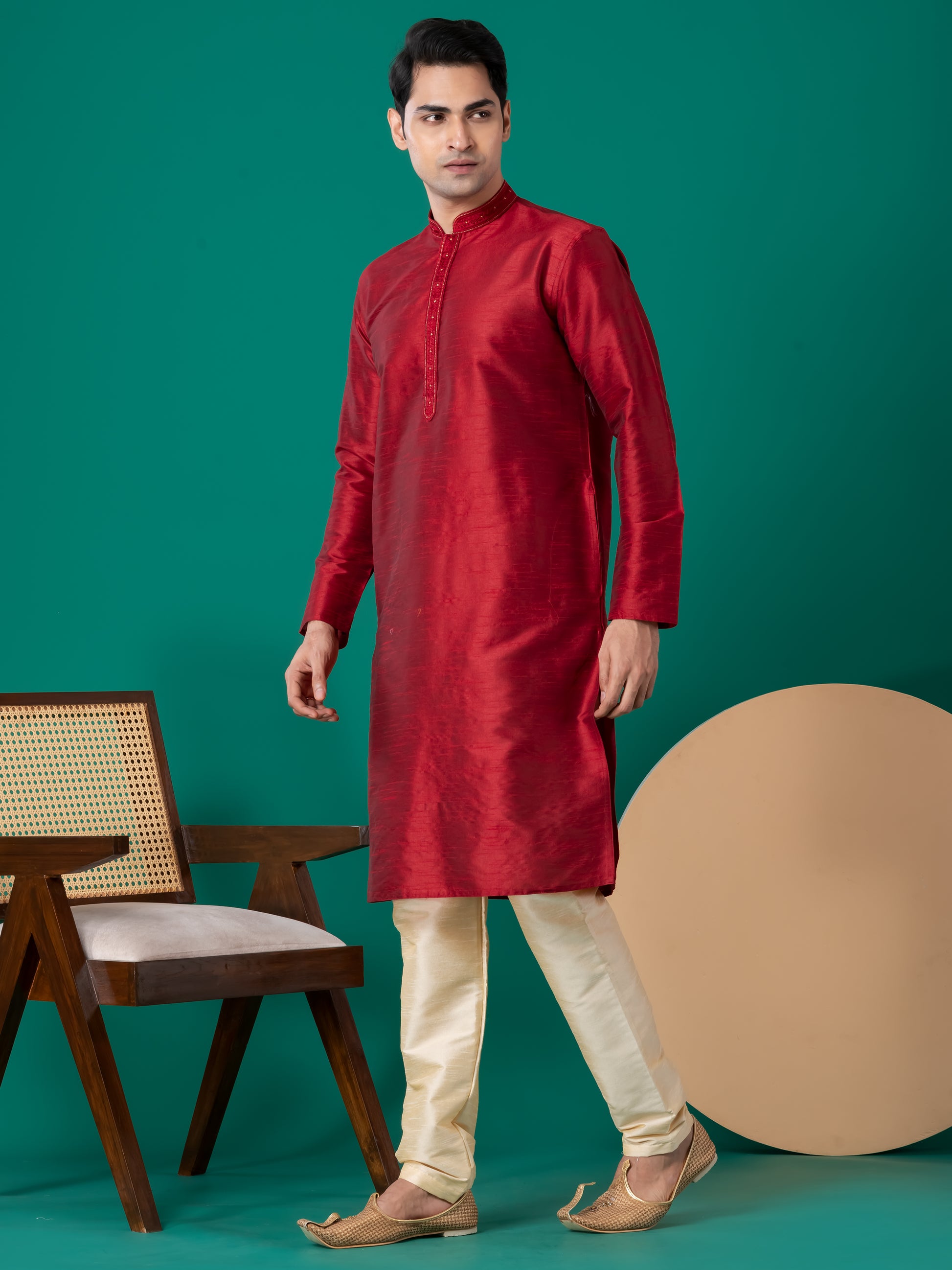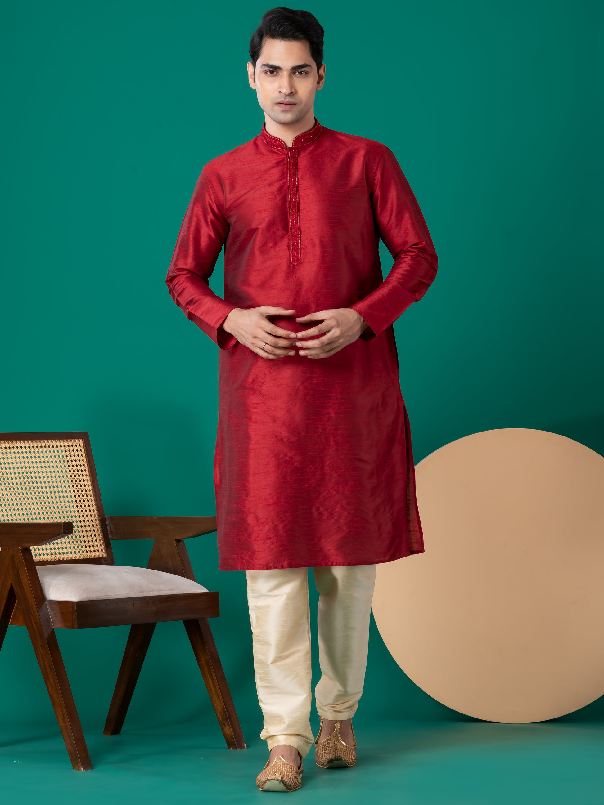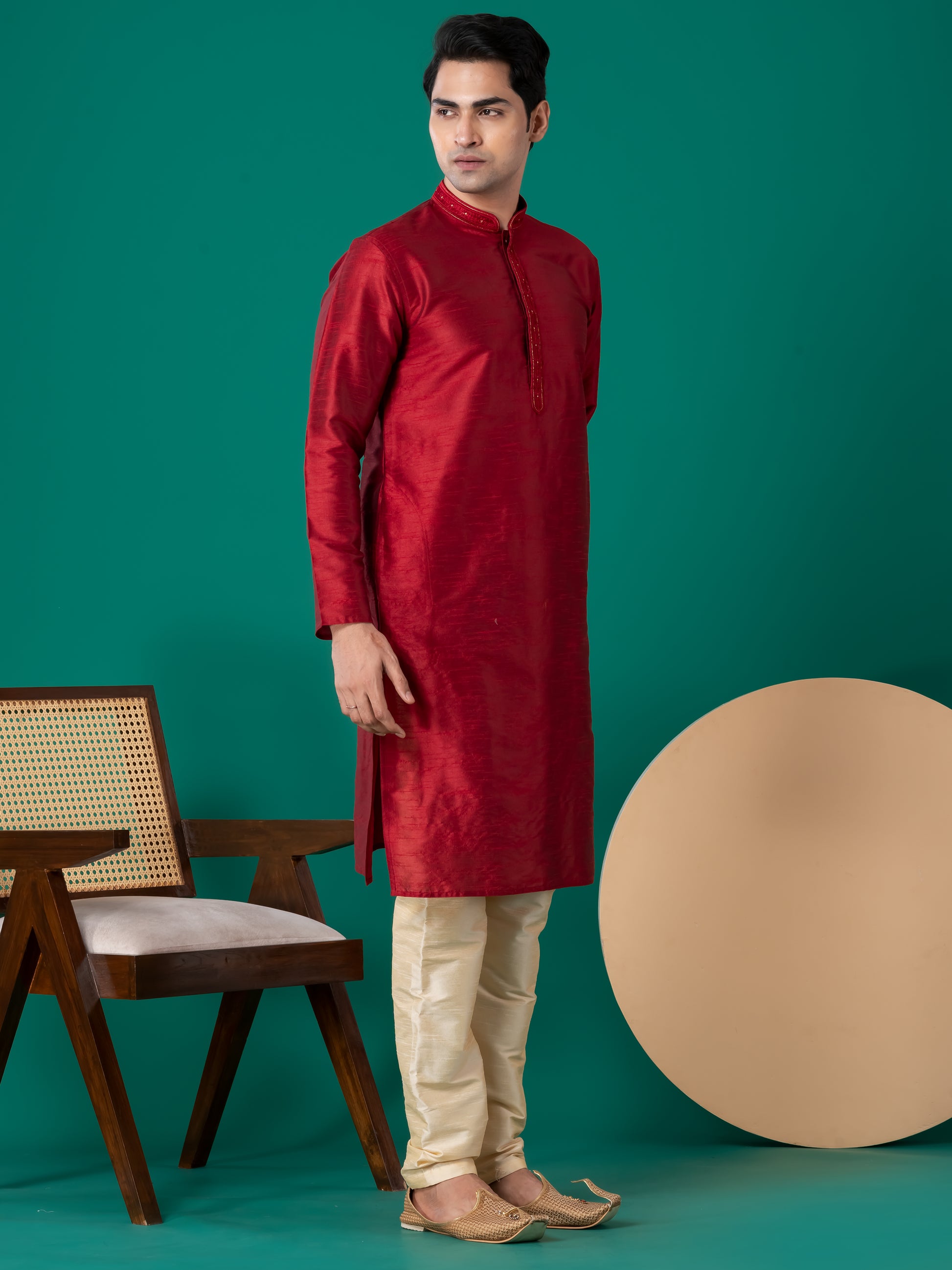 Elevate your ethnic style with this Maroon Dupion Silk Kurta and Beige pyjama set. Crafted from premium fabric, it offers a regal look with a refined finish. Perfect for festive occasions and celebrations.