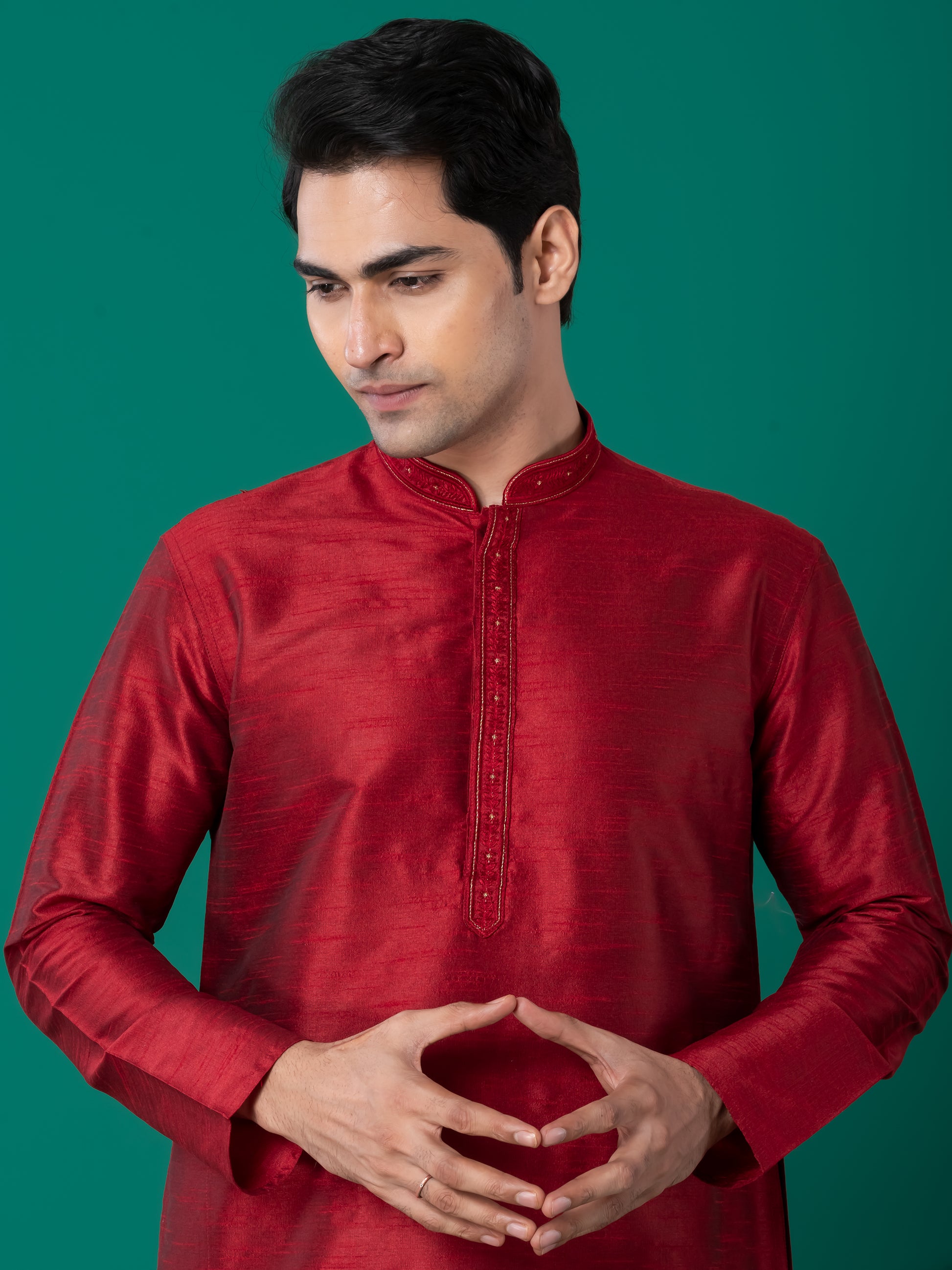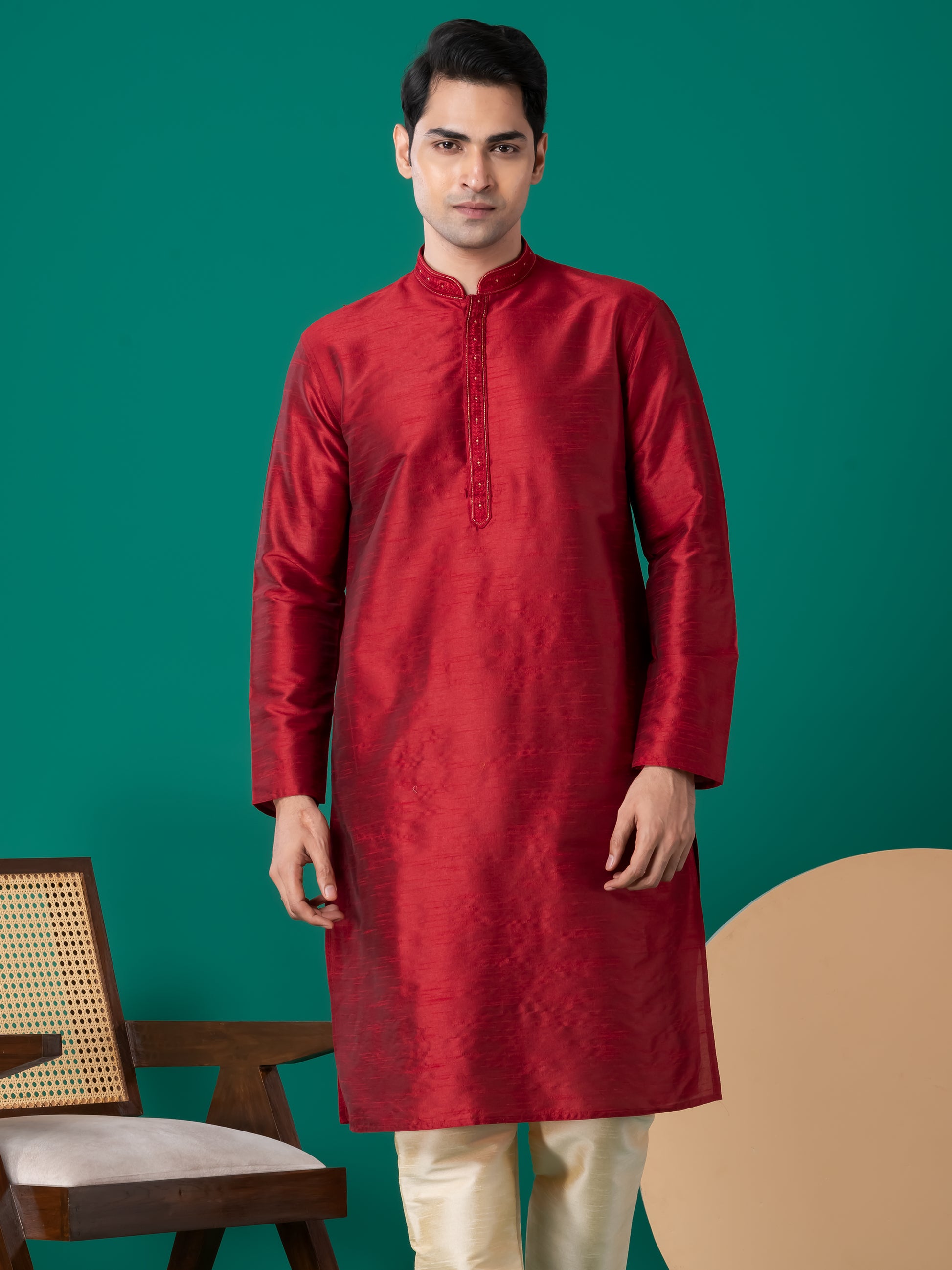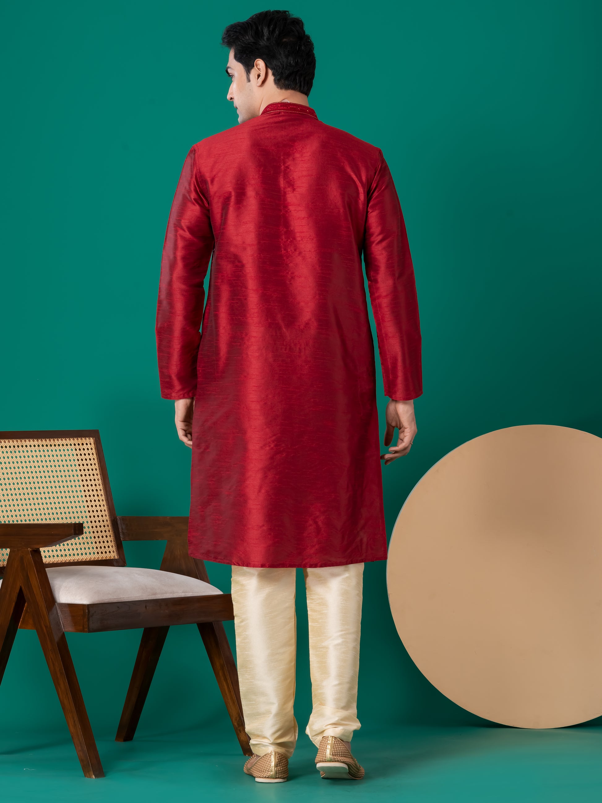 Elevate your ethnic style with this Maroon Dupion Silk Kurta and Beige pyjama set. Crafted from premium fabric, it offers a regal look with a refined finish. Perfect for festive occasions and celebrations.
