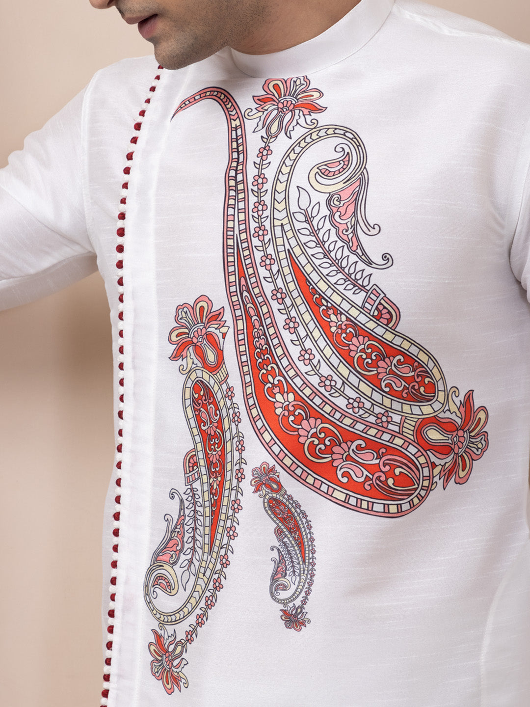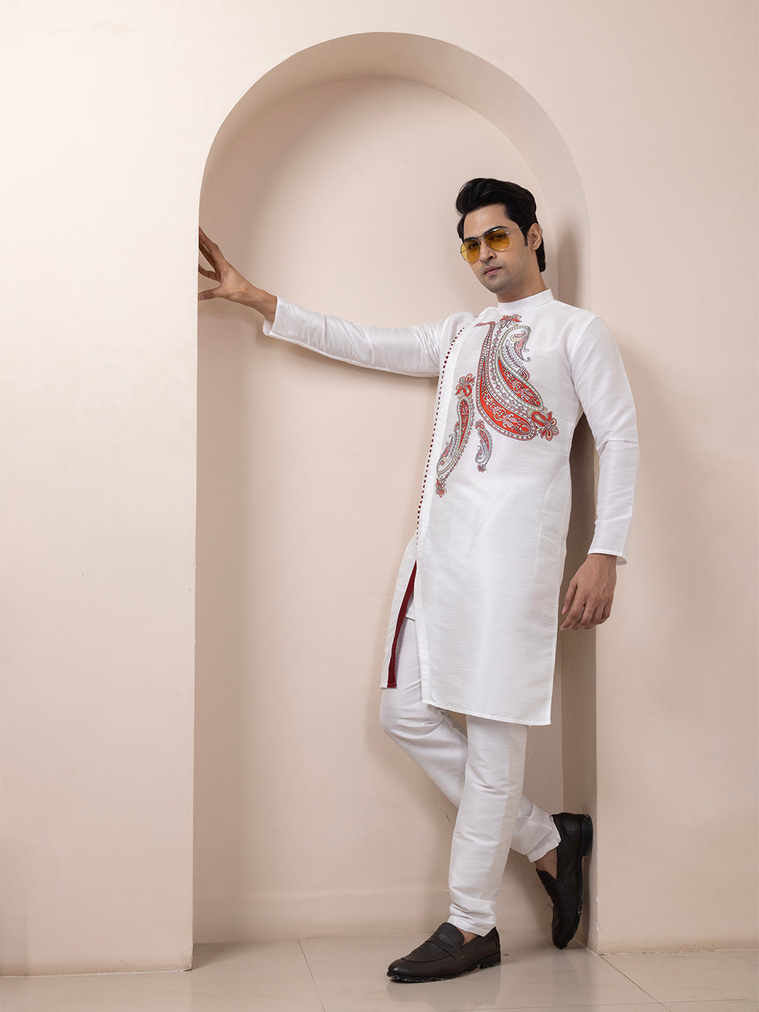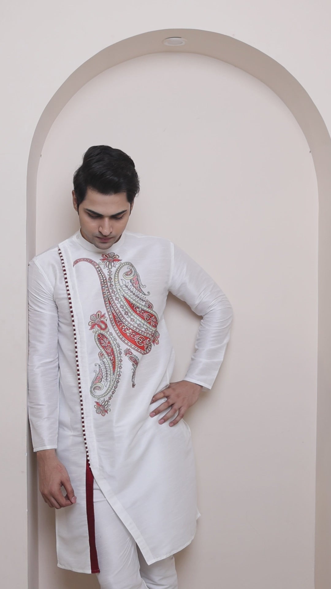 A statement-making white dupion silk kurta pyjama set adorned with an intricate printed design across the front. Crafted with fine detailing and a side placket closure, this outfit is perfect for festive occasions, weddings, and special celebrations where style meets tradition.