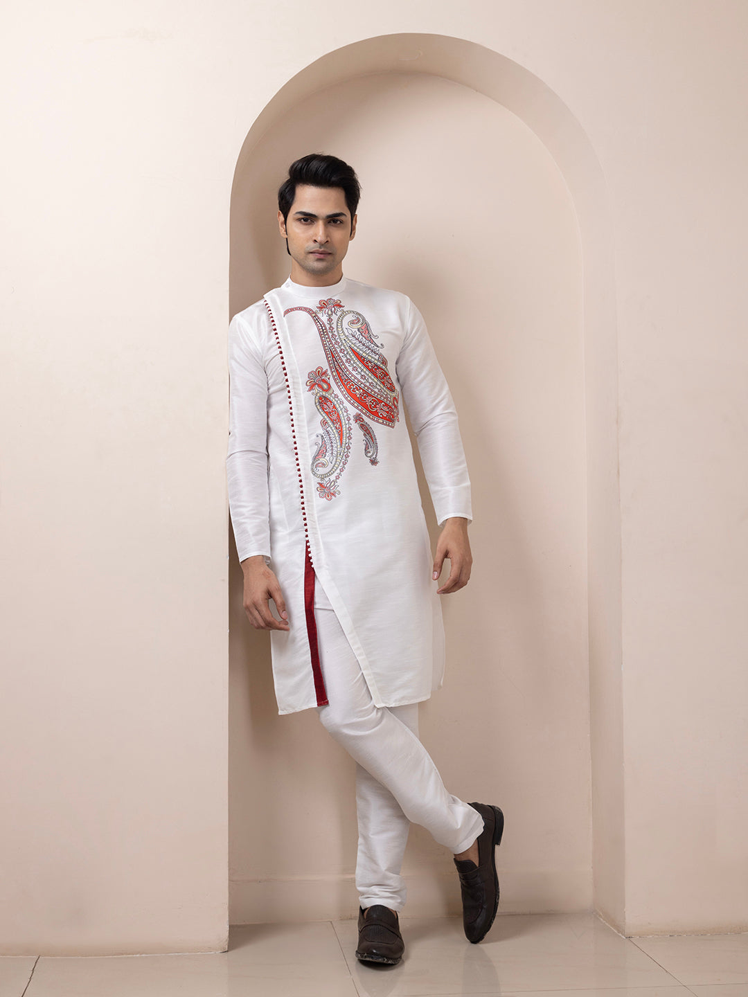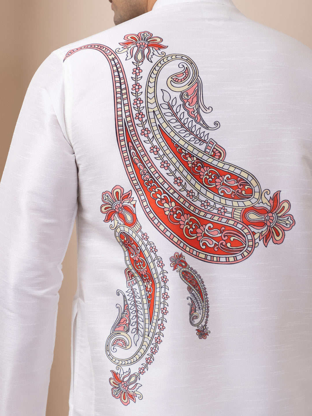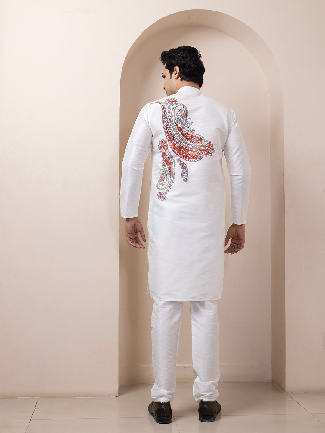 A statement-making white dupion silk kurta pyjama set adorned with an intricate printed design across the front. Crafted with fine detailing and a side placket closure, this outfit is perfect for festive occasions, weddings, and special celebrations where style meets tradition.