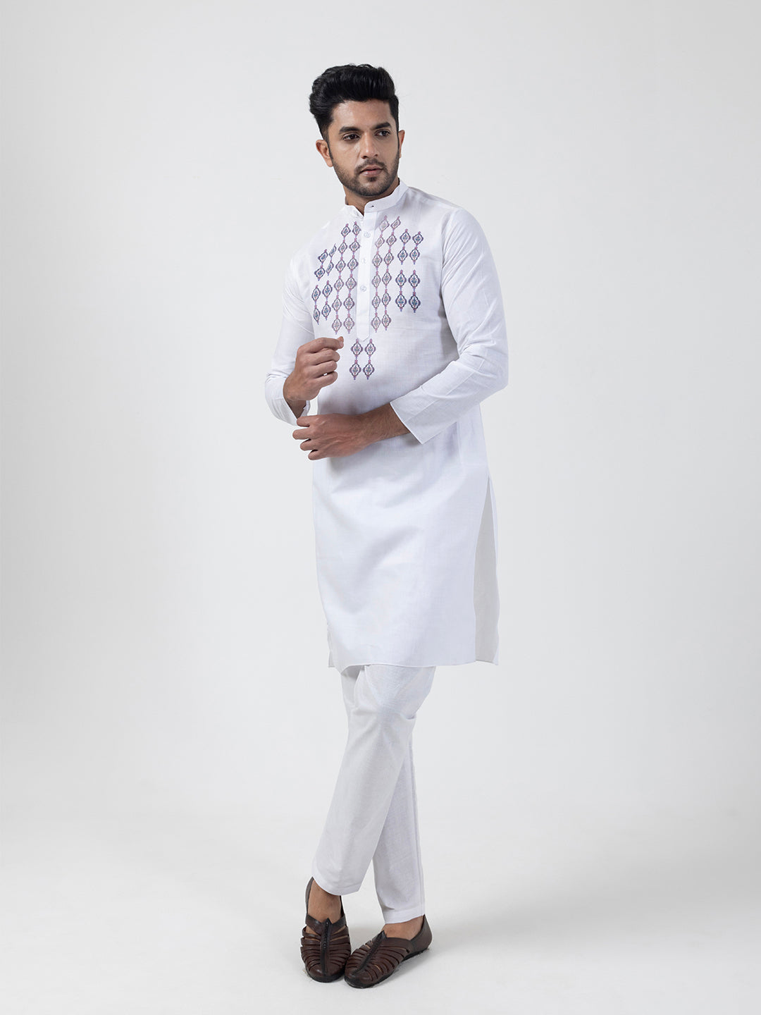 Pair this White kurta with white churidar or slim-fit trousers for a timeless ethnic look. Complete the outfit with leather loafers or traditional juttis to make a bold style statement.