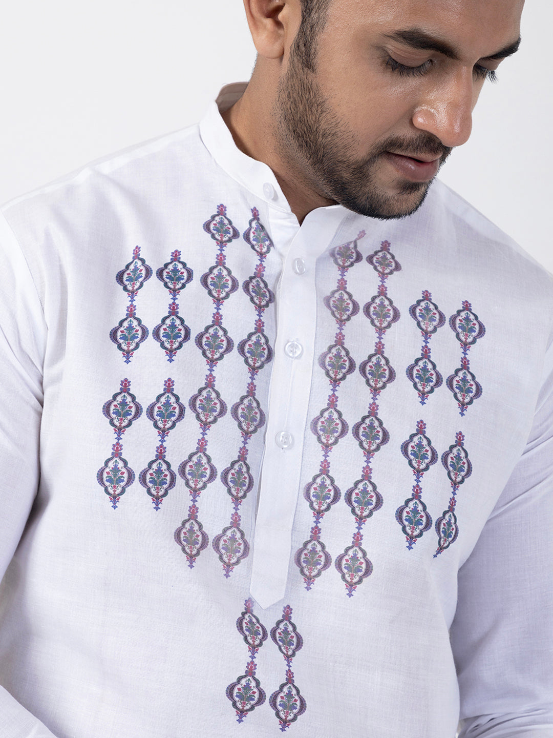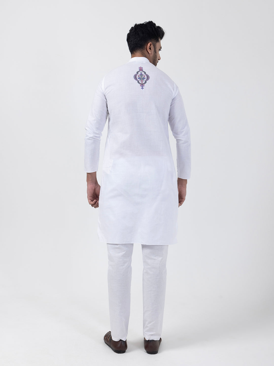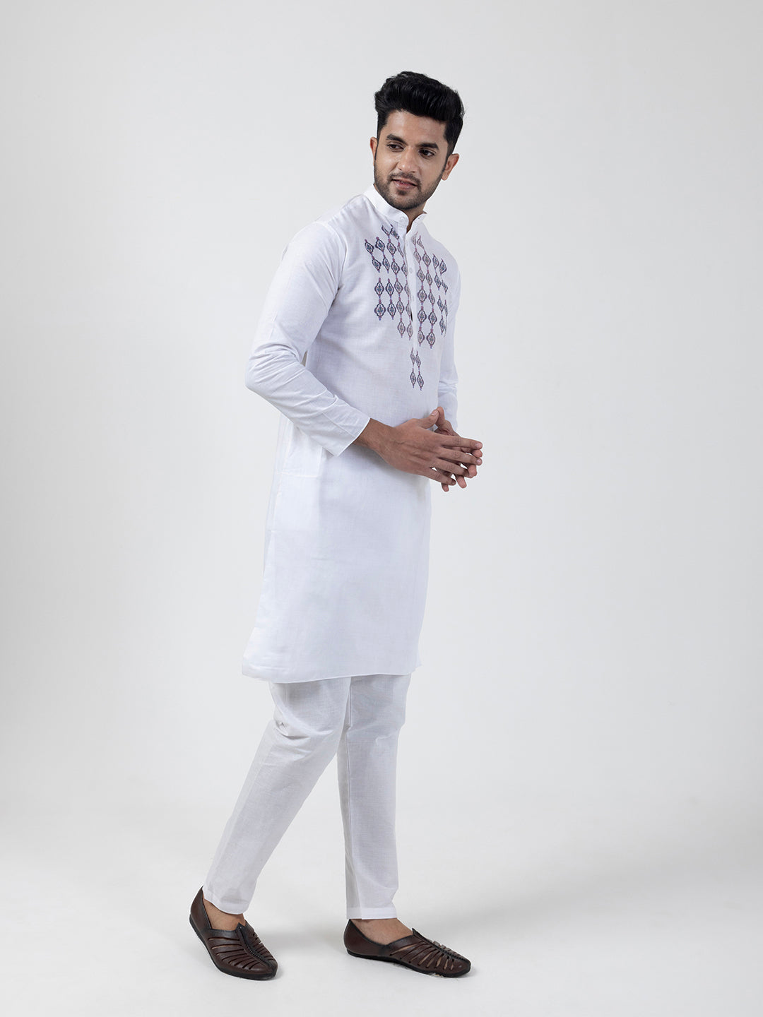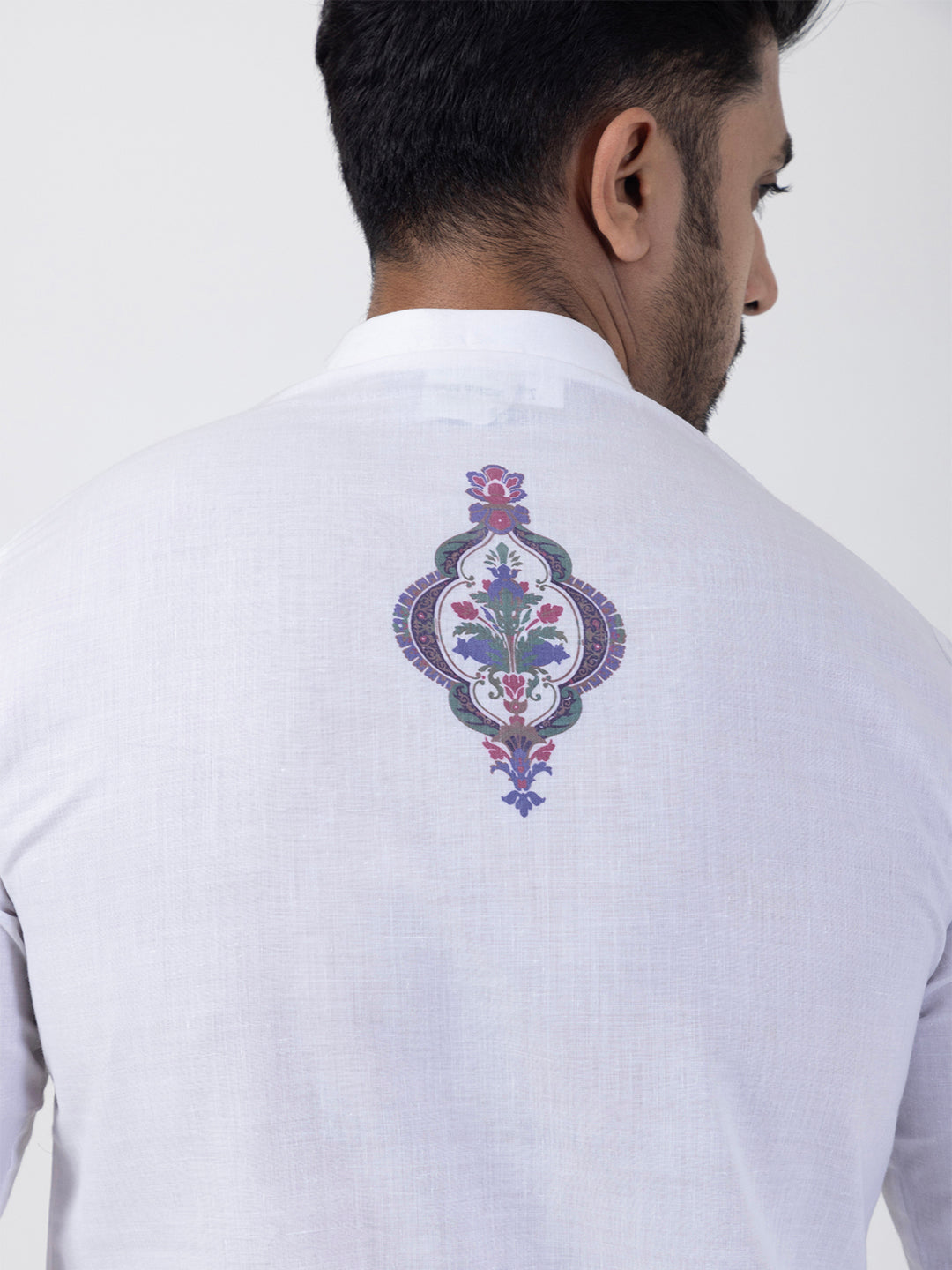 "Elevate your ethnic style with this White cotton kurta and white pyjama set. Designed for comfort and elegance, it features a subtle print and a mandarin collar, perfect for festive and cultural occasions."