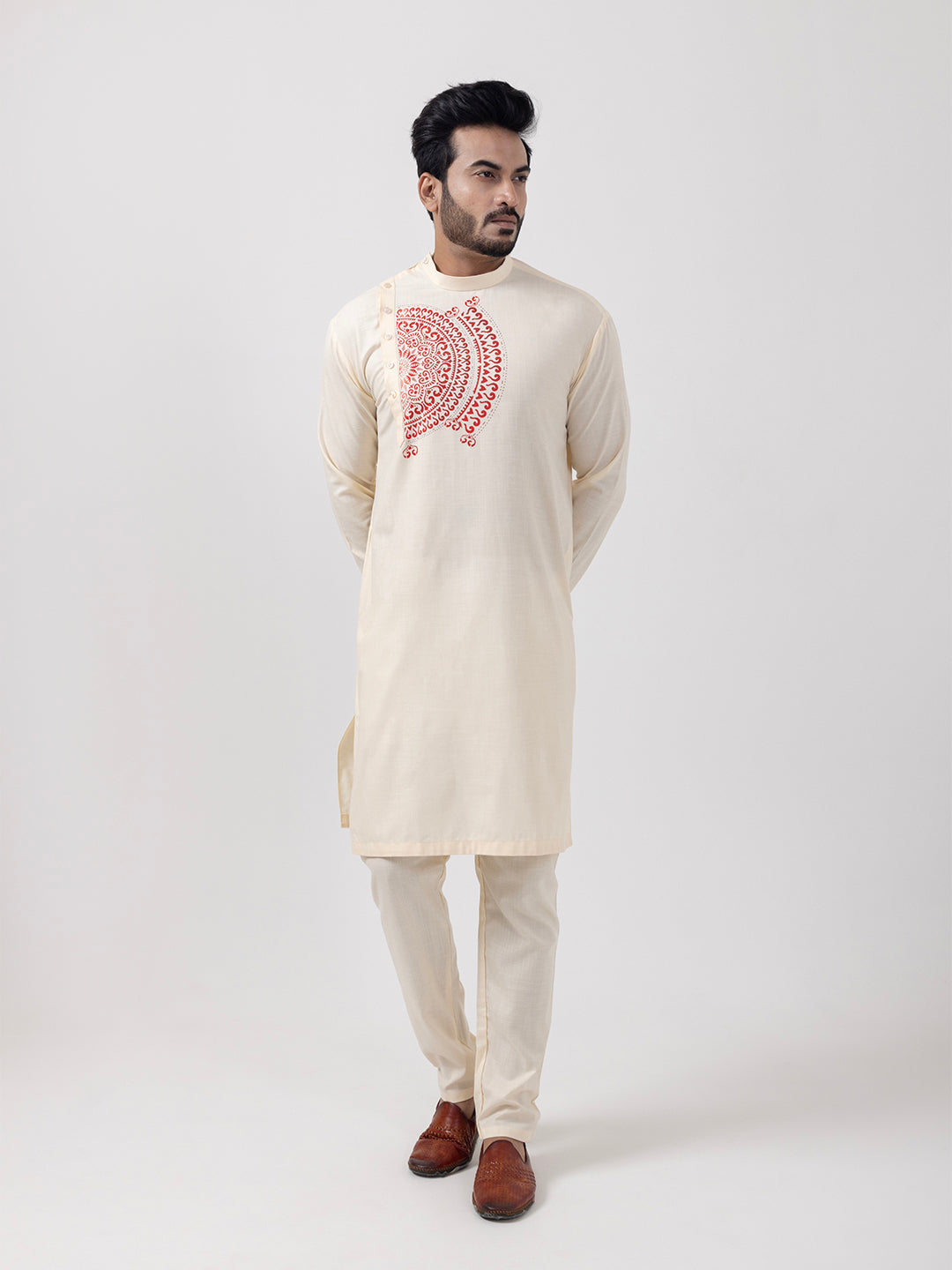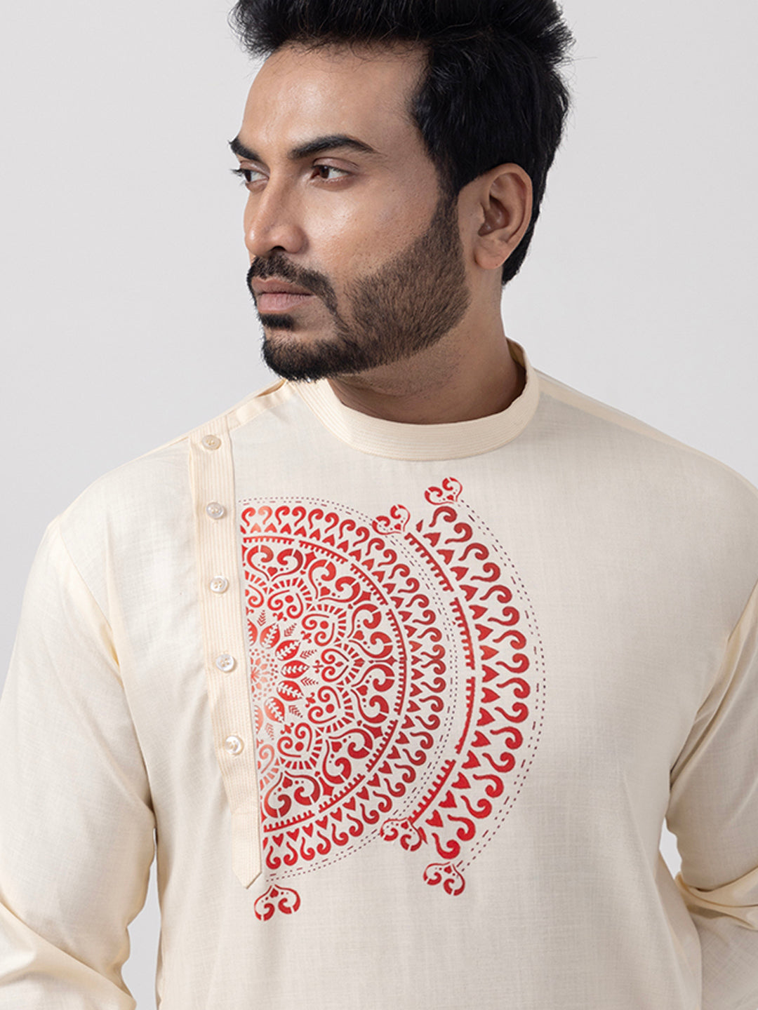 Exude elegance and tradition with this Beige Cotton Kurta With Pyjama Set, featuring an exquisite ethnic motif print that enhances its regal appeal. Designed for comfort and style, this kurta is perfect for festive occasions, weddings, and cultural celebrations.