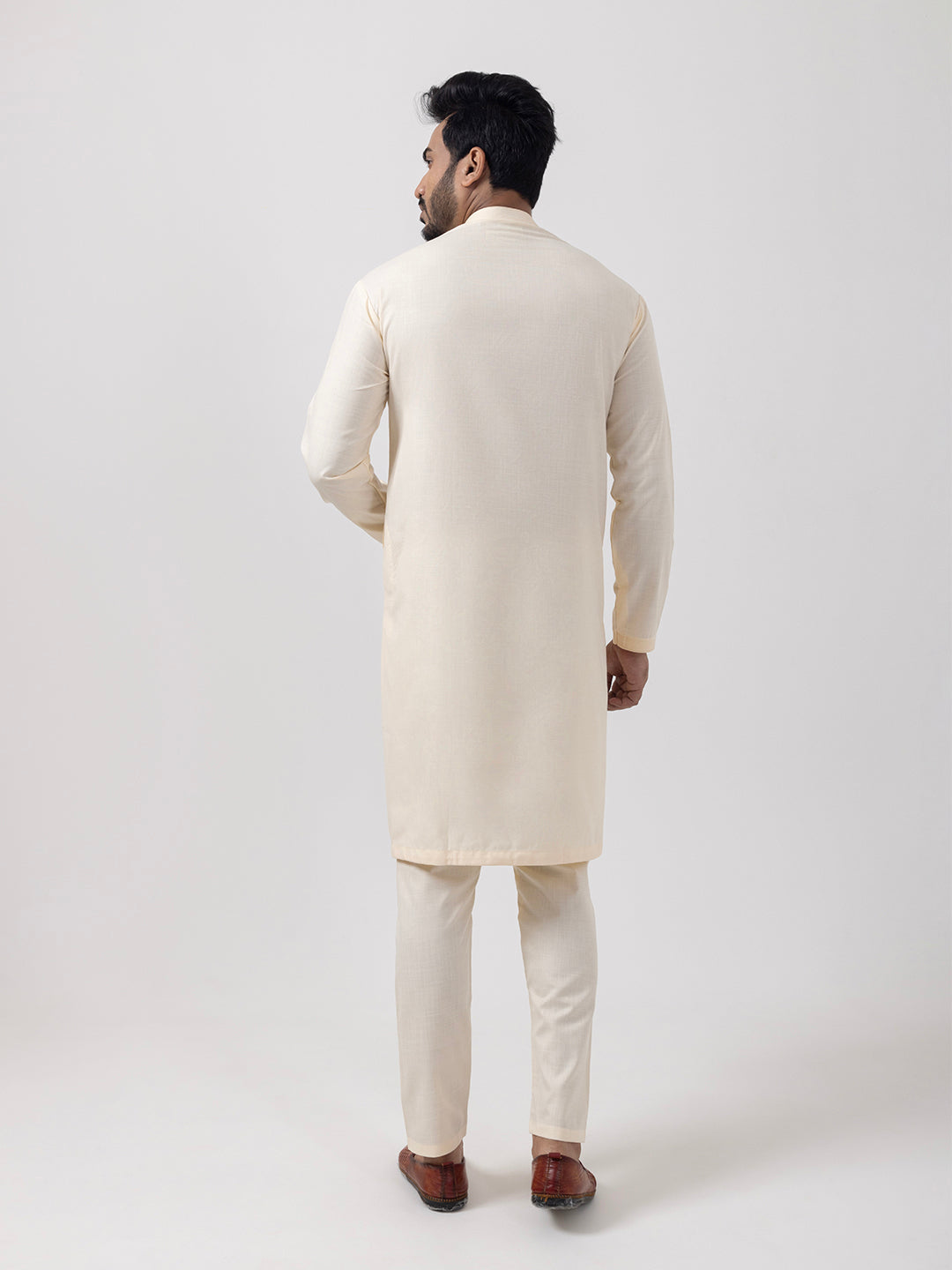 Pair this Beige Cotton Kurta with a contrasting churidar or straight-fit pyjama to achieve a refined ethnic look. Complete the outfit with classic mojaris or leather sandals.