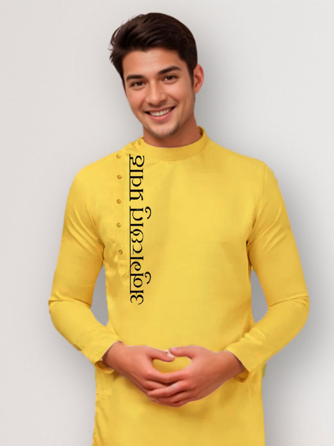 Pair this Yellow Cotton Kurta with a contrasting churidar or straight-fit pyjama to achieve a refined ethnic look. Complete the outfit with classic mojaris or leather sandals.