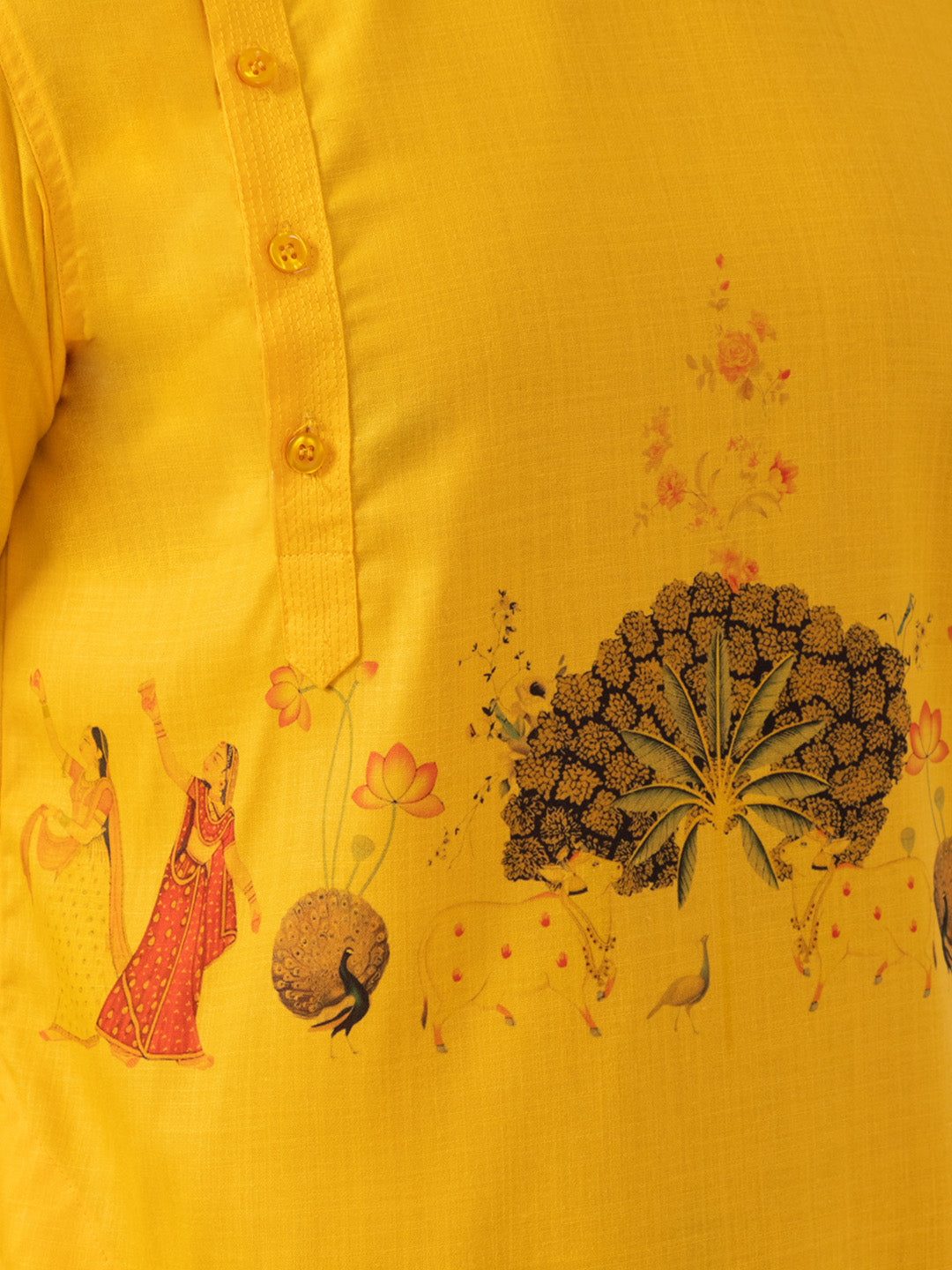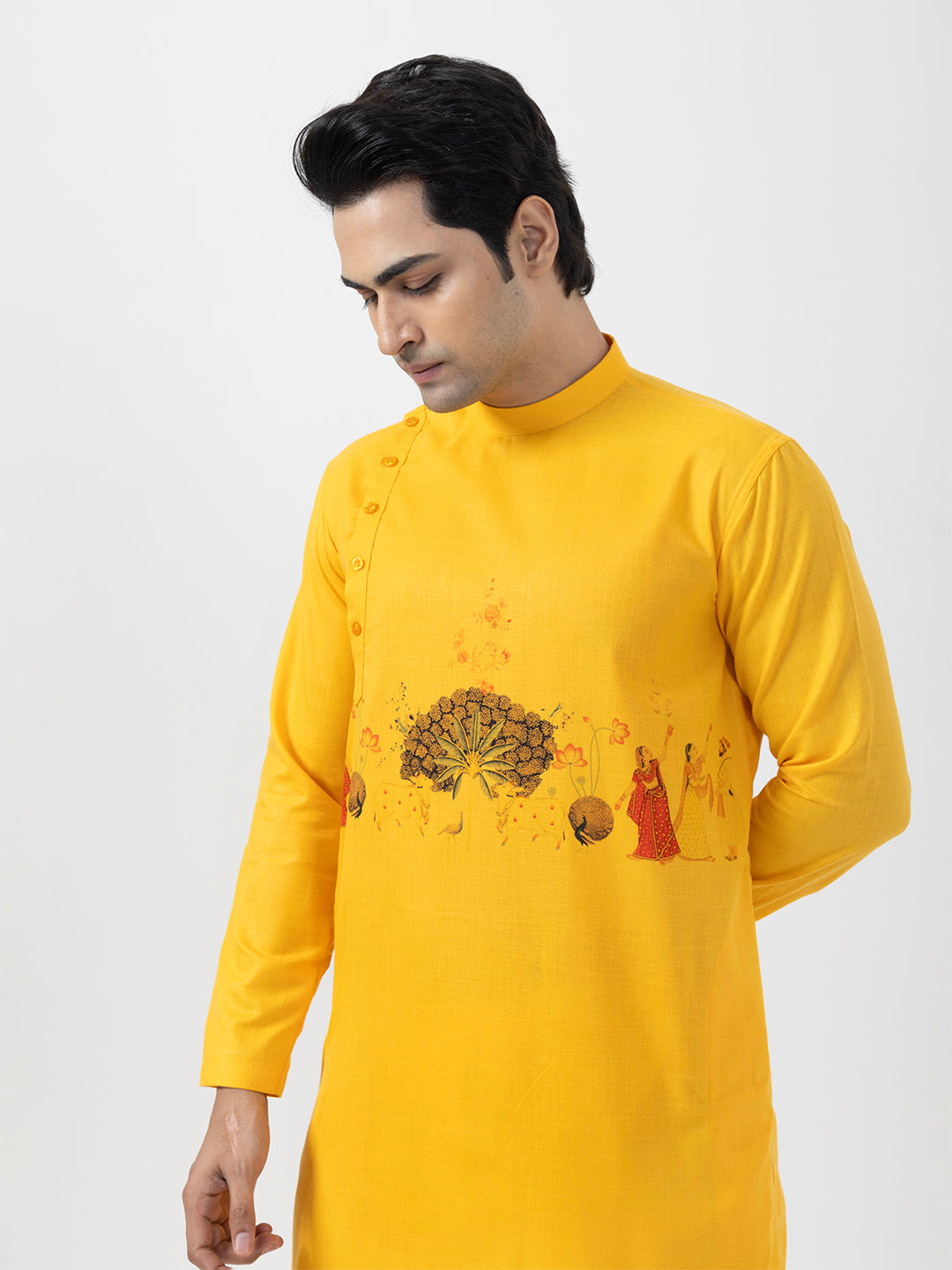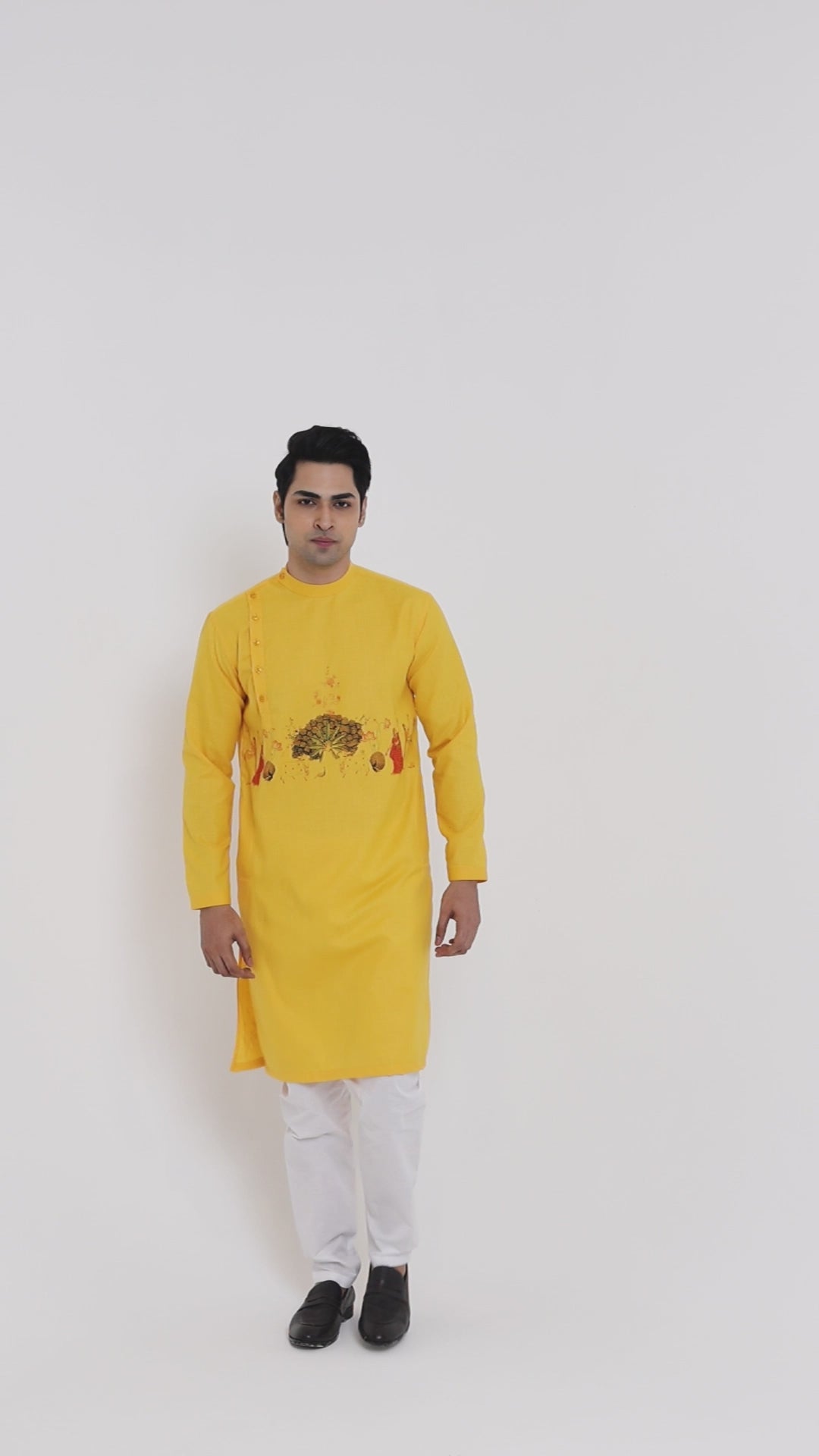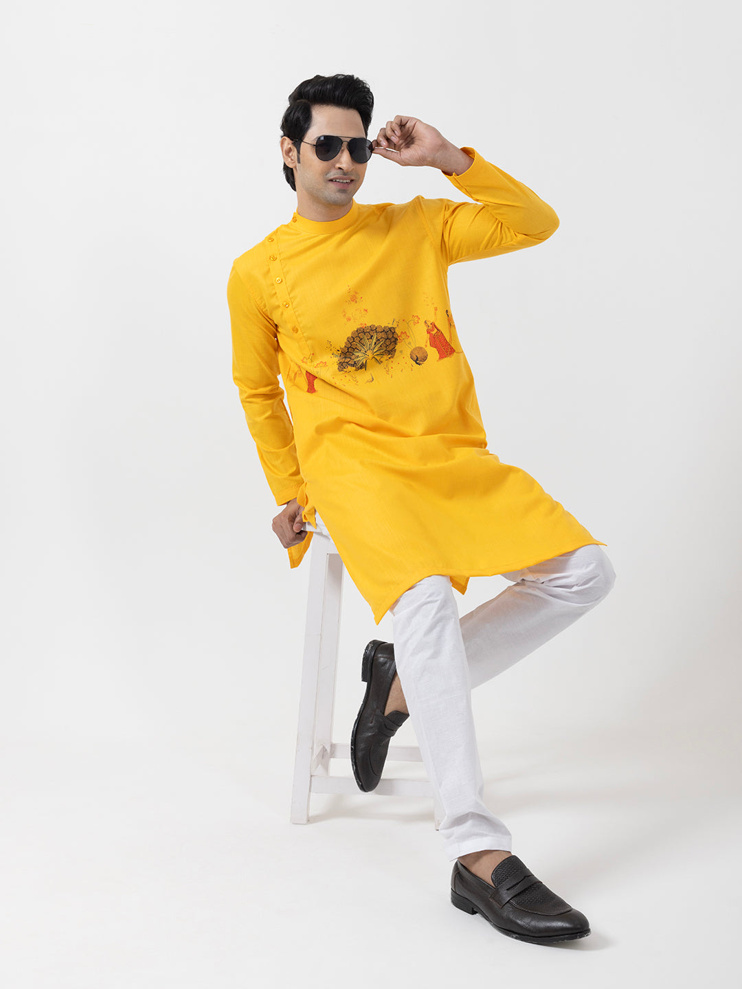 Pair this Yellow Cotton Kurta with a contrasting churidar or straight-fit pyjama to achieve a refined ethnic look. Complete the outfit with classic mojaris or leather sandals.
