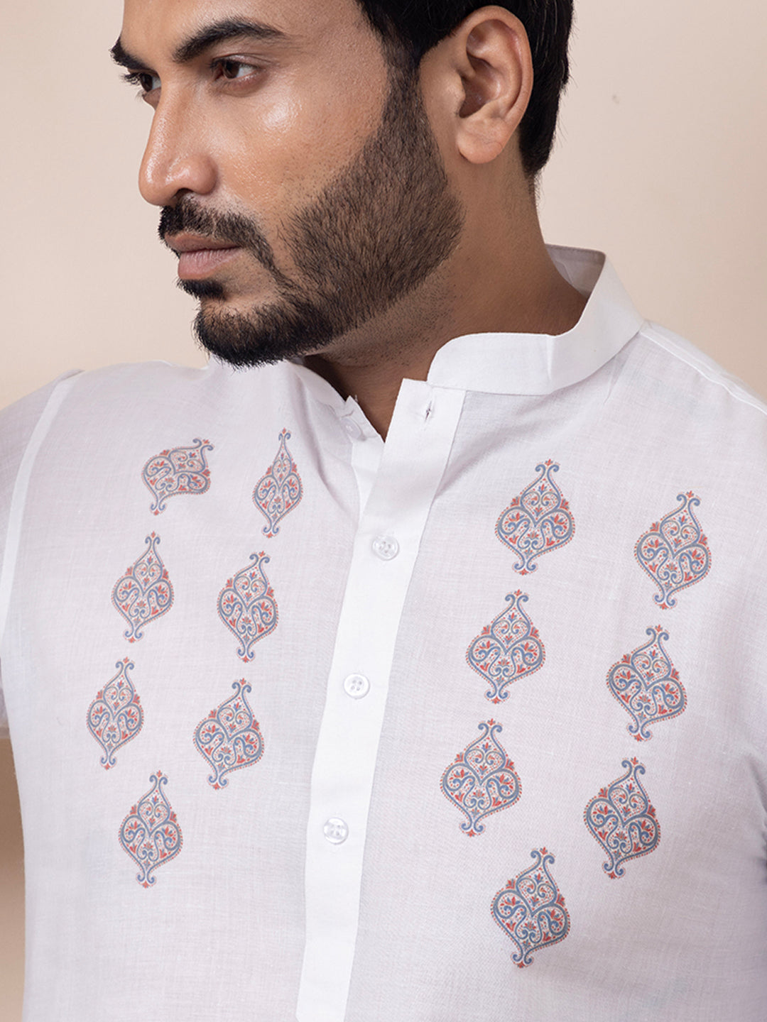 "Elevate your ethnic style with this White cotton kurta and white pyjama set. Designed for comfort and elegance, it features a subtle print and a mandarin collar, perfect for festive and cultural occasions."