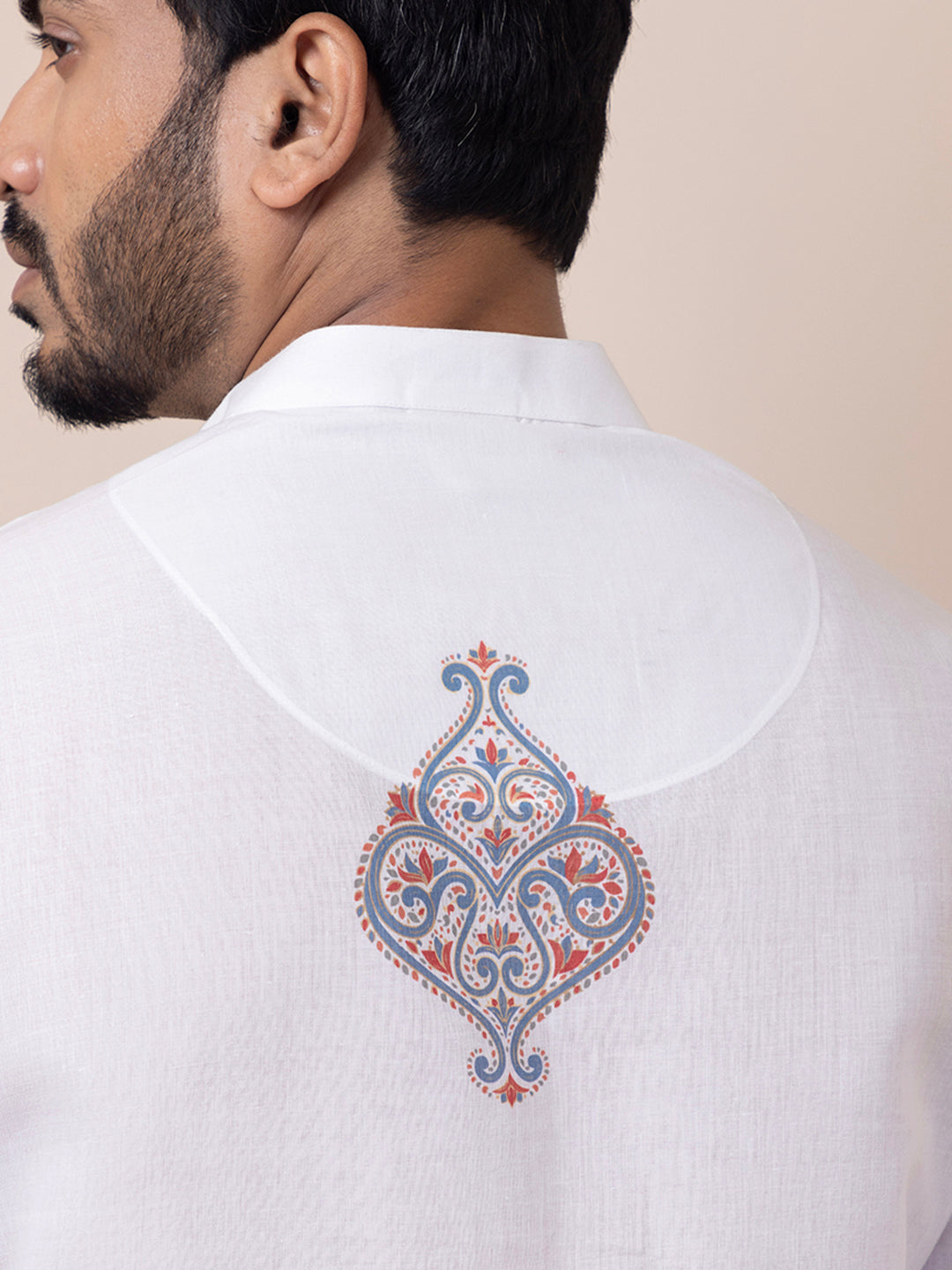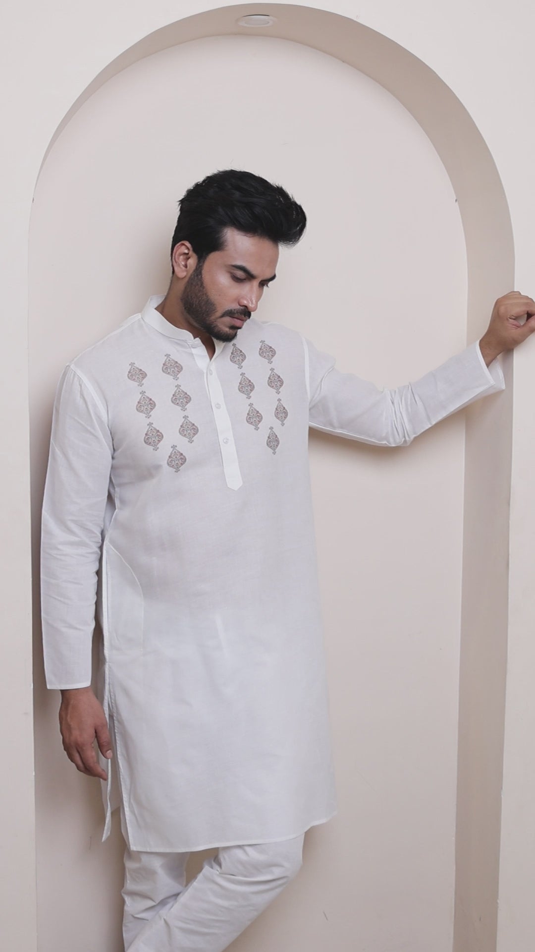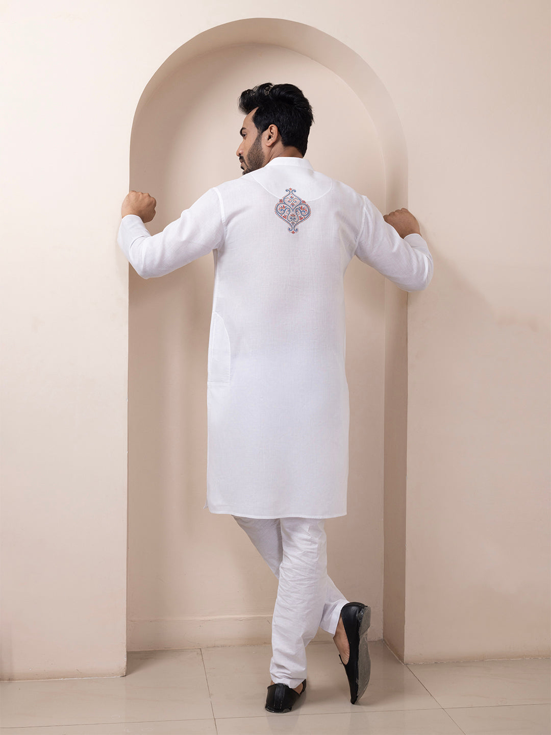 Pair this White kurta with white churidar or slim-fit trousers for a timeless ethnic look. Complete the outfit with leather loafers or traditional juttis to make a bold style statement.