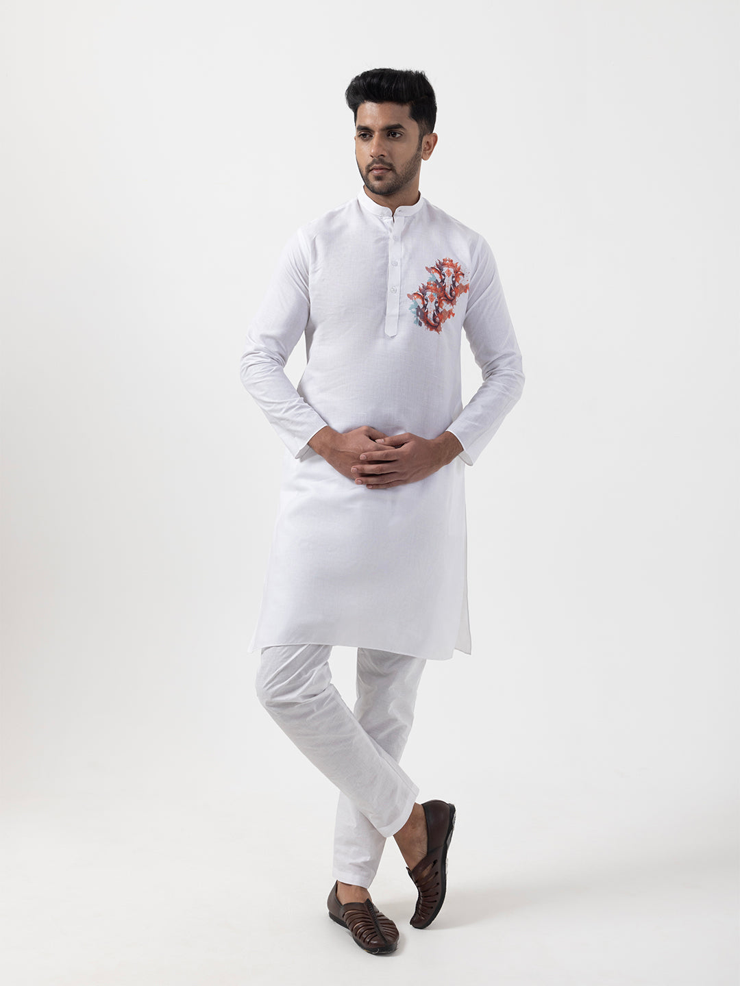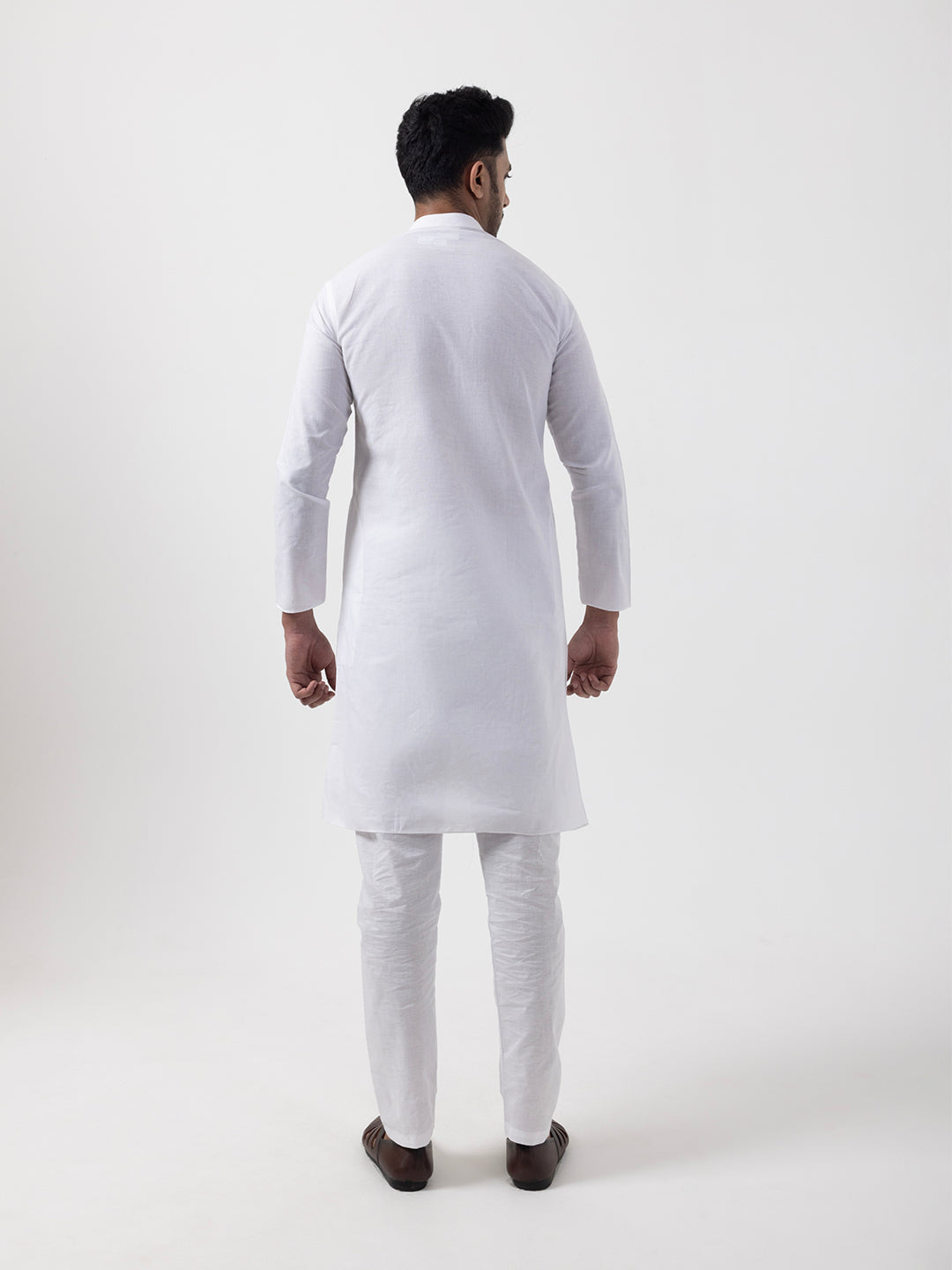 Pair this White kurta with white churidar or slim-fit trousers for a timeless ethnic look. Complete the outfit with leather loafers or traditional juttis to make a bold style statement.