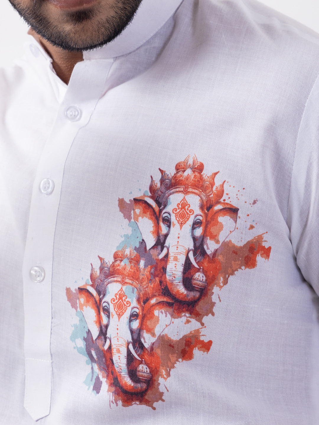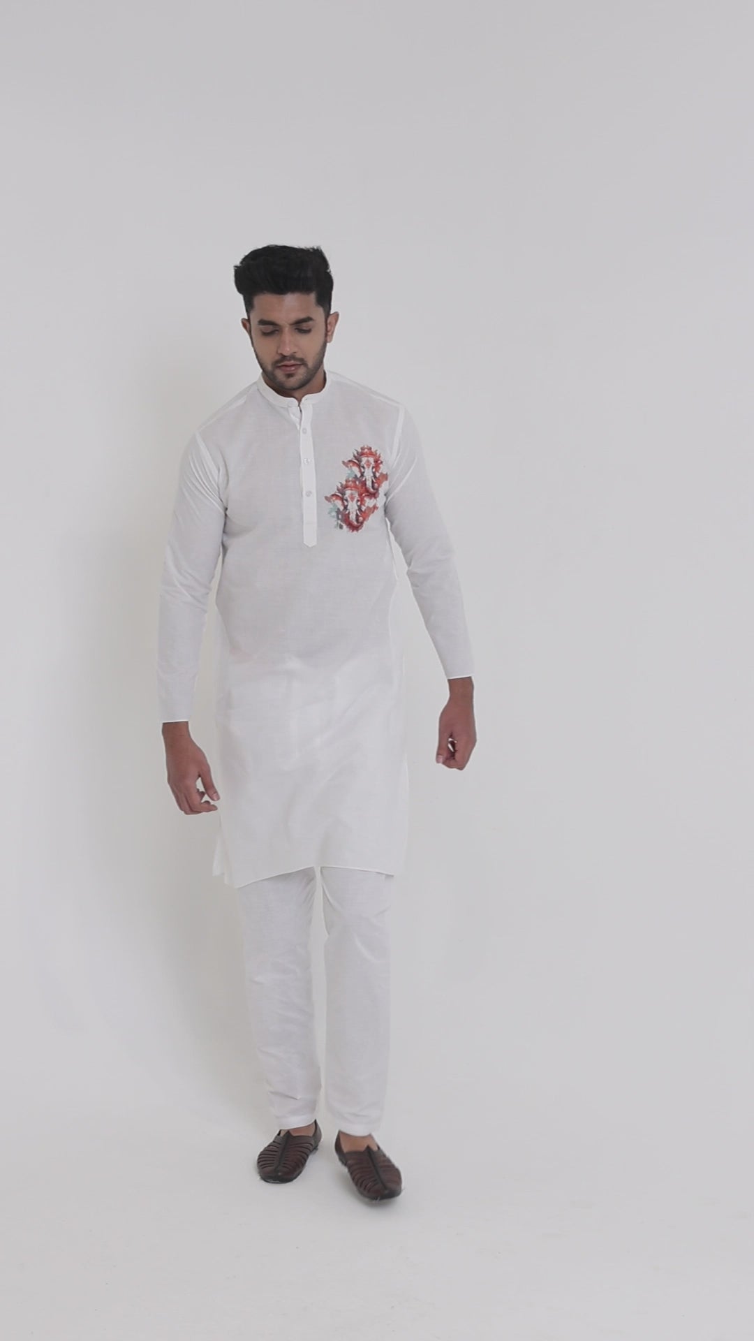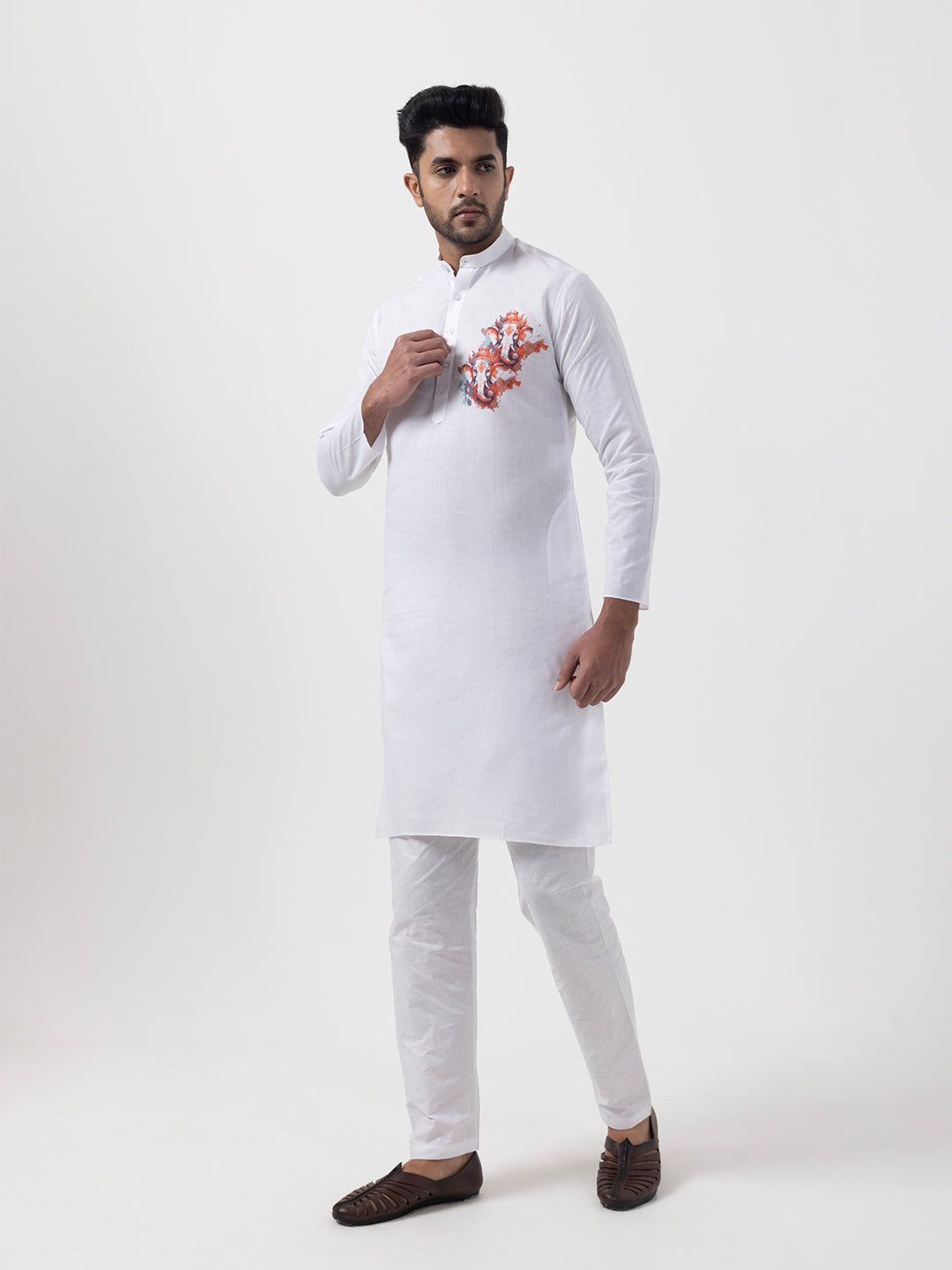 "Elevate your ethnic style with this White cotton kurta and white pyjama set. Designed for comfort and elegance, it features a subtle print and a mandarin collar, perfect for festive and cultural occasions."