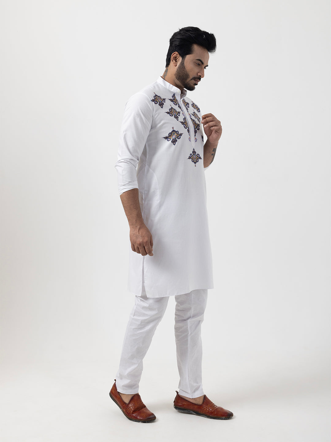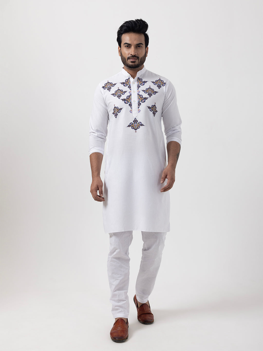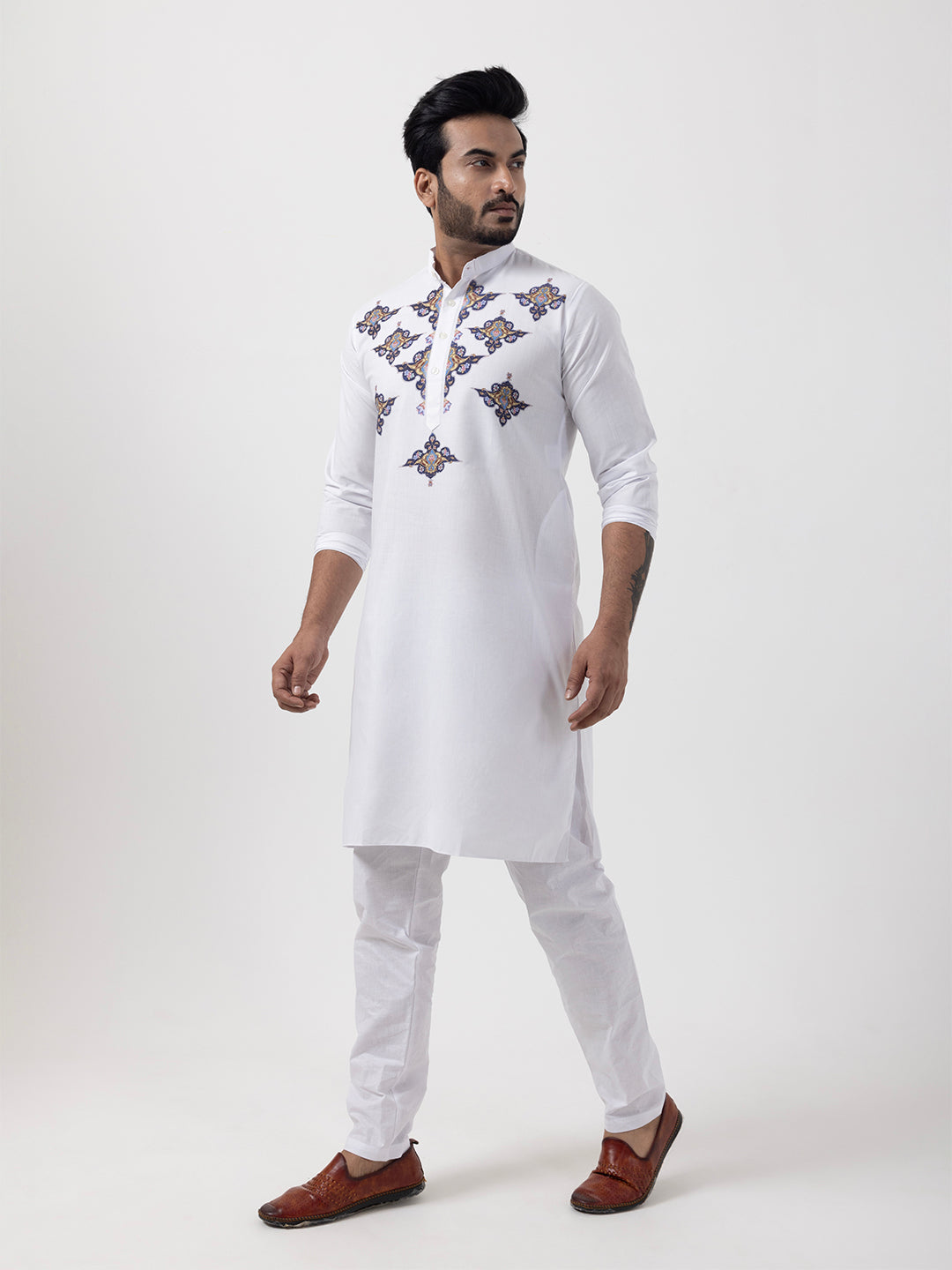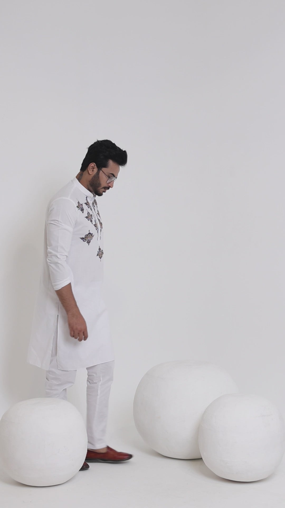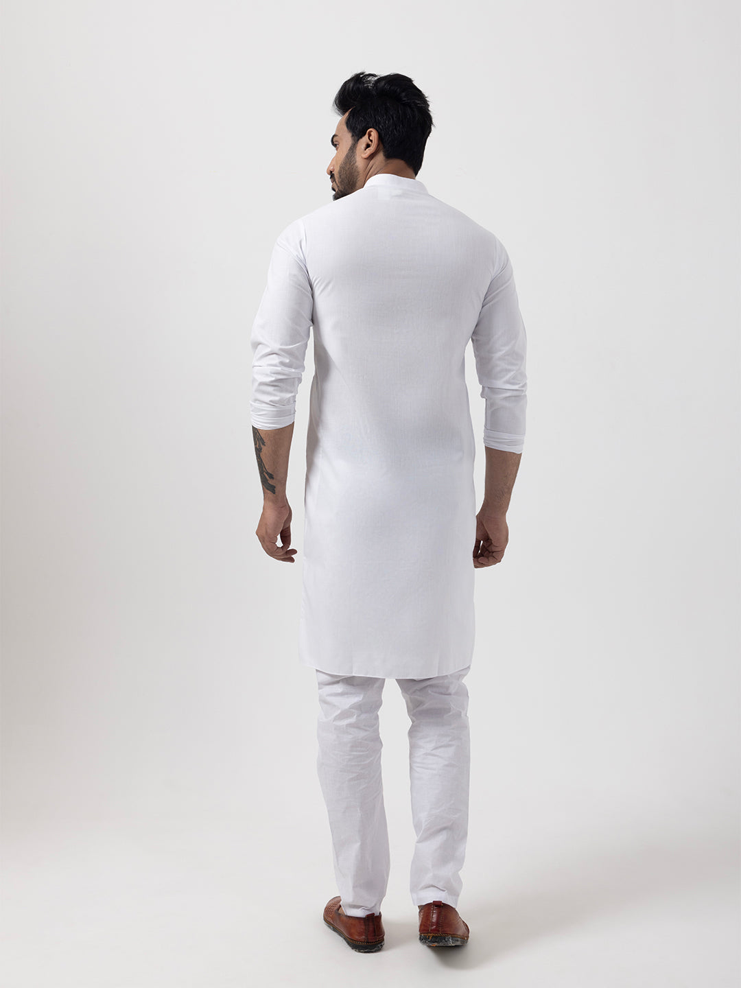 Pair this White kurta with white churidar or slim-fit trousers for a timeless ethnic look. Complete the outfit with leather loafers or traditional juttis to make a bold style statement.