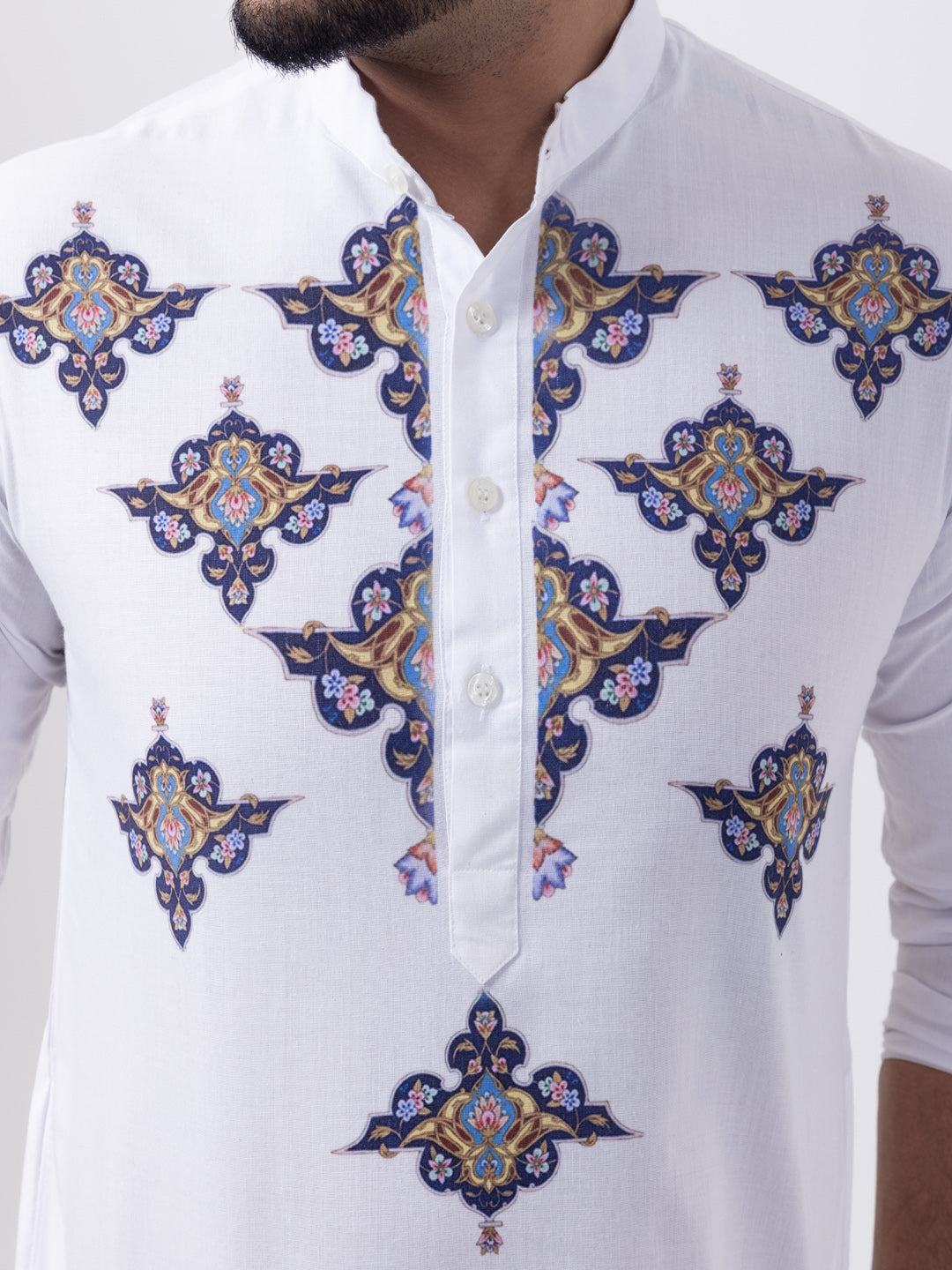 "Elevate your ethnic style with this White cotton kurta and white pyjama set. Designed for comfort and elegance, it features a subtle print and a mandarin collar, perfect for festive and cultural occasions."
