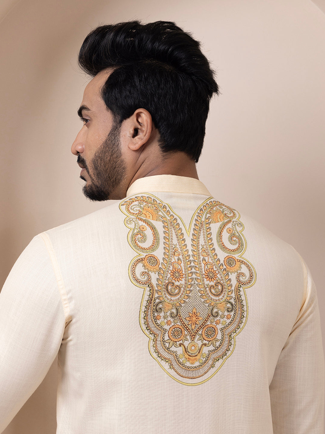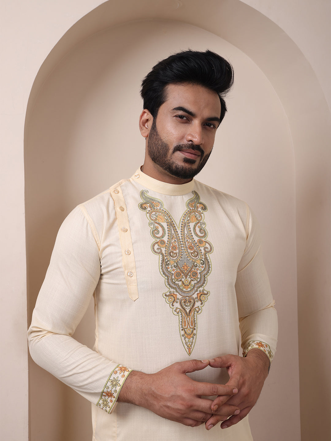 Pair this Beige Cotton Kurta with a contrasting churidar or straight-fit pyjama to achieve a refined ethnic look. Complete the outfit with classic mojaris or leather sandals.