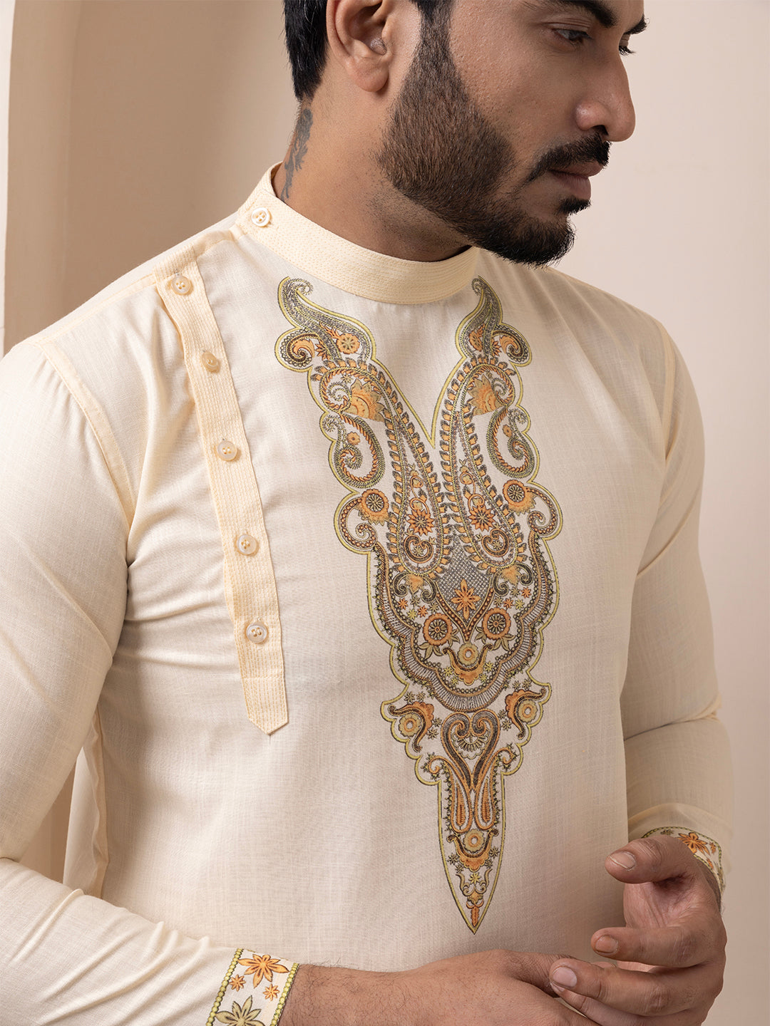 Exude elegance and tradition with this Beige Cotton Kurta With Pyjama Set, featuring an exquisite ethnic motif print that enhances its regal appeal. Designed for comfort and style, this kurta is perfect for festive occasions, weddings, and cultural celebrations.
