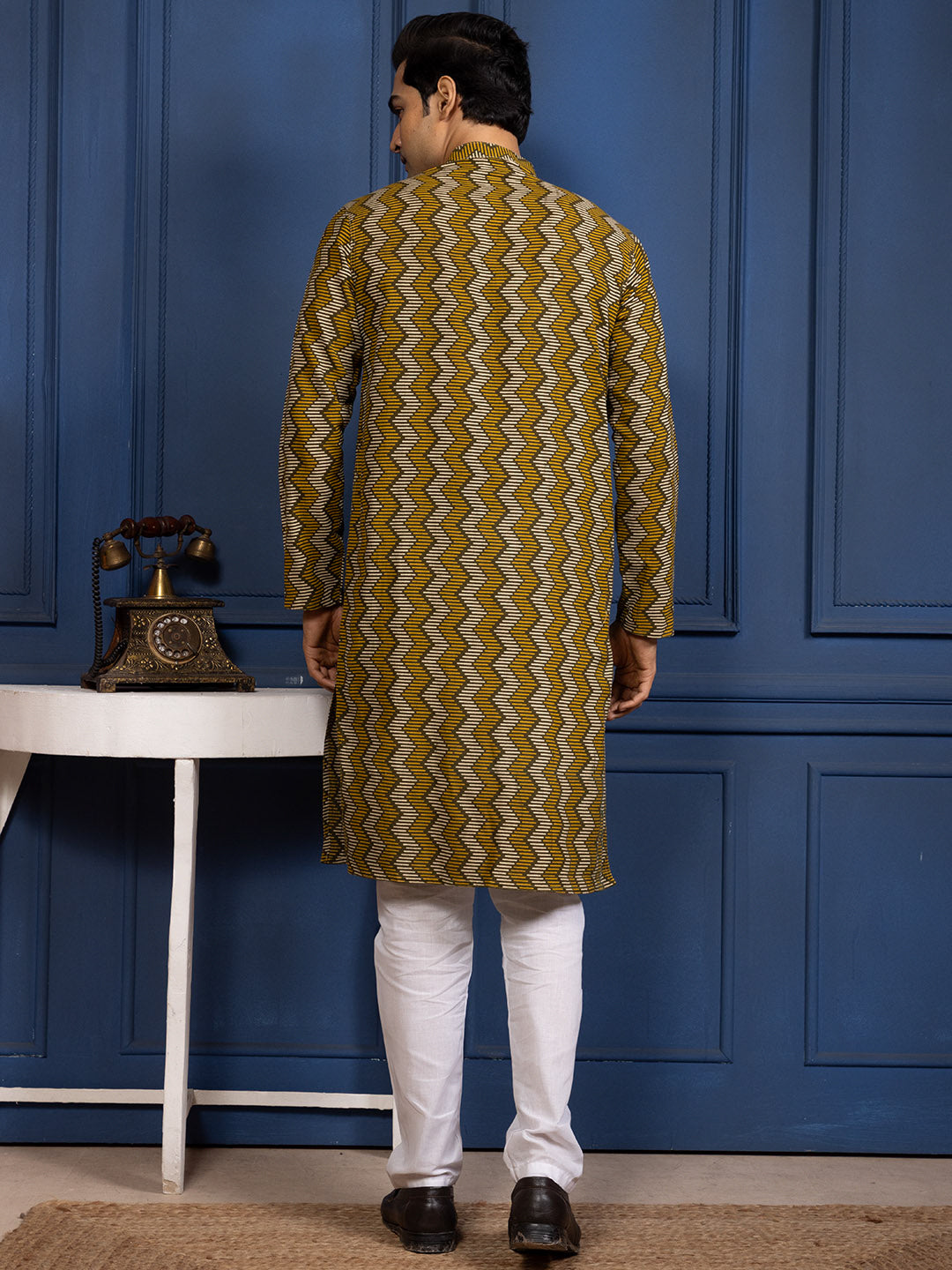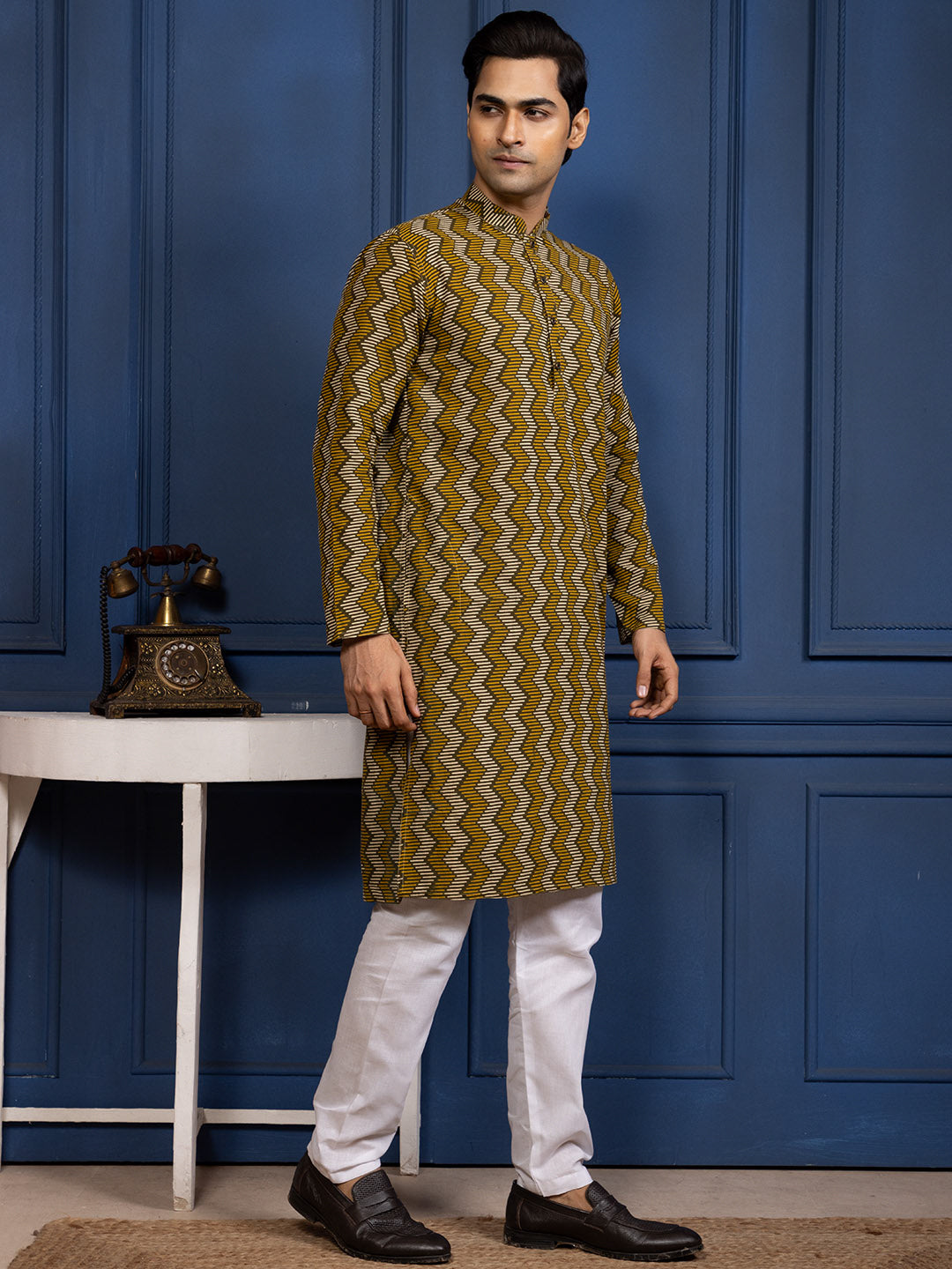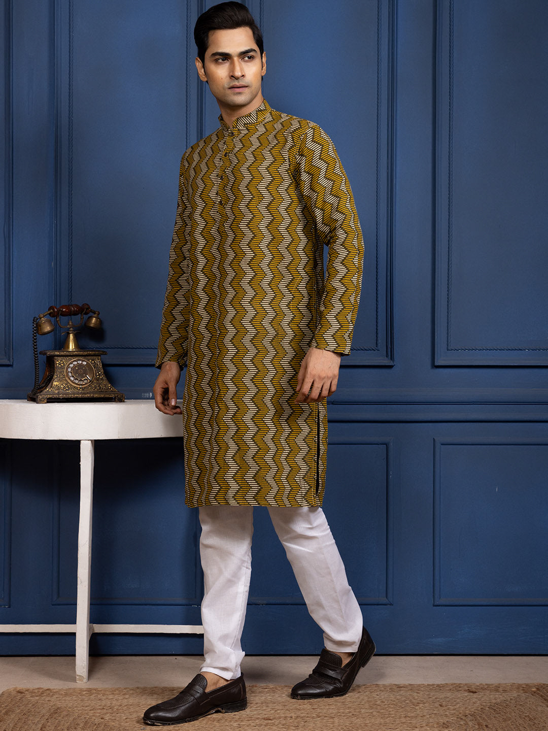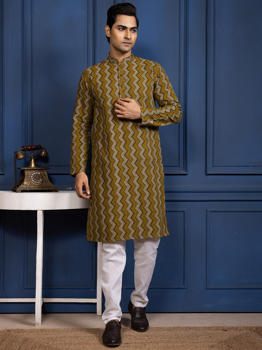 A bold zigzag pattern makes this kurta a perfect pick for men who like to keep their festive-casual look classy yet vibrant .