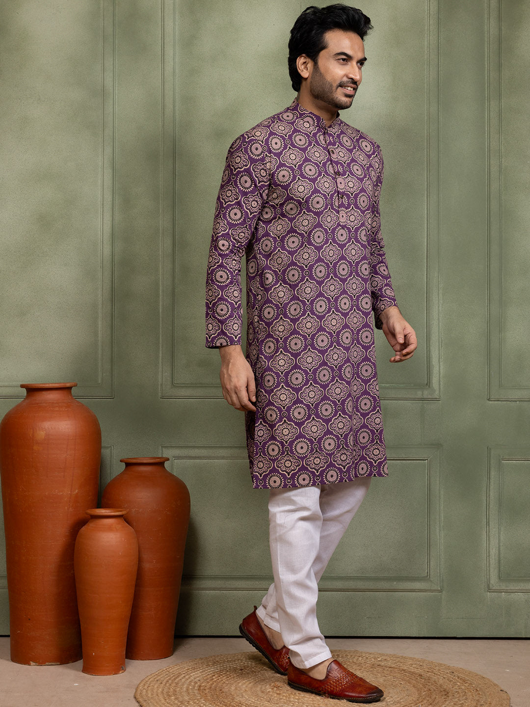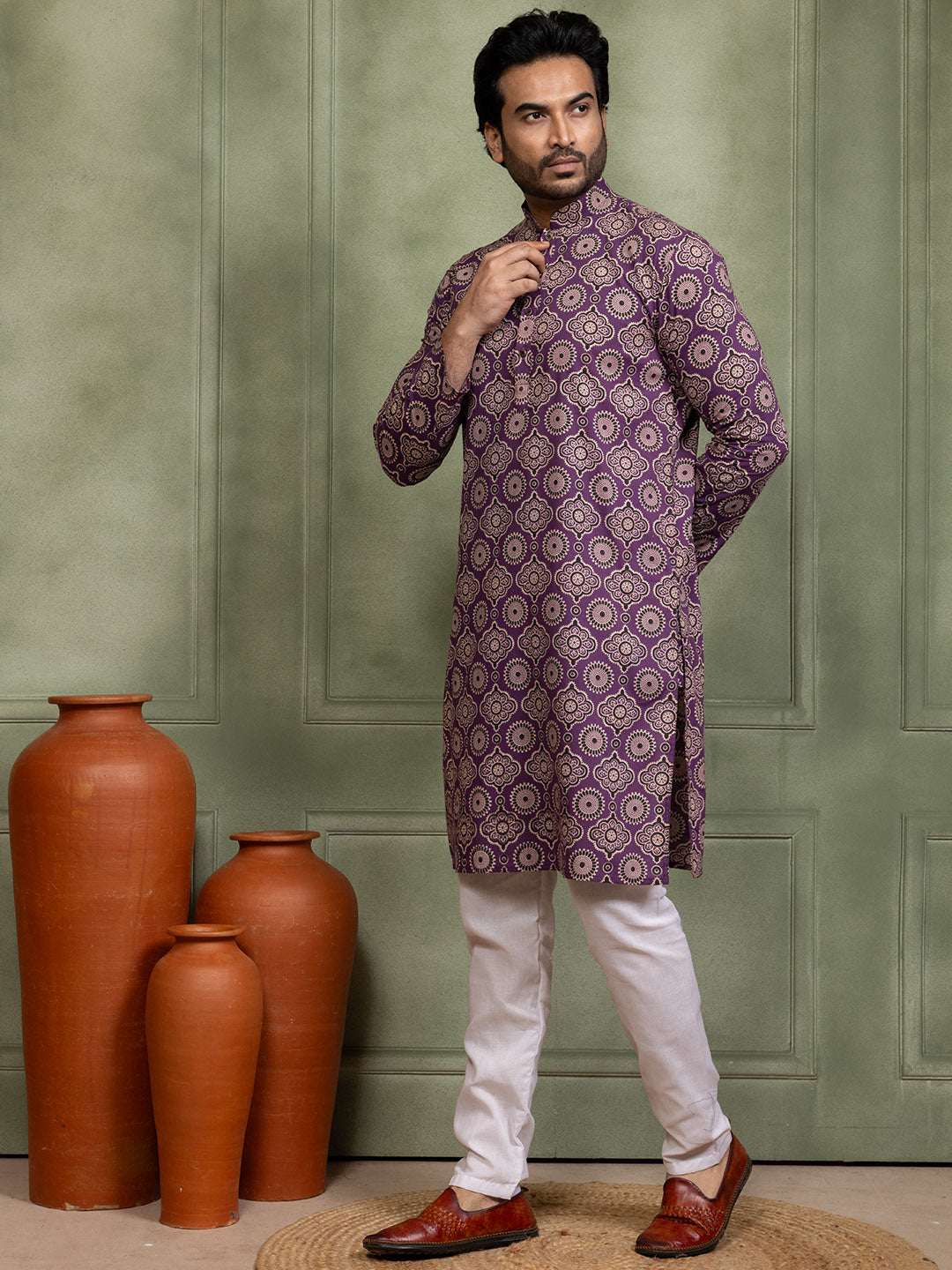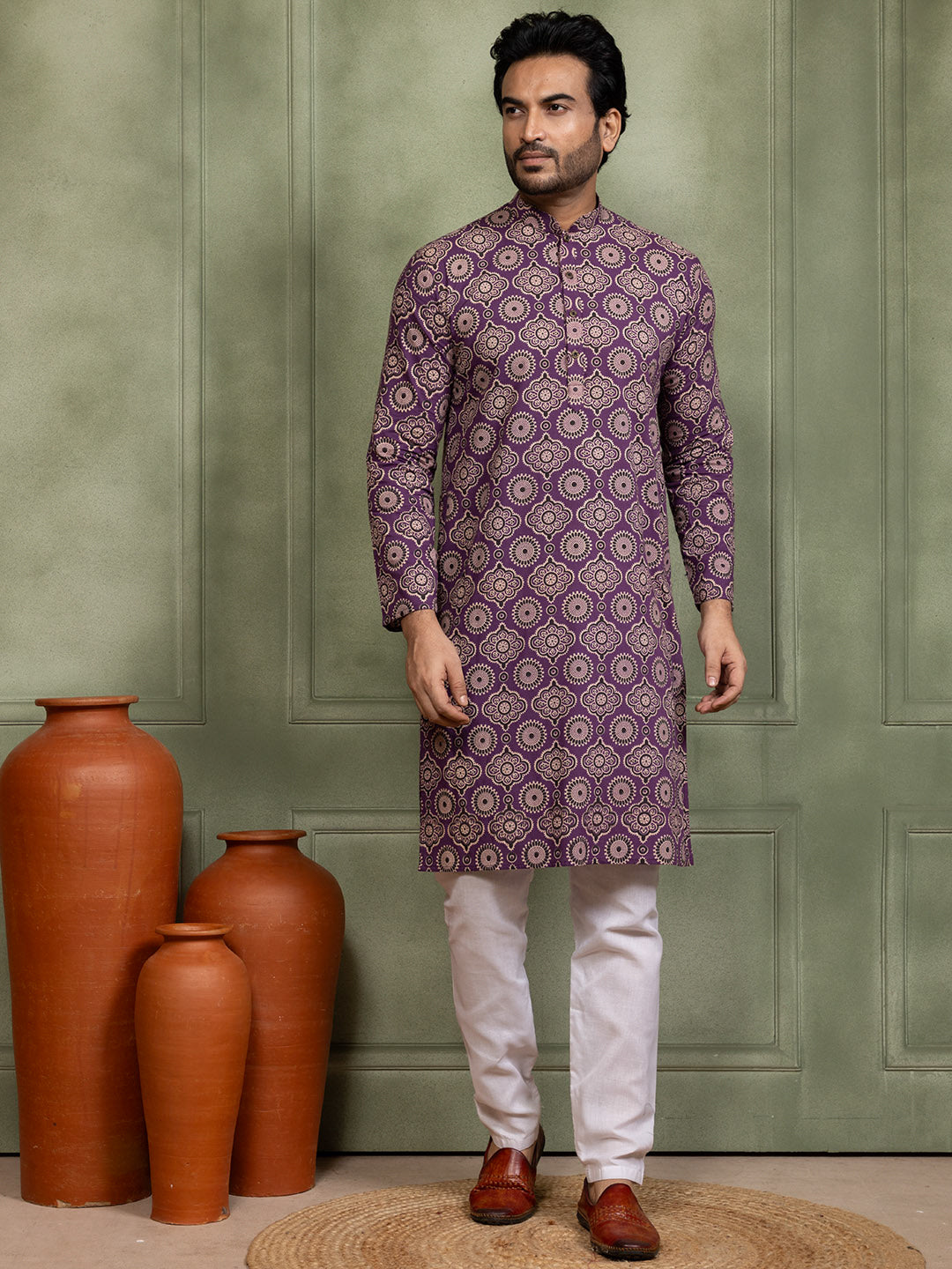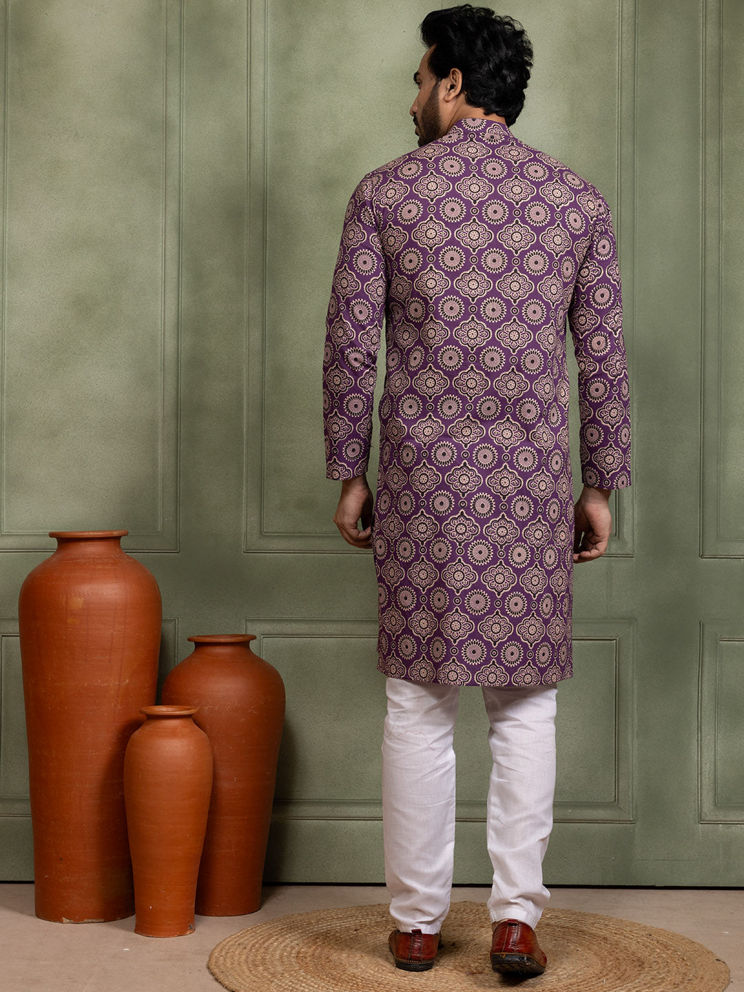 Elevate your ethnic style with this elegant Purple Cotton kurta set. Designed for festive and wedding occasions, it features a refined look with a stylish print, making it a timeless wardrobe addition.