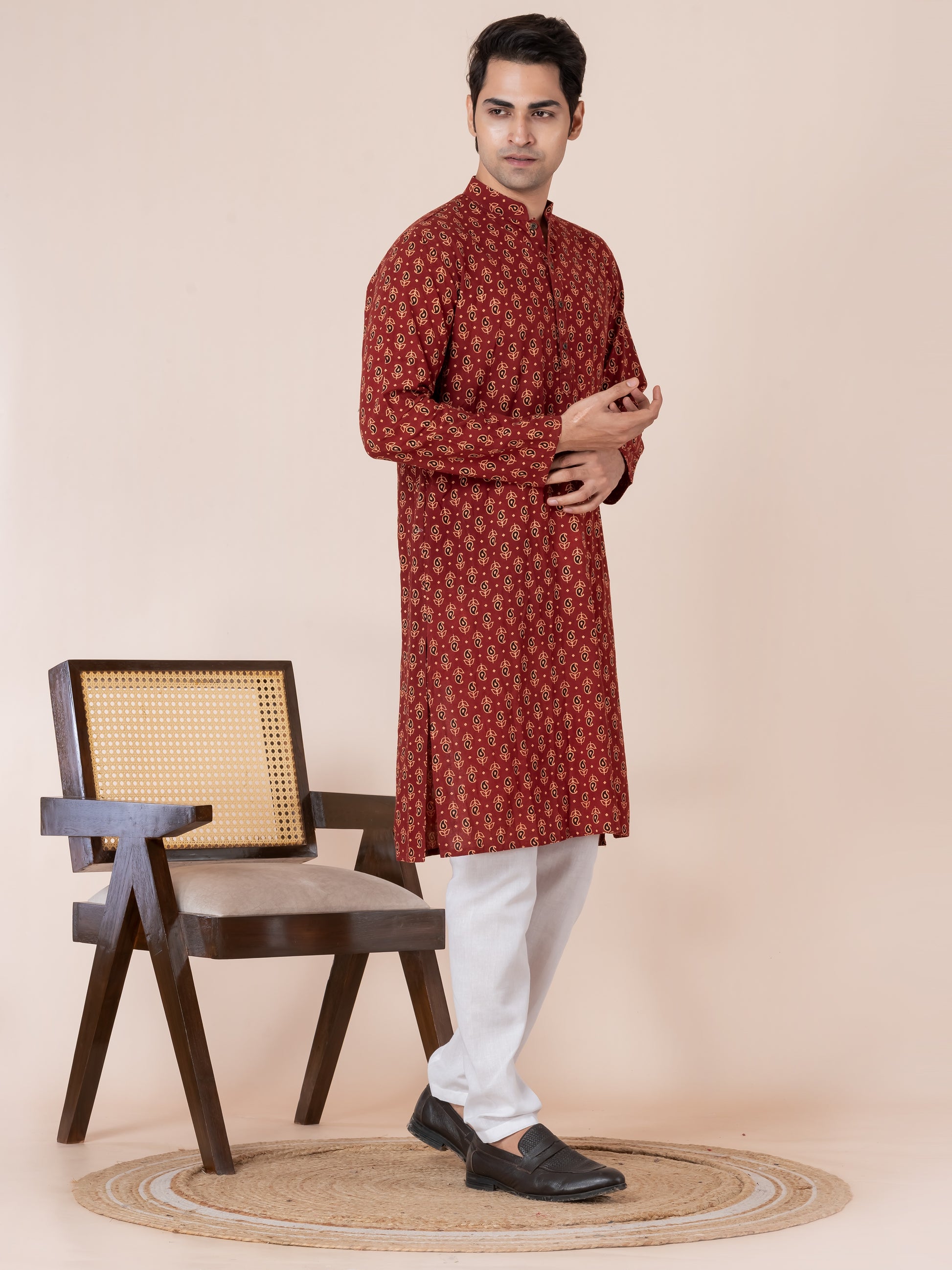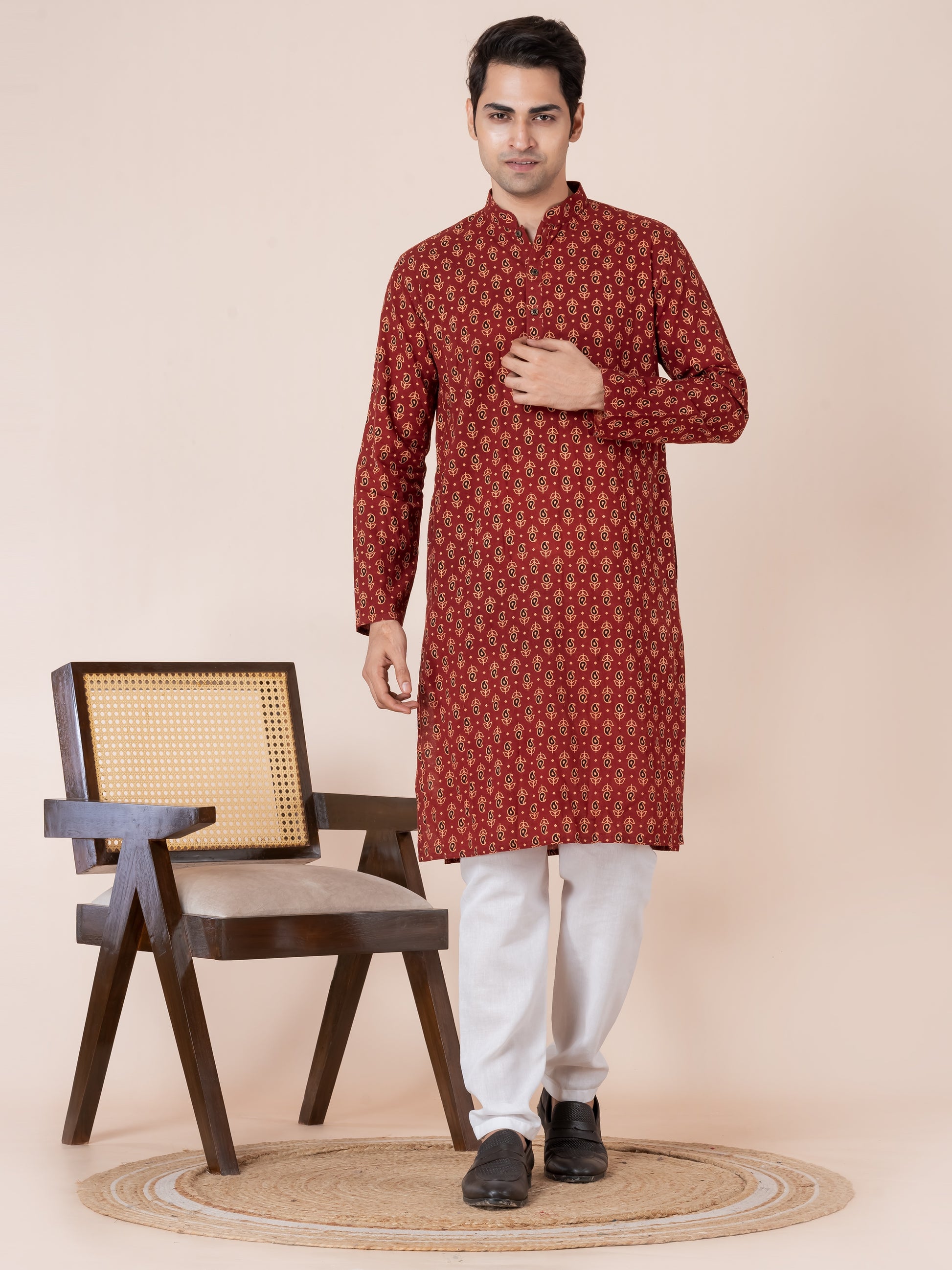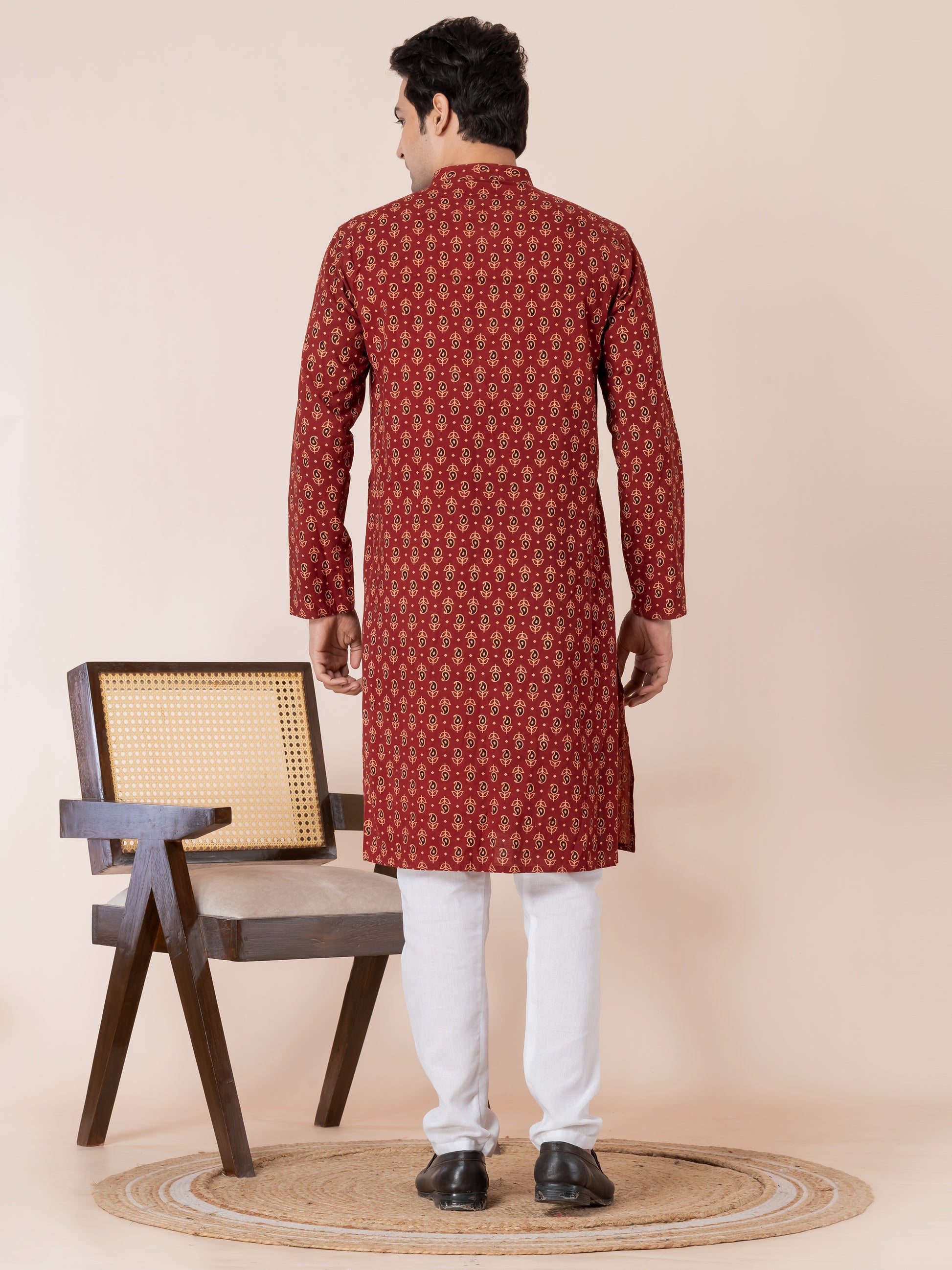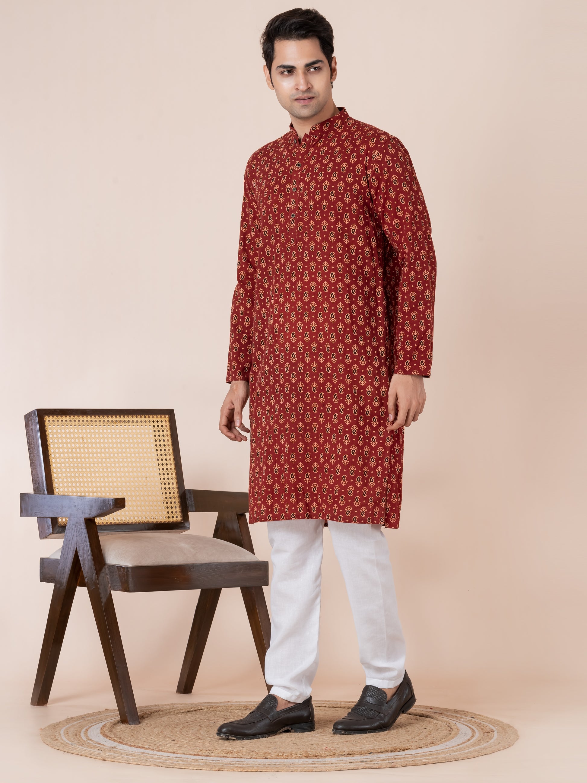 Elevate your ethnic style with this elegant Red Cotton kurta set. Designed for festive and wedding occasions, it features a refined look with a stylish print, making it a timeless wardrobe addition.