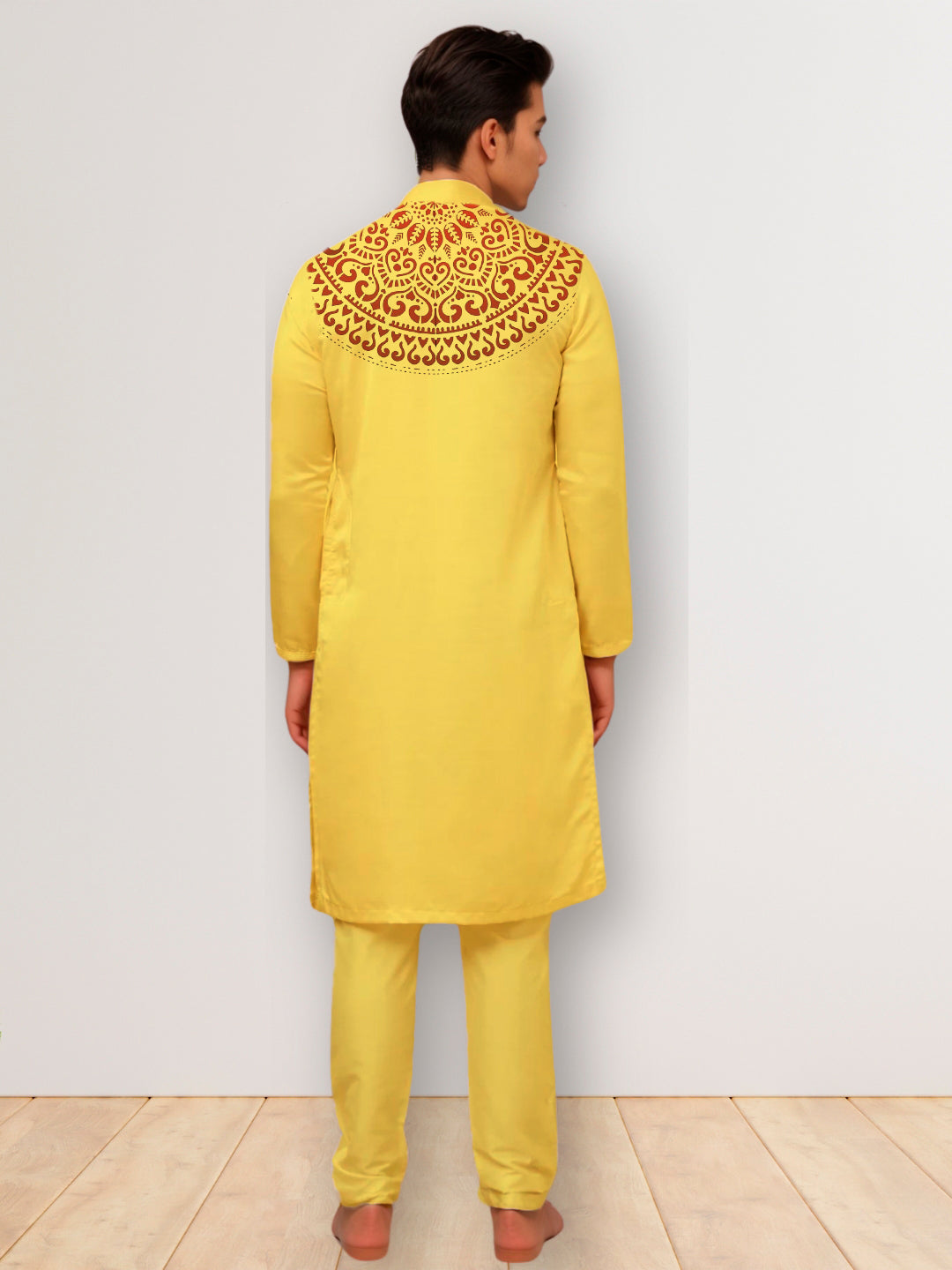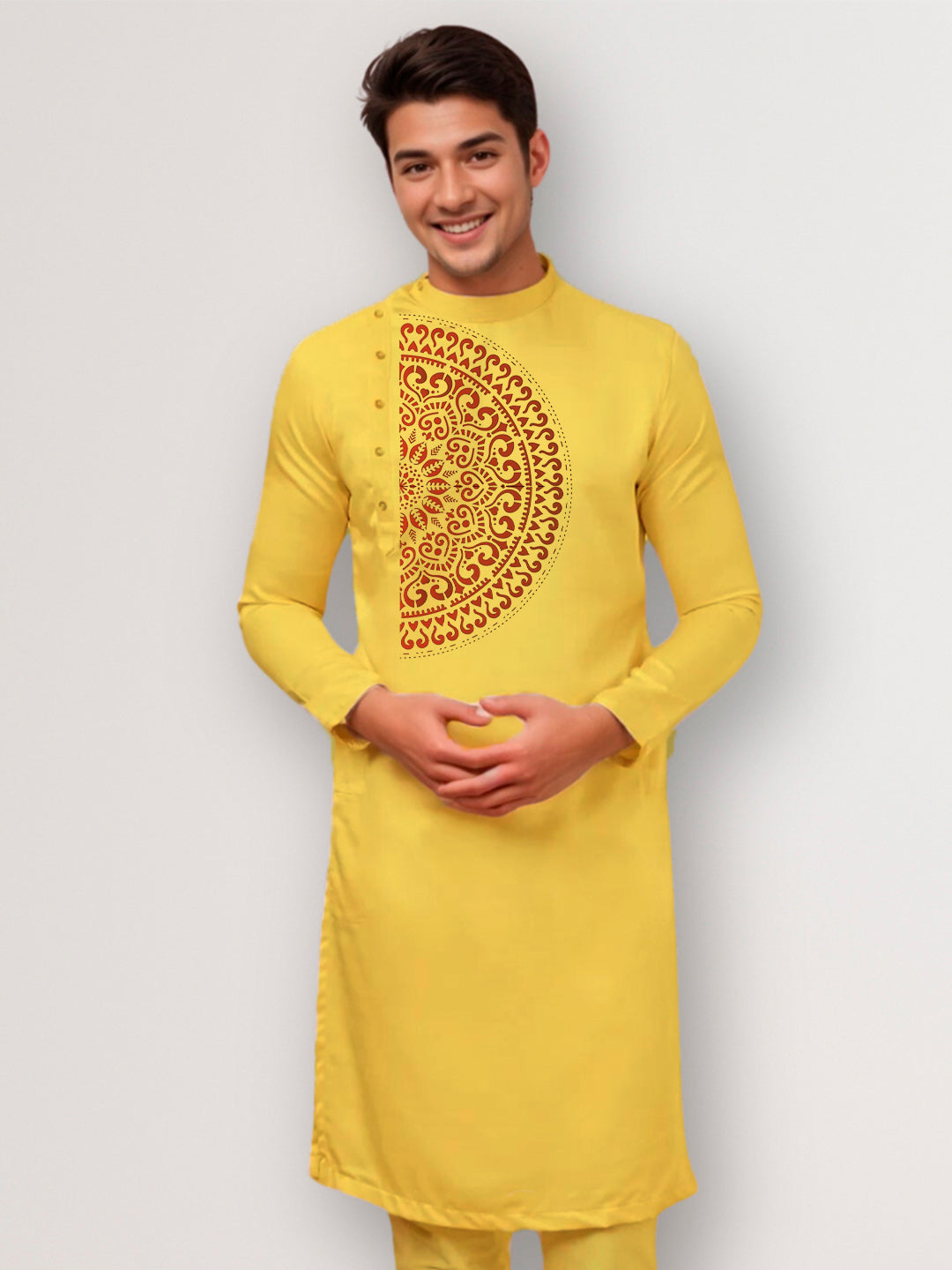 Exude elegance and tradition with this Yellow Cotton Kurta With Pyjama Set, featuring an exquisite ethnic motif print that enhances its regal appeal. Designed for comfort and style, this kurta is perfect for festive occasions, weddings, and cultural celebrations.