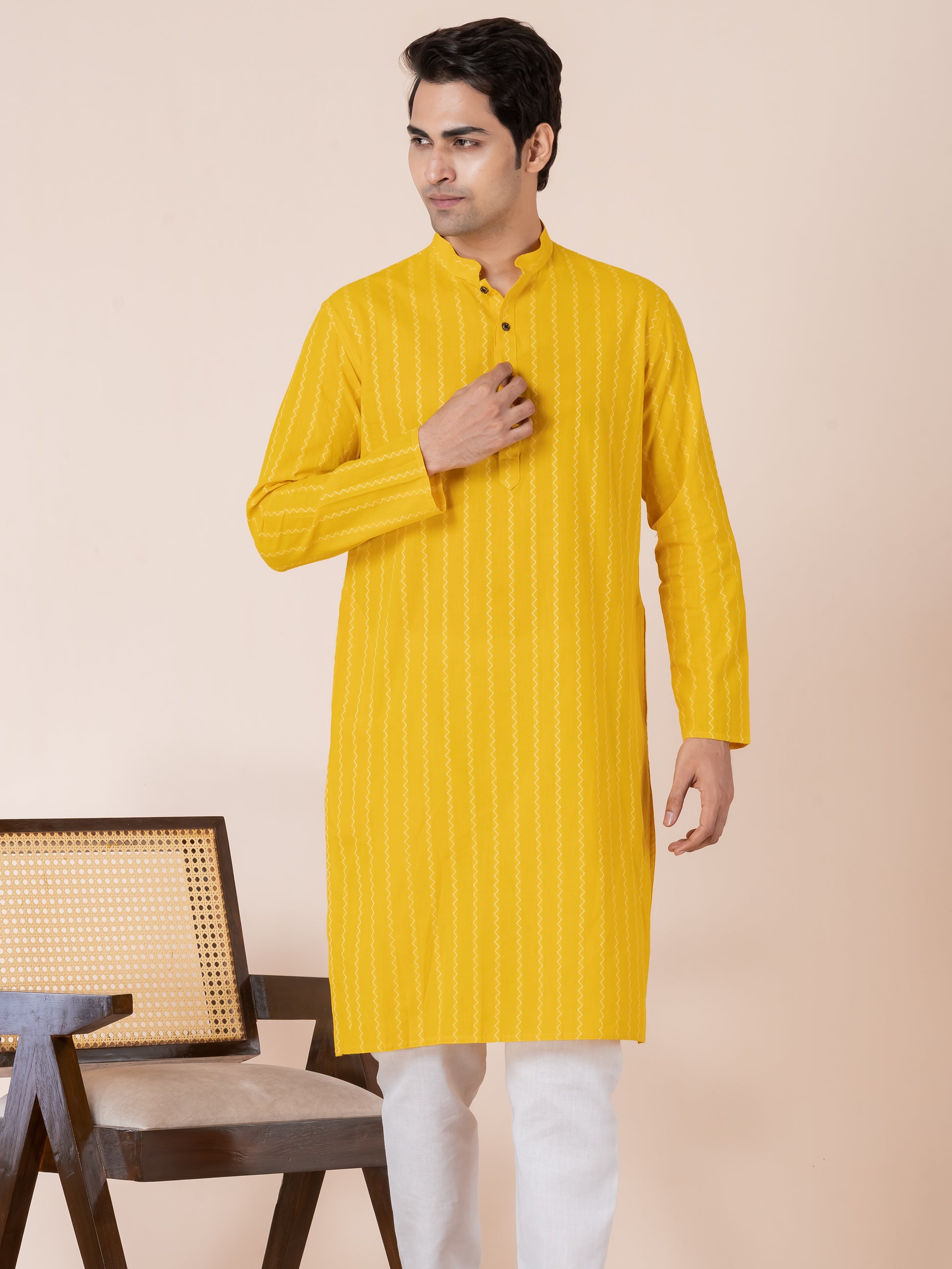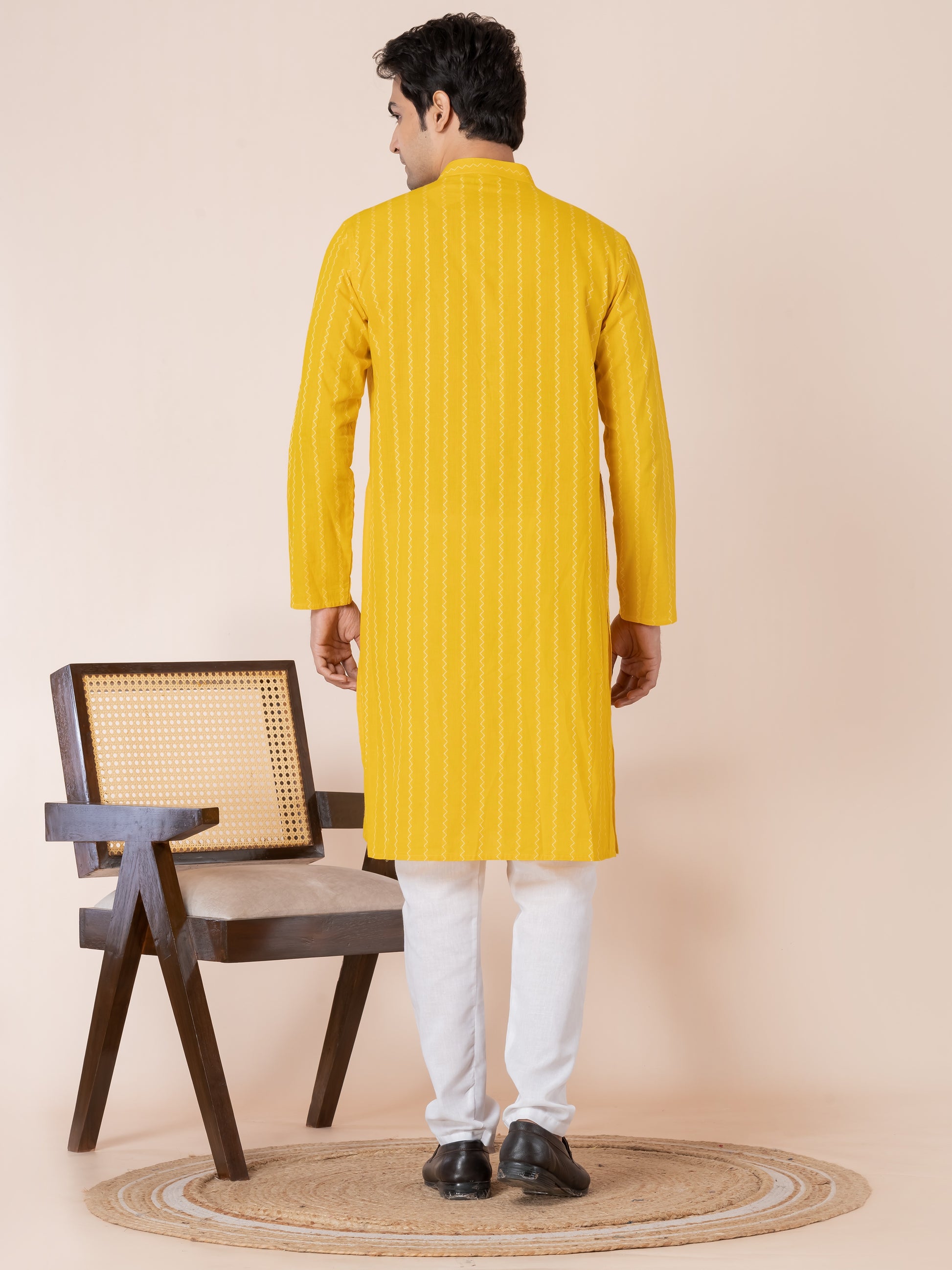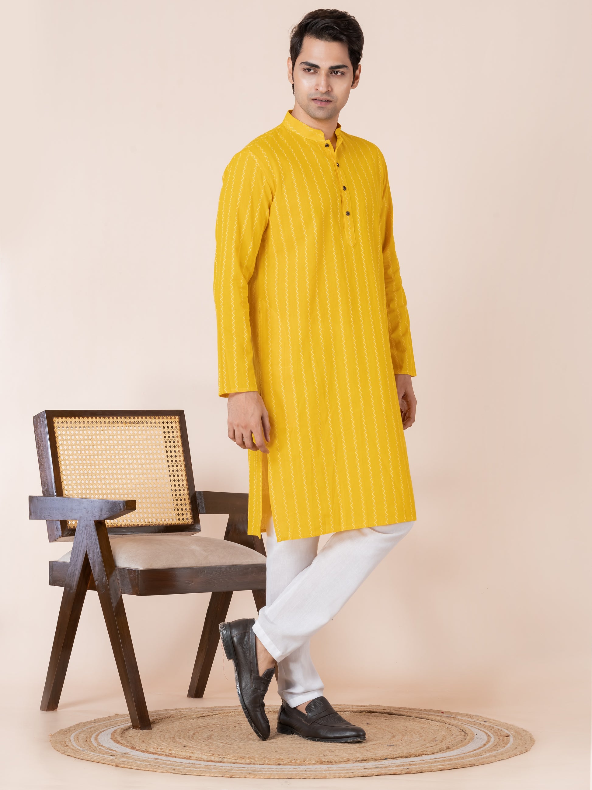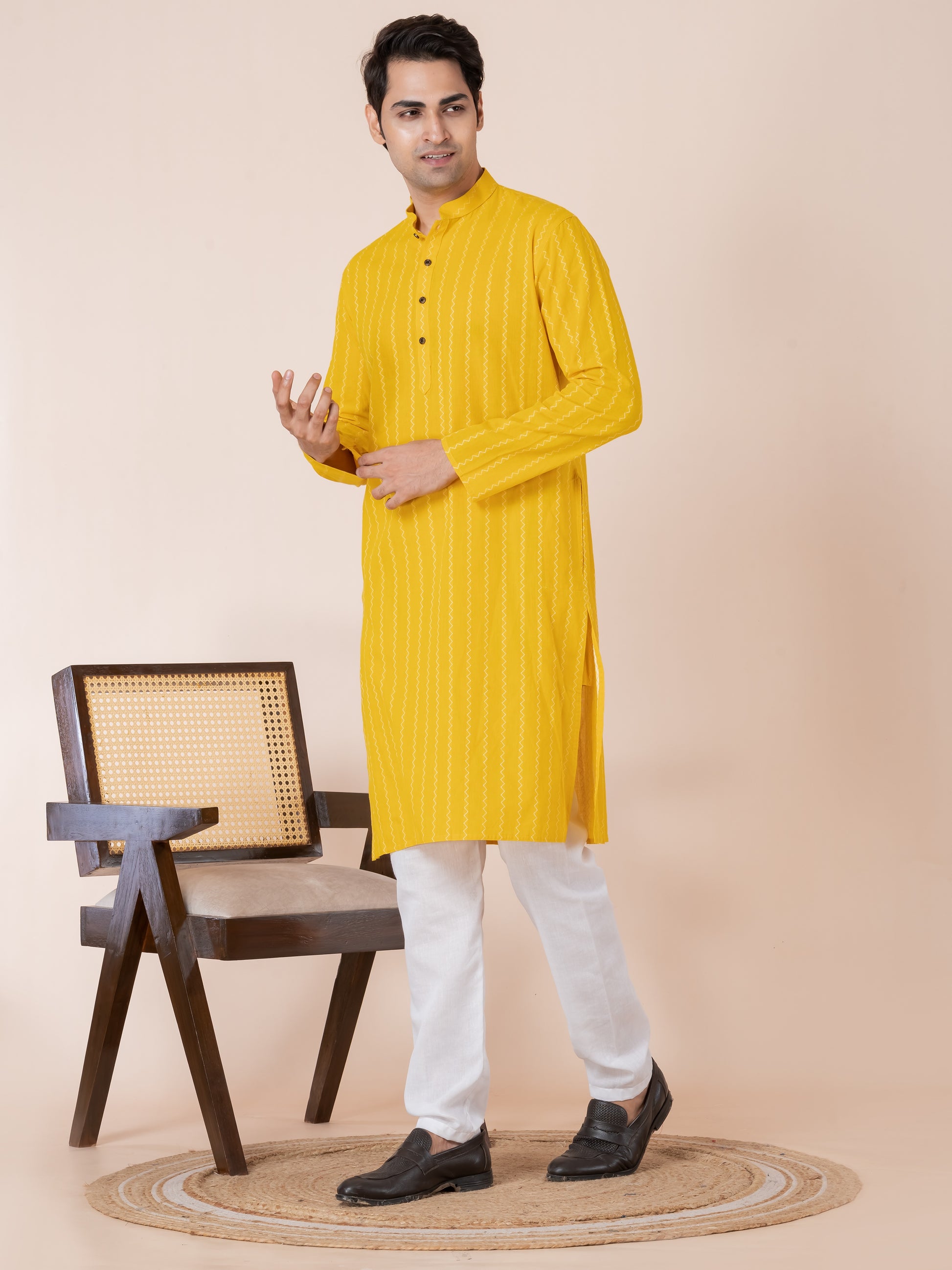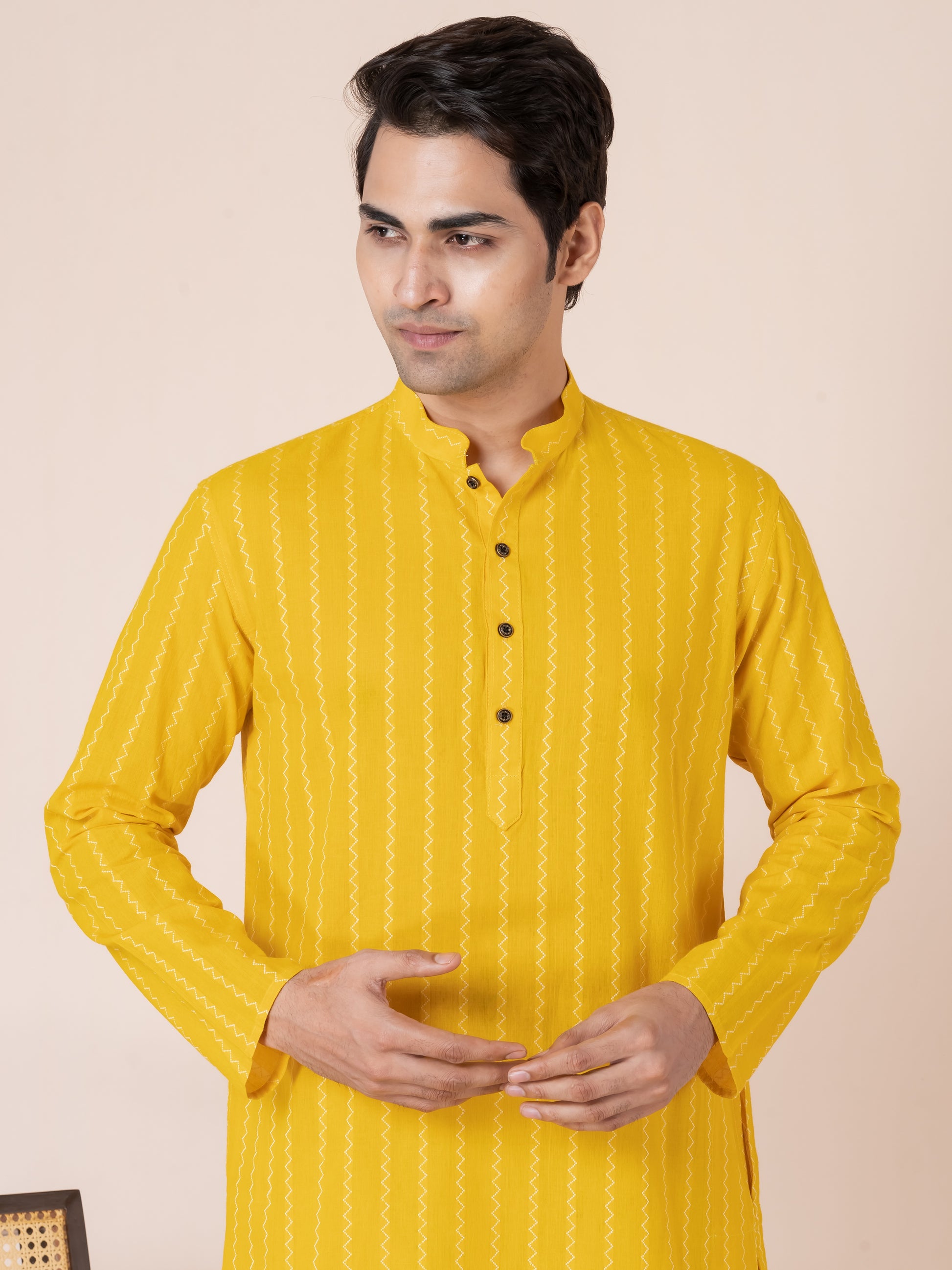 Elevate your ethnic style with this elegant Yellow Cotton kurta set. Designed for festive and wedding occasions, it features a refined look with a stylish print, making it a timeless wardrobe addition.