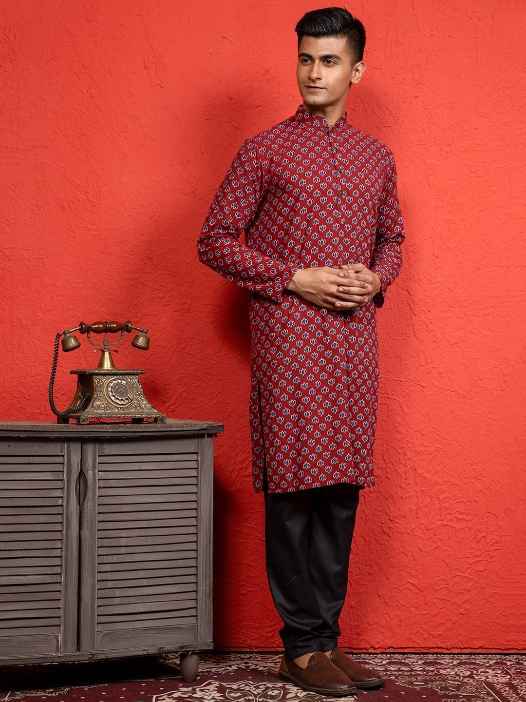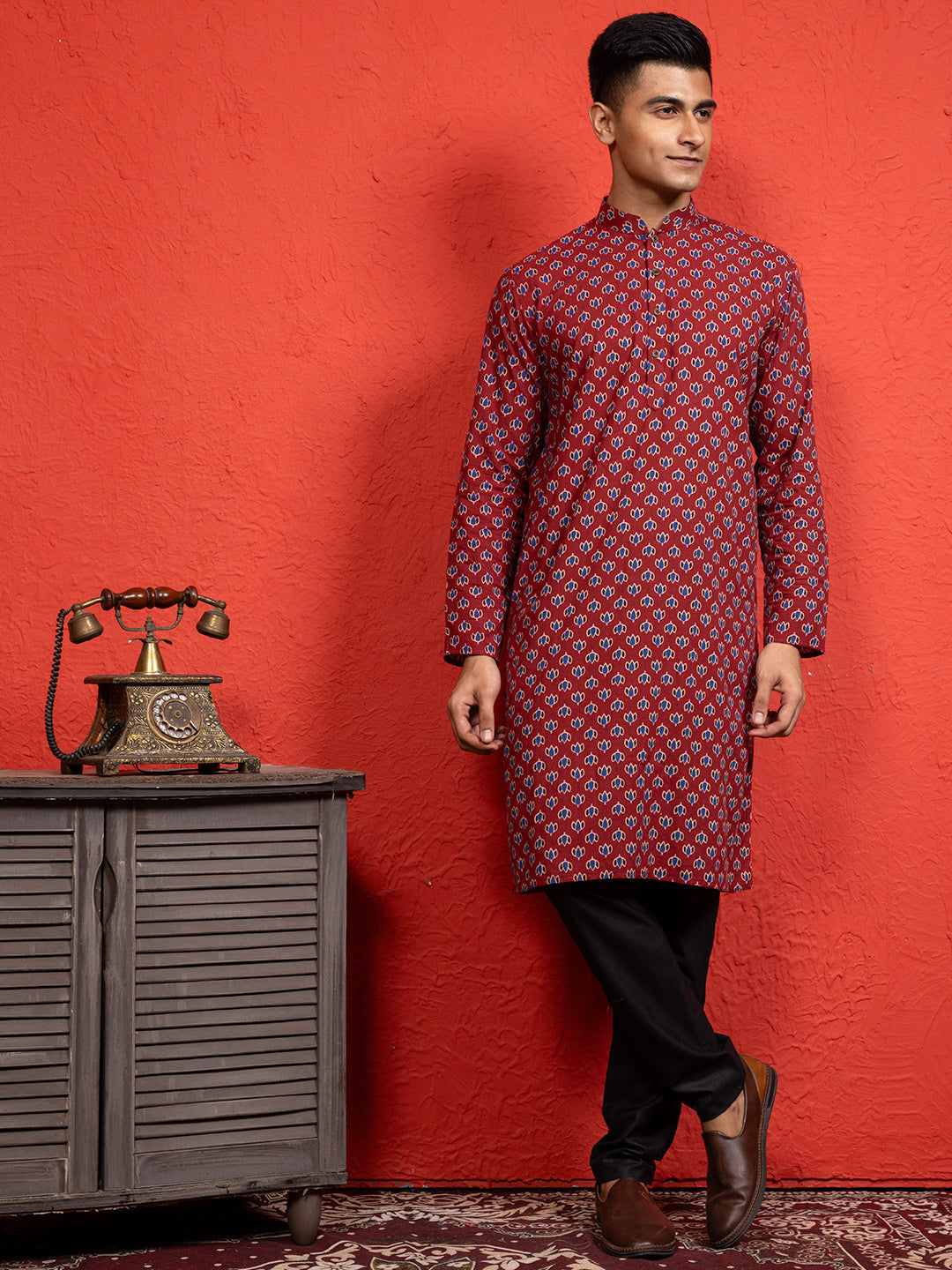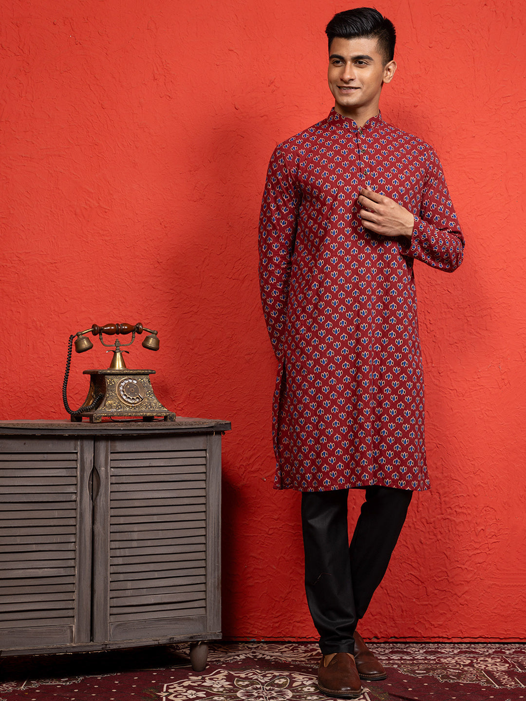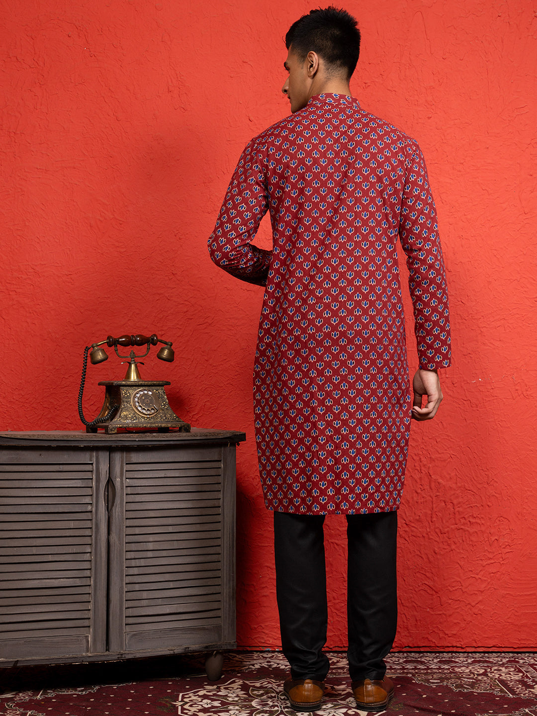 Elevate your ethnic style with this elegant Red Cotton kurta set. Designed for festive and wedding occasions, it features a refined look with a stylish print, making it a timeless wardrobe addition.