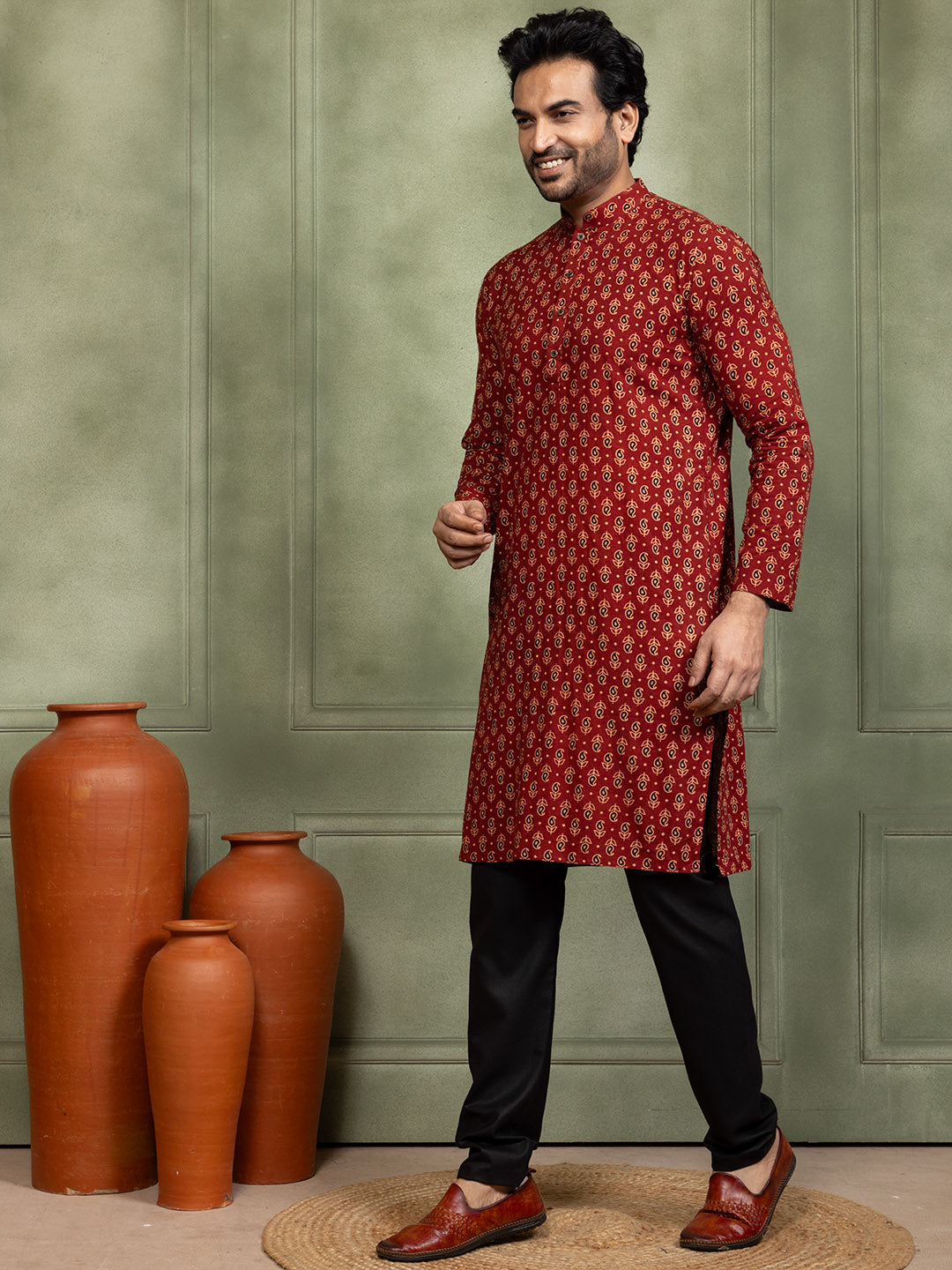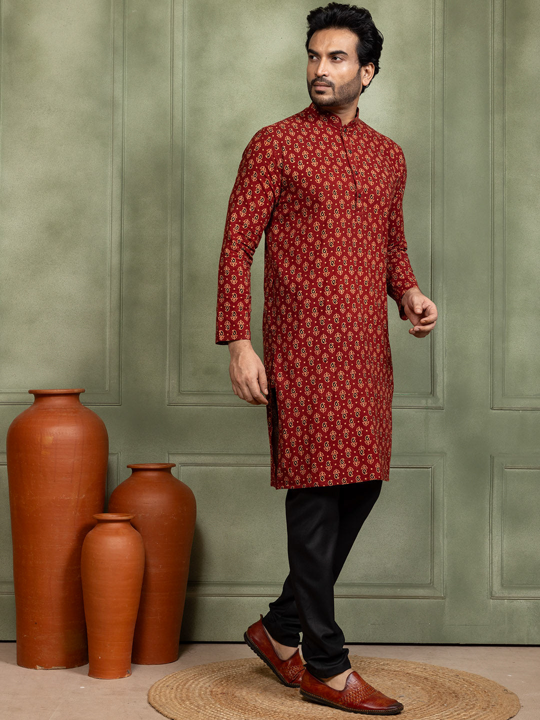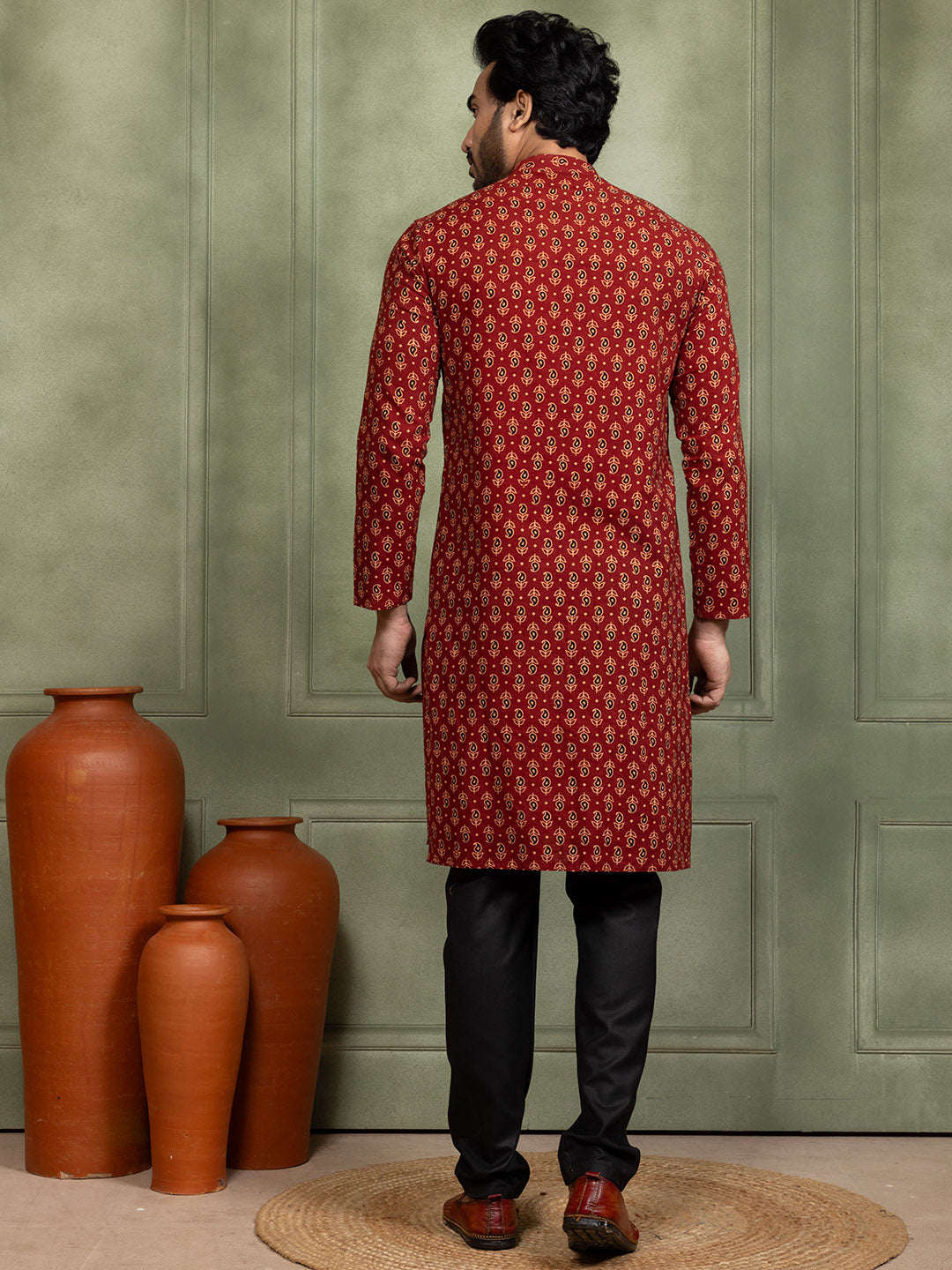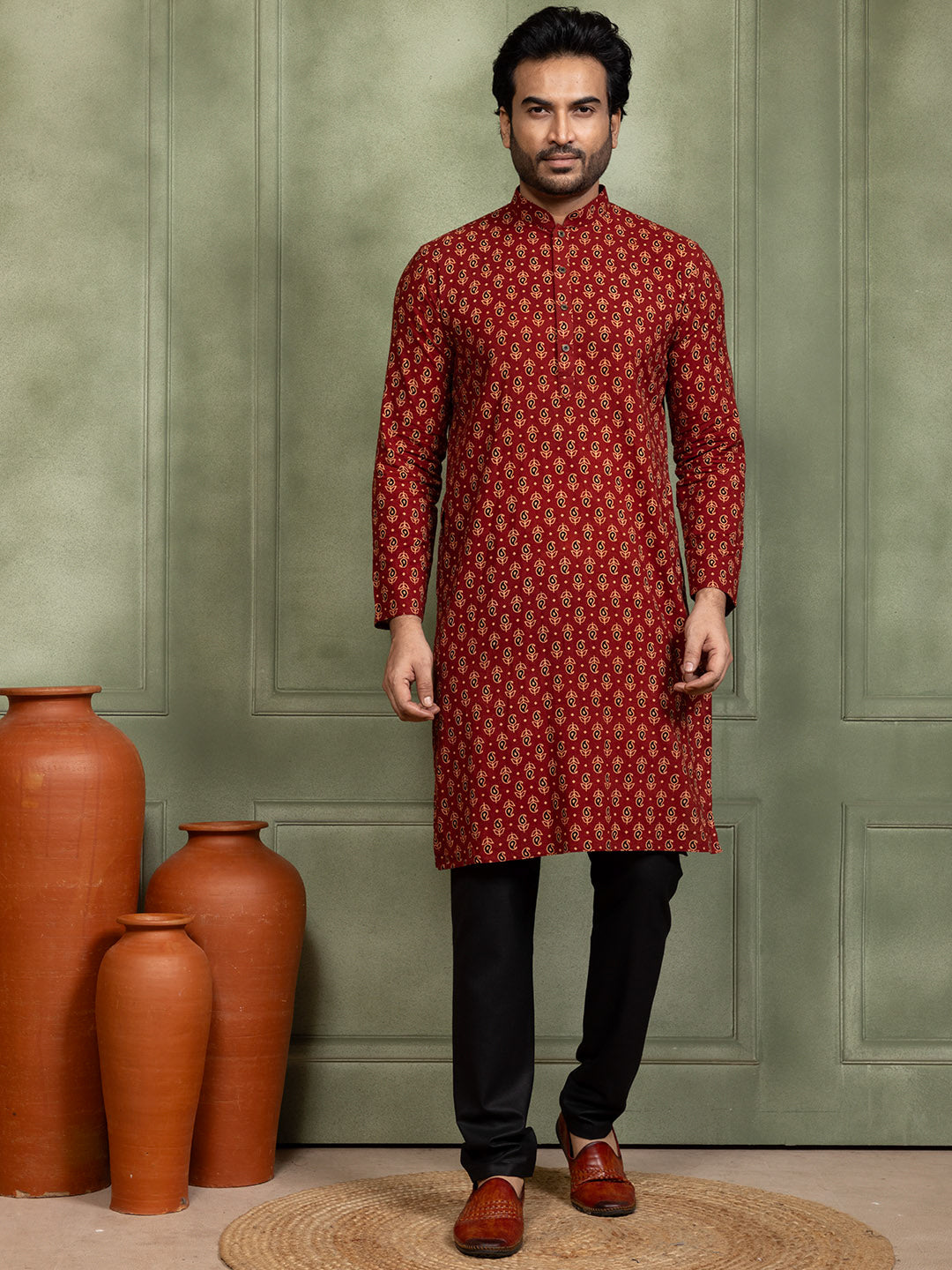 Elevate your ethnic style with this elegant Red Cotton kurta set. Designed for festive and wedding occasions, it features a refined look with a stylish print, making it a timeless wardrobe addition.