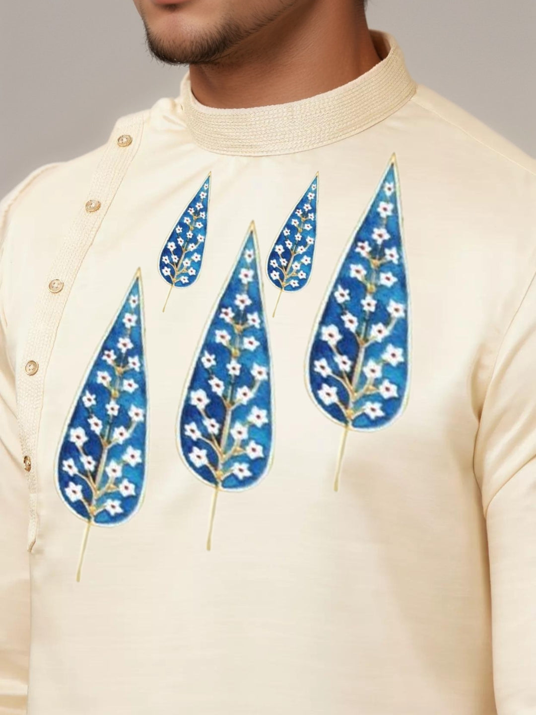 Pair this Beige Cotton Kurta with a contrasting churidar or straight-fit pyjama to achieve a refined ethnic look. Complete the outfit with classic mojaris or leather sandals.