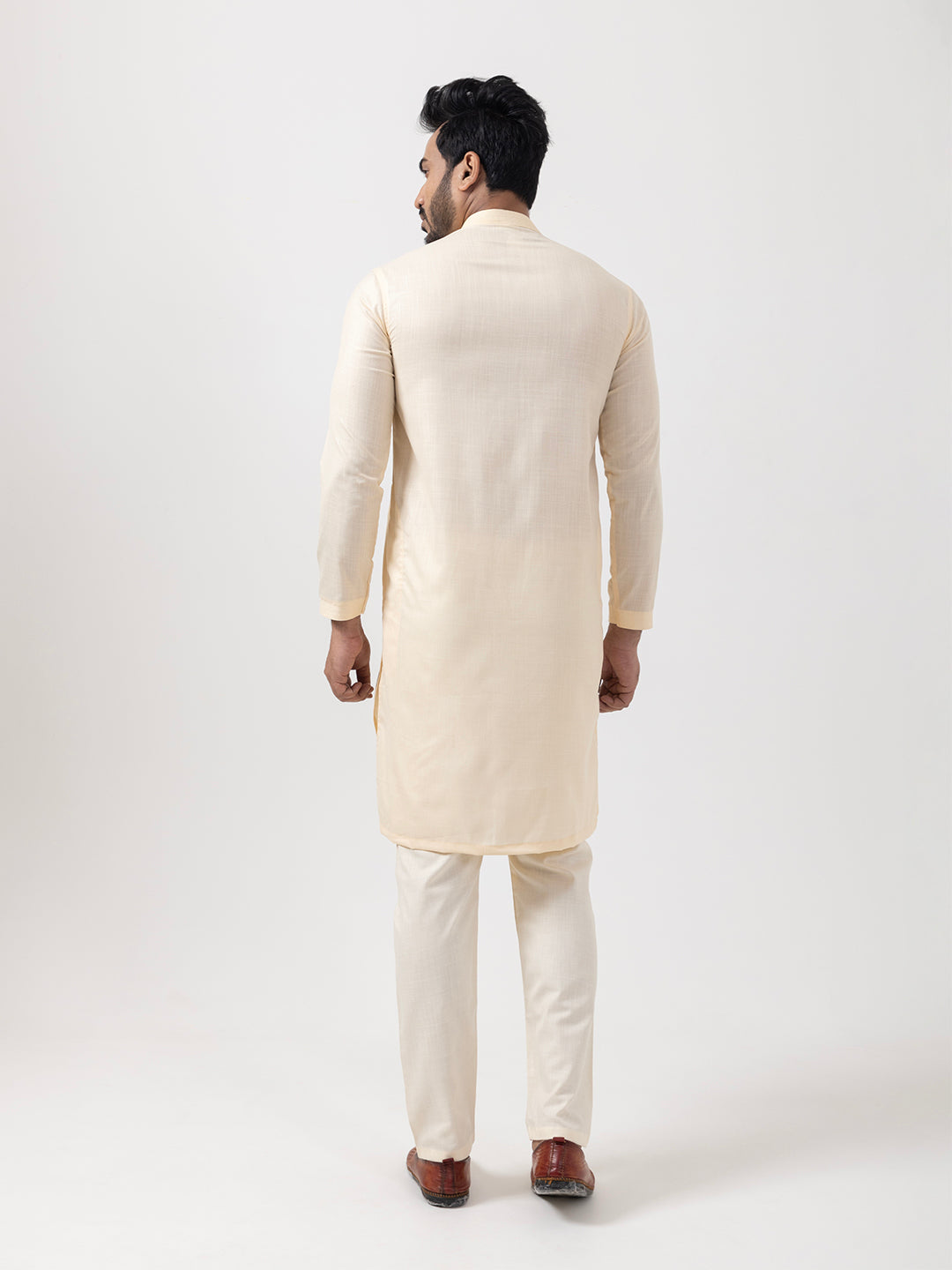 Pair this Beige Cotton Kurta with a contrasting churidar or straight-fit pyjama to achieve a refined ethnic look. Complete the outfit with classic mojaris or leather sandals.
