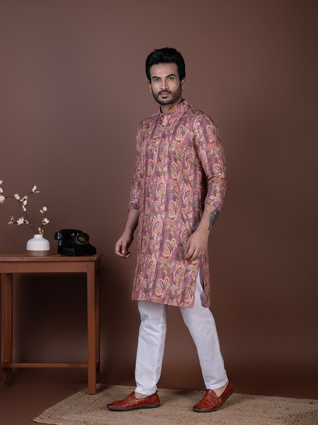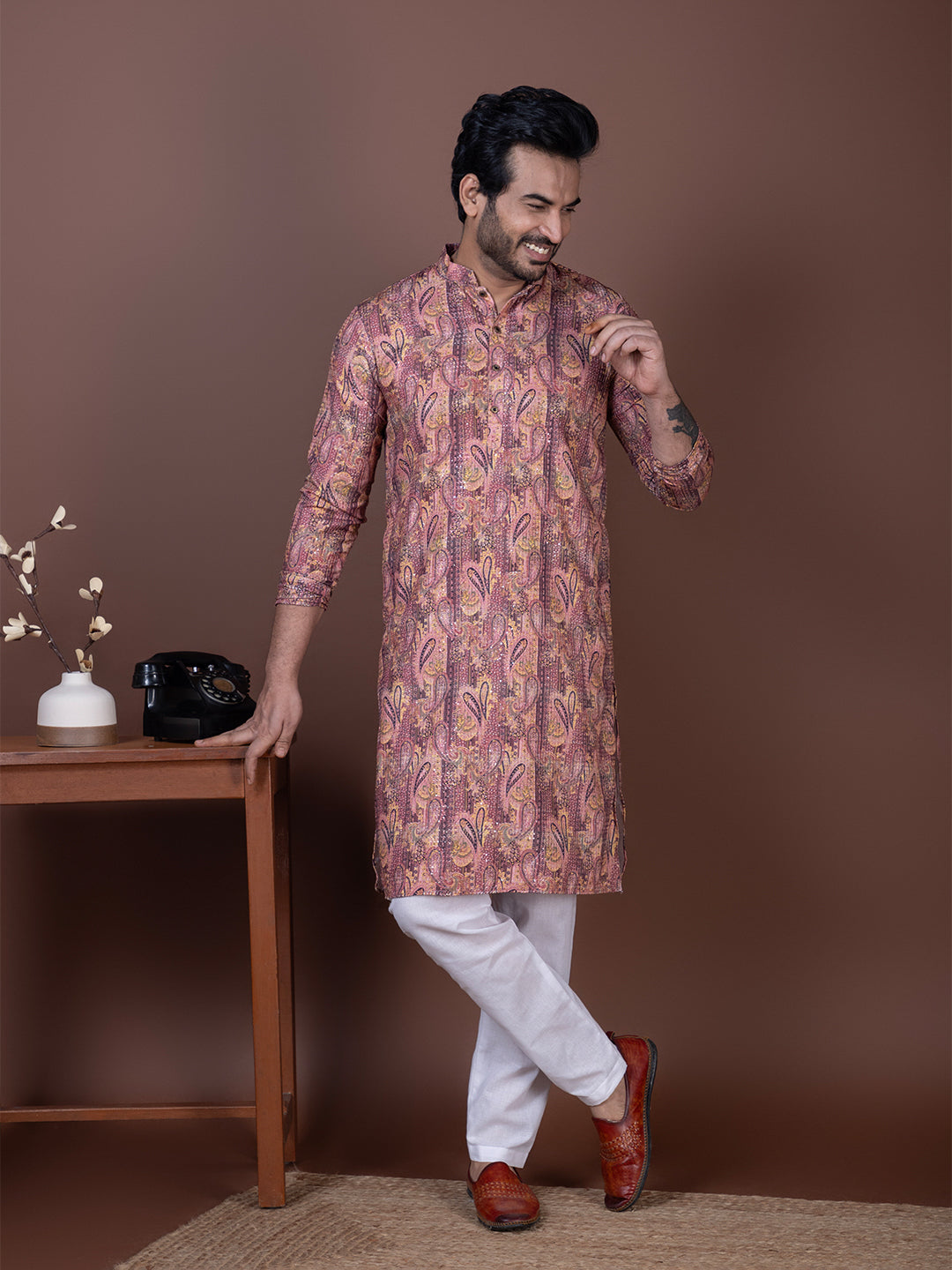 "Elevate your ethnic style with this Multi cotton kurta and white pyjama set. Designed for comfort and elegance, it features a subtle print and a mandarin collar, perfect for festive and cultural occasions."