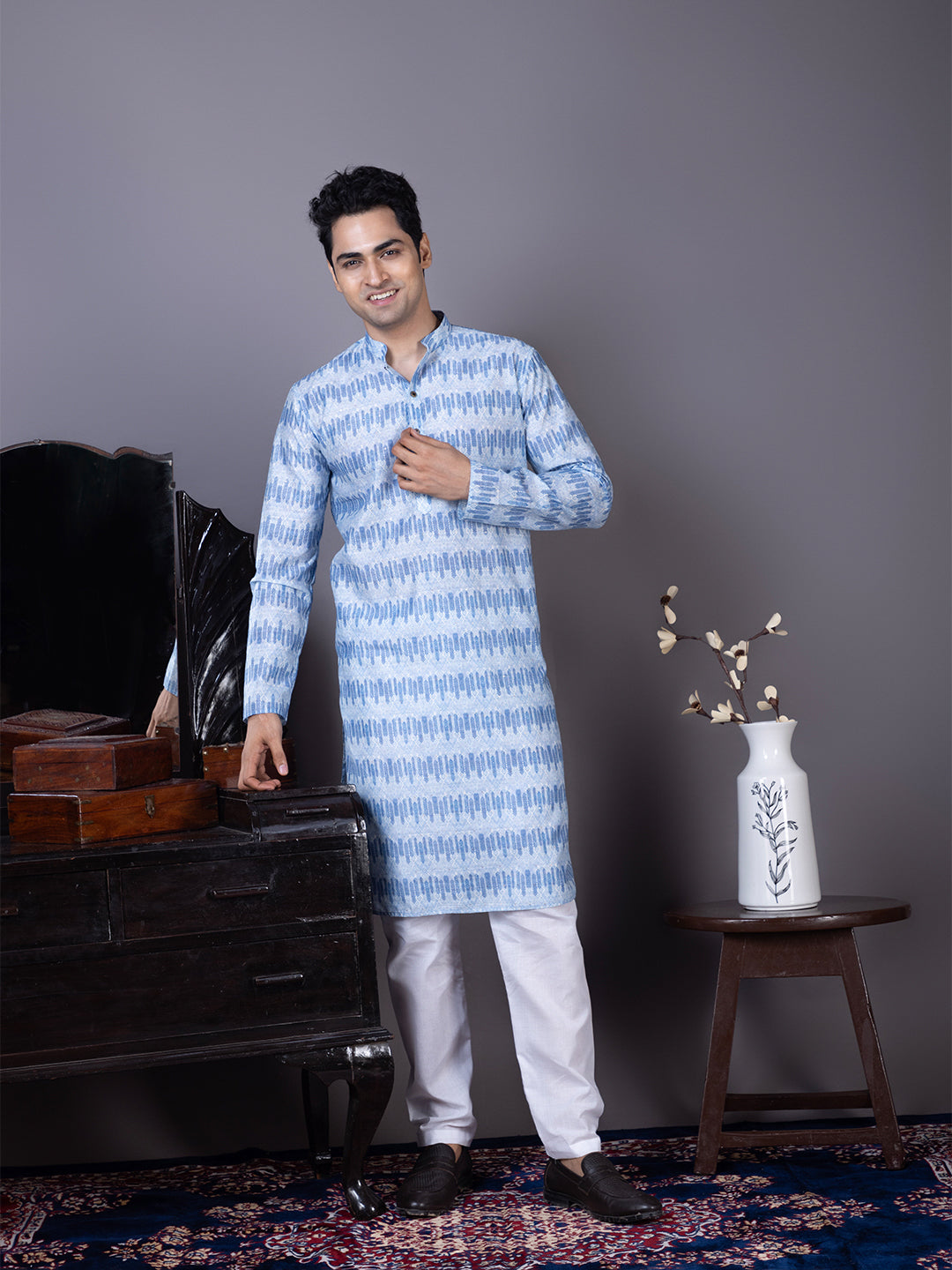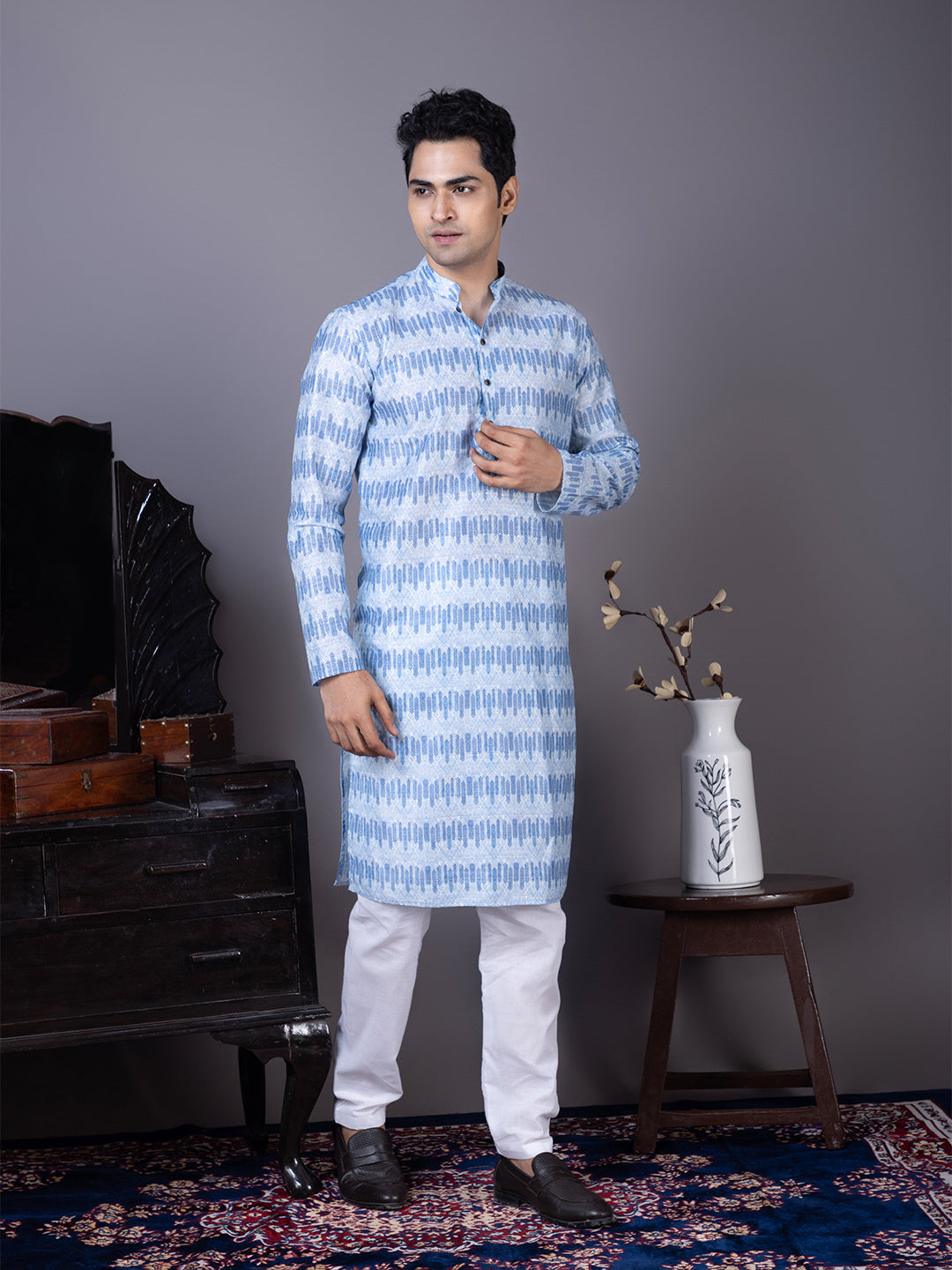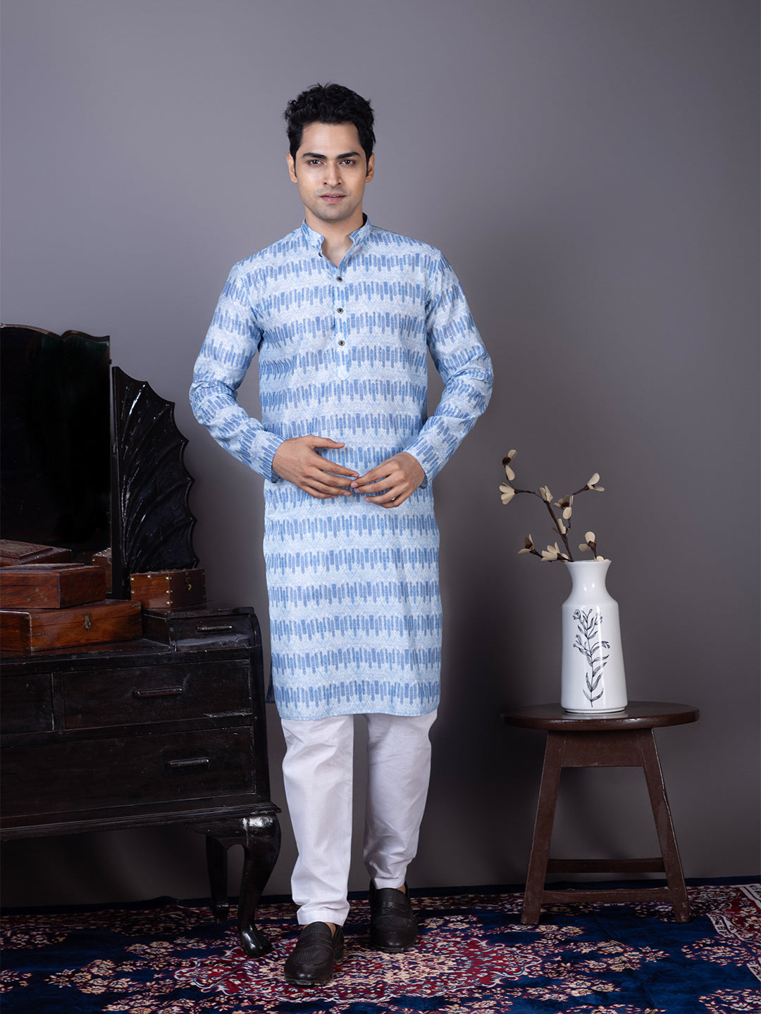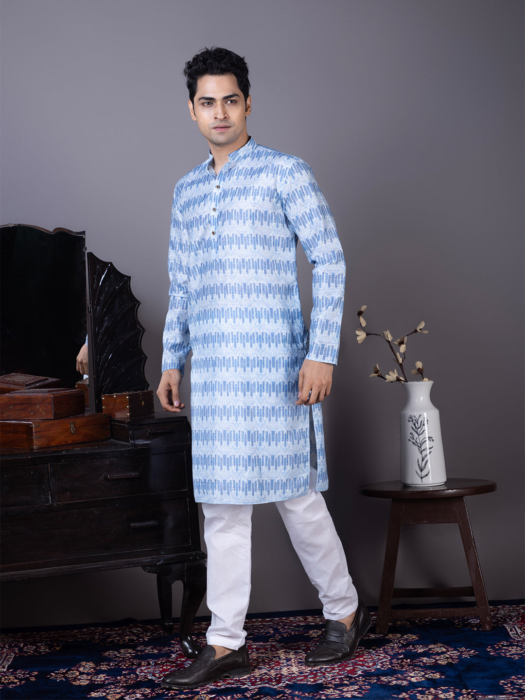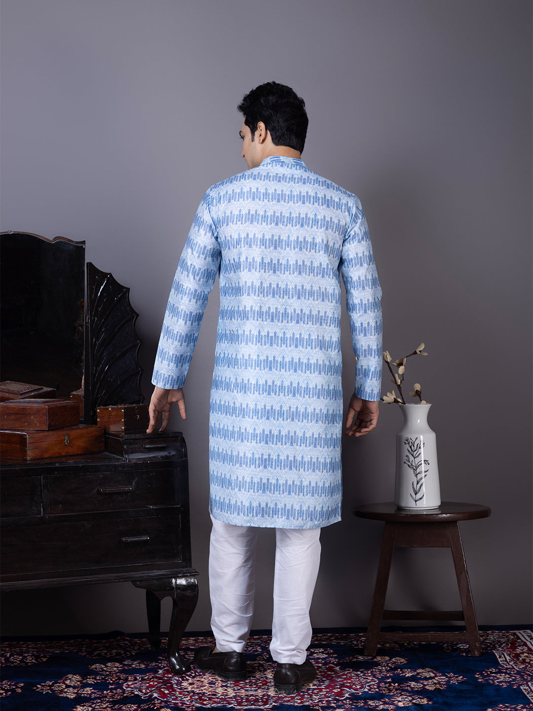 Pair this Blue Jacquard kurta with white churidar or trousers for a bold yet sophisticated ethnic look. Perfectly suited for evening parties and traditional celebrations.