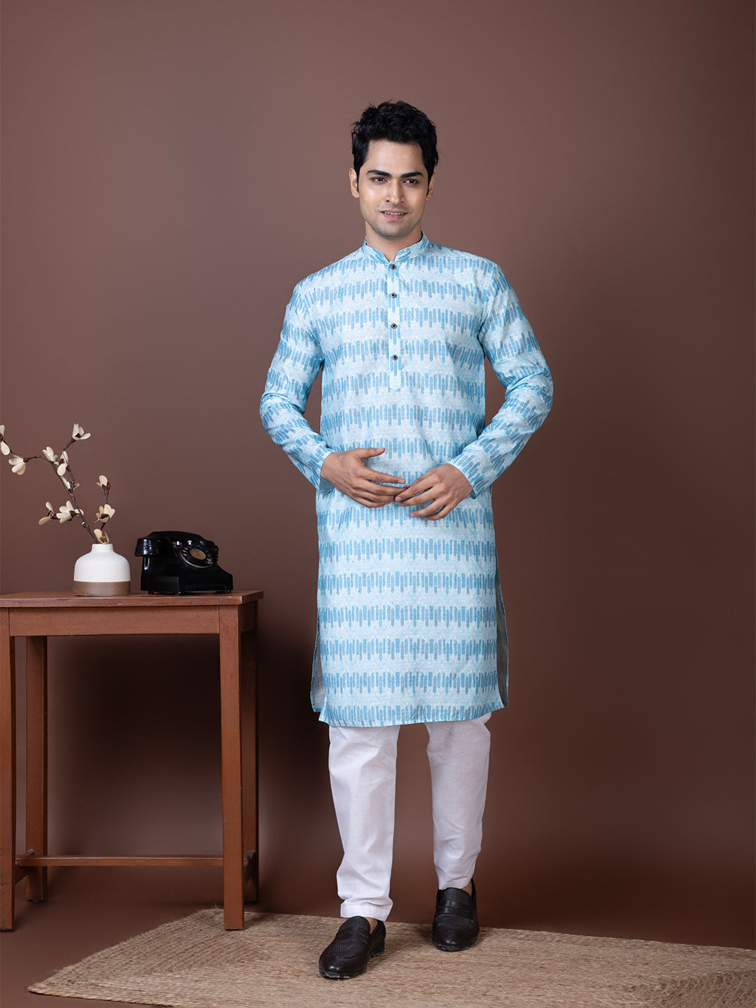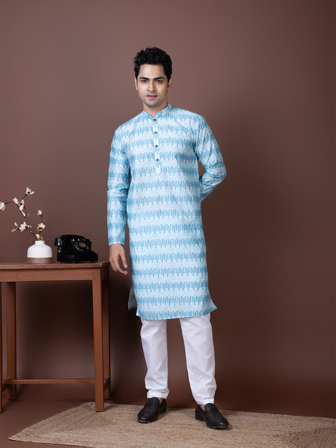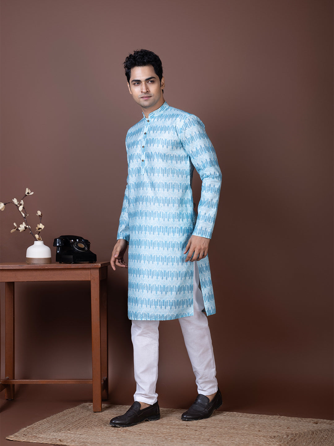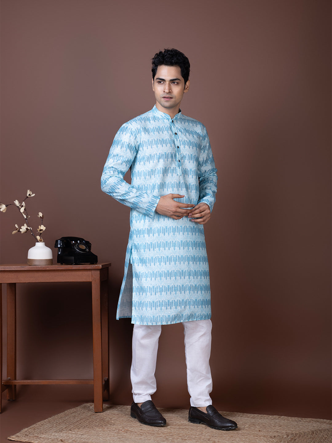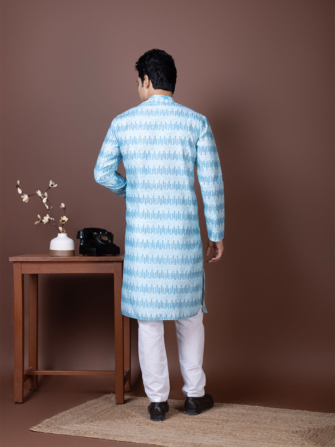Pair this Blue Jacquard kurta with white churidar or trousers for a bold yet sophisticated ethnic look. Perfectly suited for evening parties and traditional celebrations.