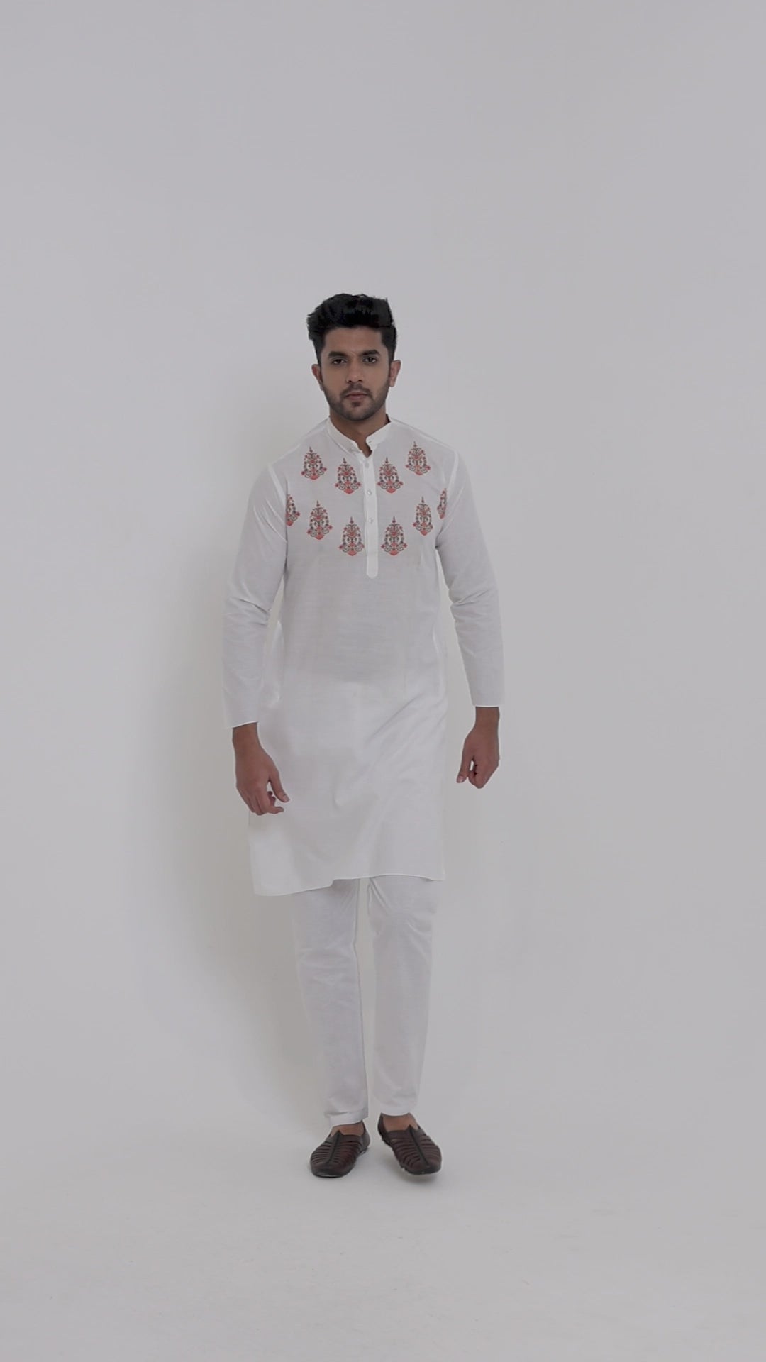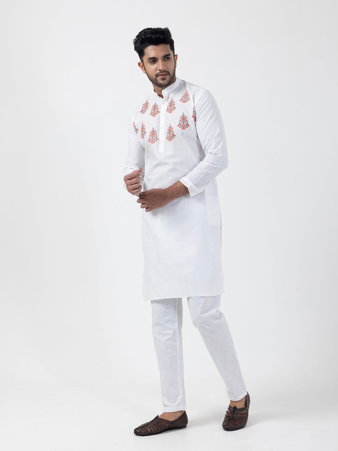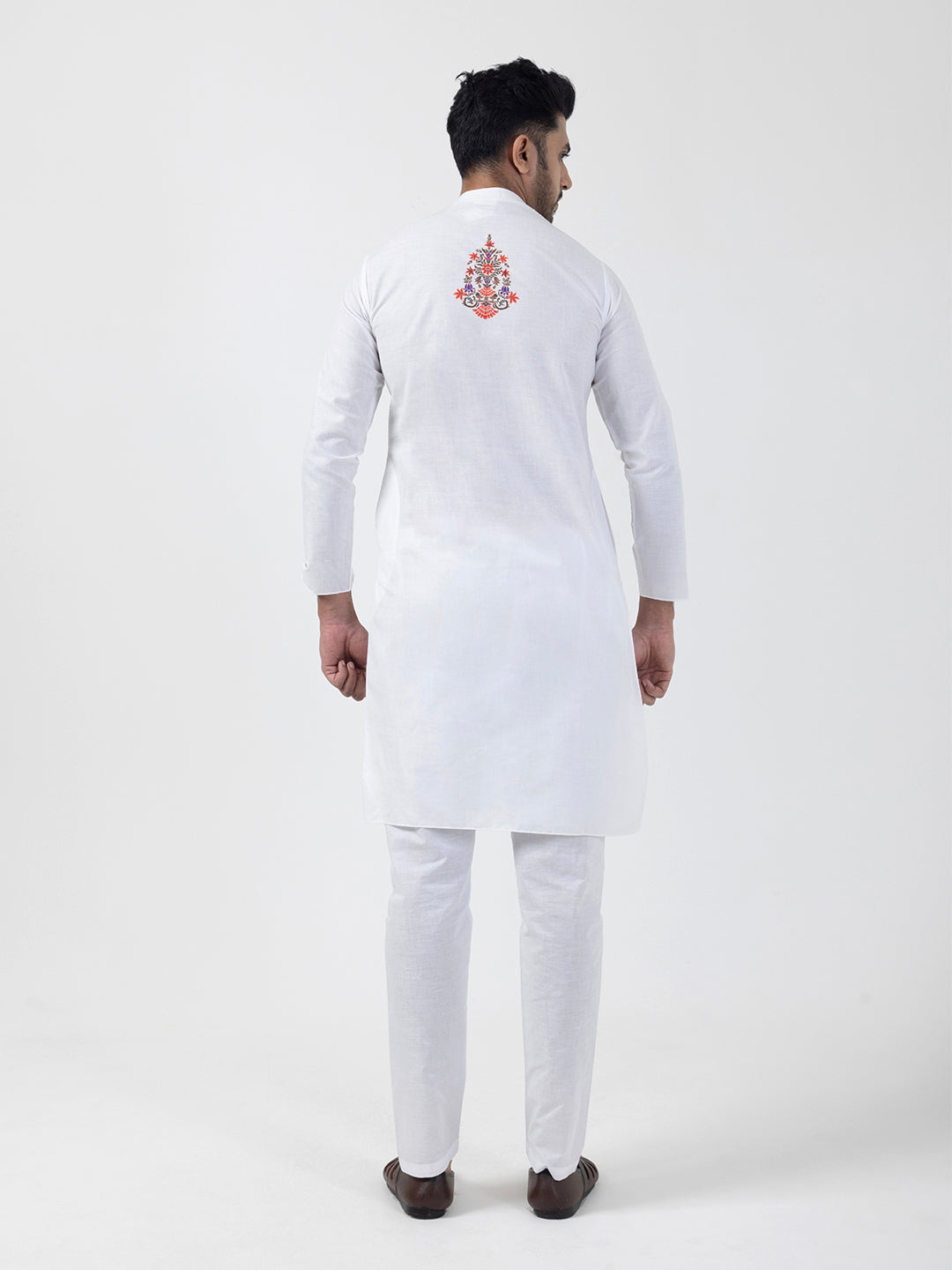 Pair this White kurta with white churidar or slim-fit trousers for a timeless ethnic look. Complete the outfit with leather loafers or traditional juttis to make a bold style statement.