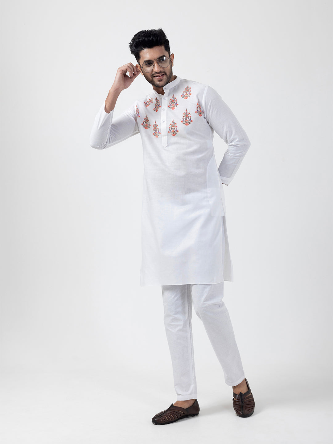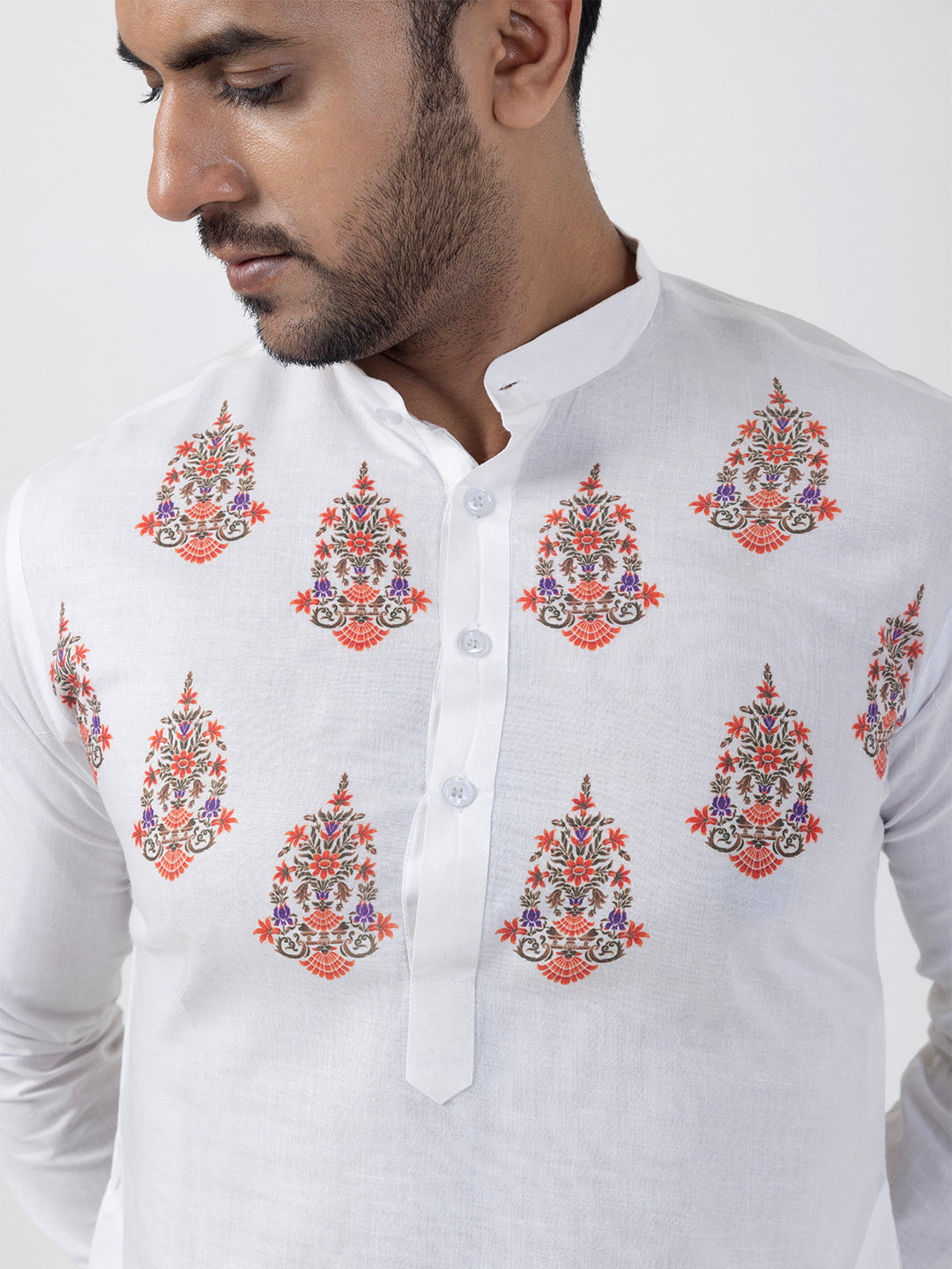 "Elevate your ethnic style with this White cotton kurta and white pyjama set. Designed for comfort and elegance, it features a subtle print and a mandarin collar, perfect for festive and cultural occasions."