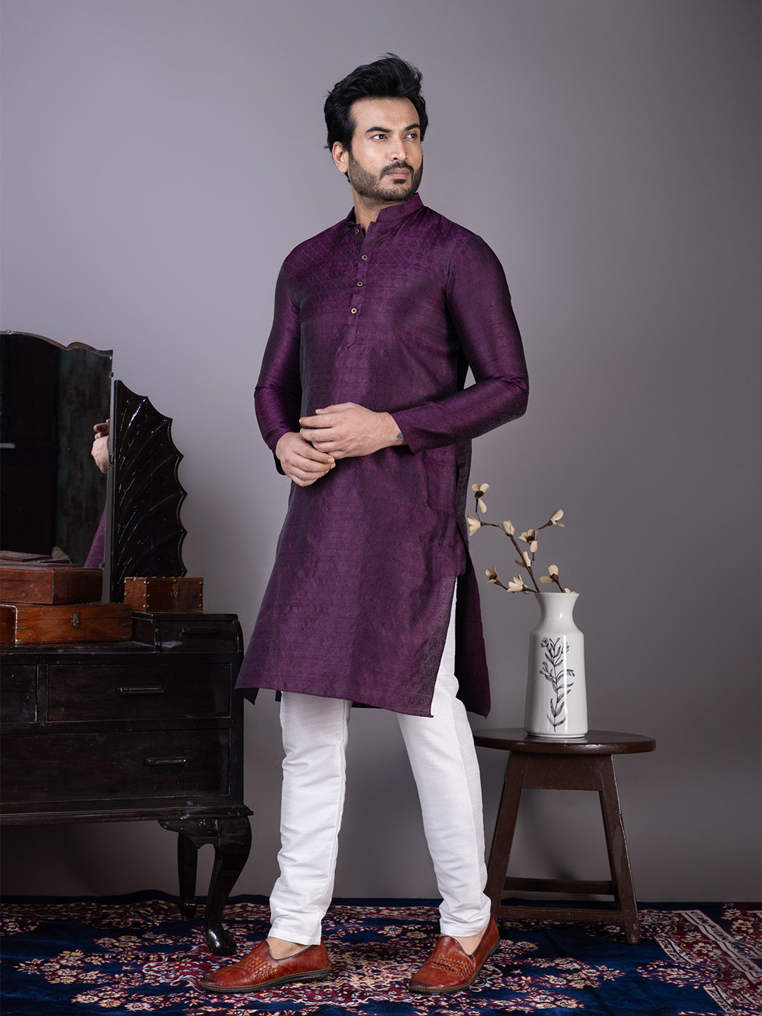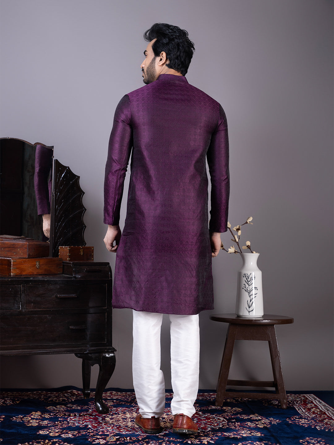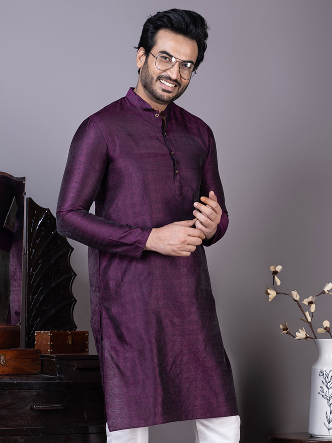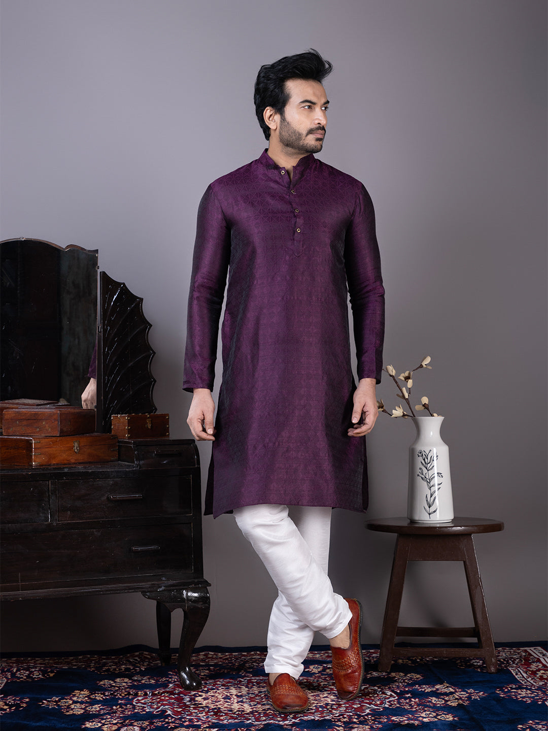 Pair this Purple Jacquard kurta with white churidar or trousers for a bold yet sophisticated ethnic look. Perfectly suited for evening parties and traditional celebrations.