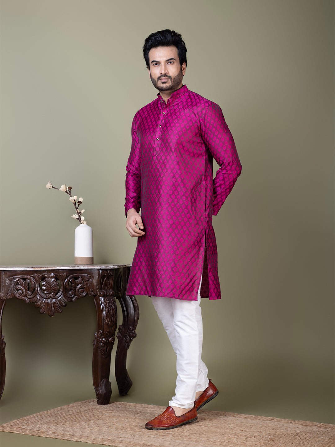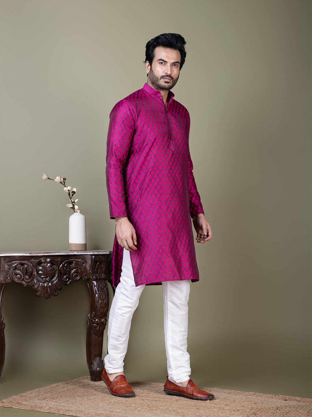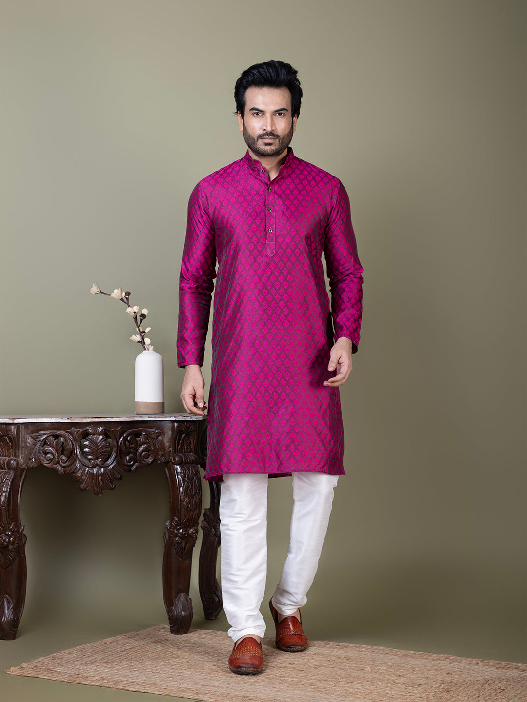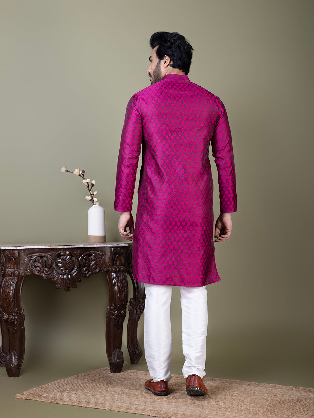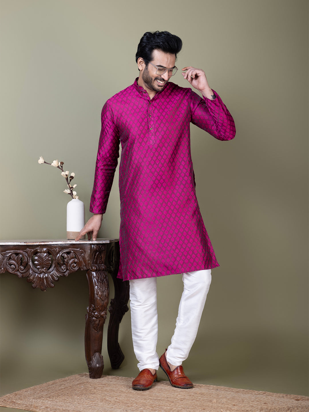 Pair this Purple Jacquard kurta with white churidar or trousers for a bold yet sophisticated ethnic look. Perfectly suited for evening parties and traditional celebrations.