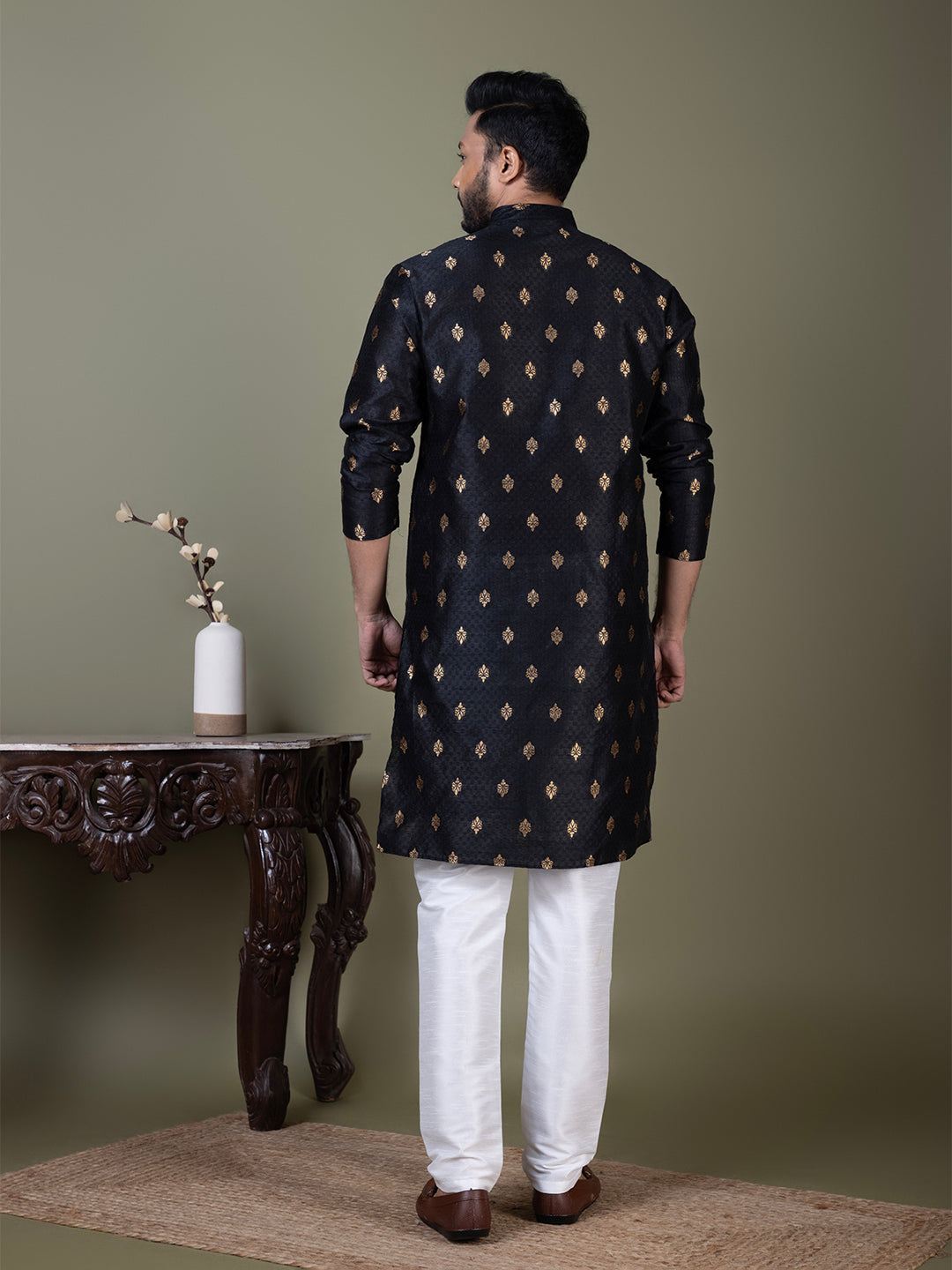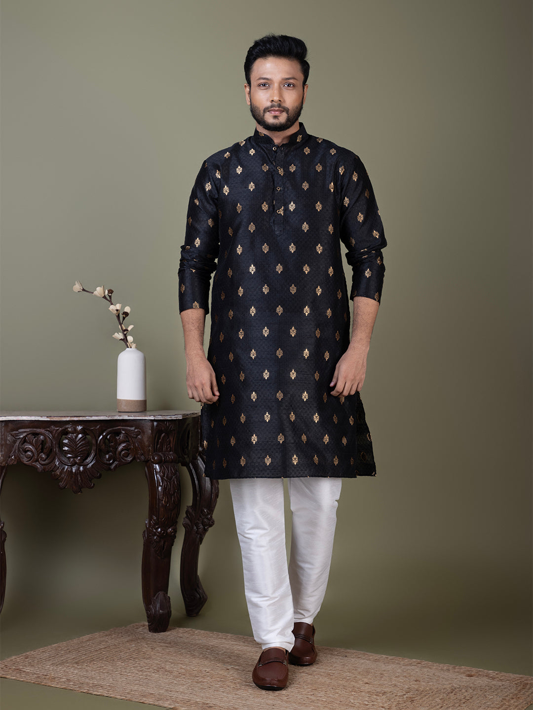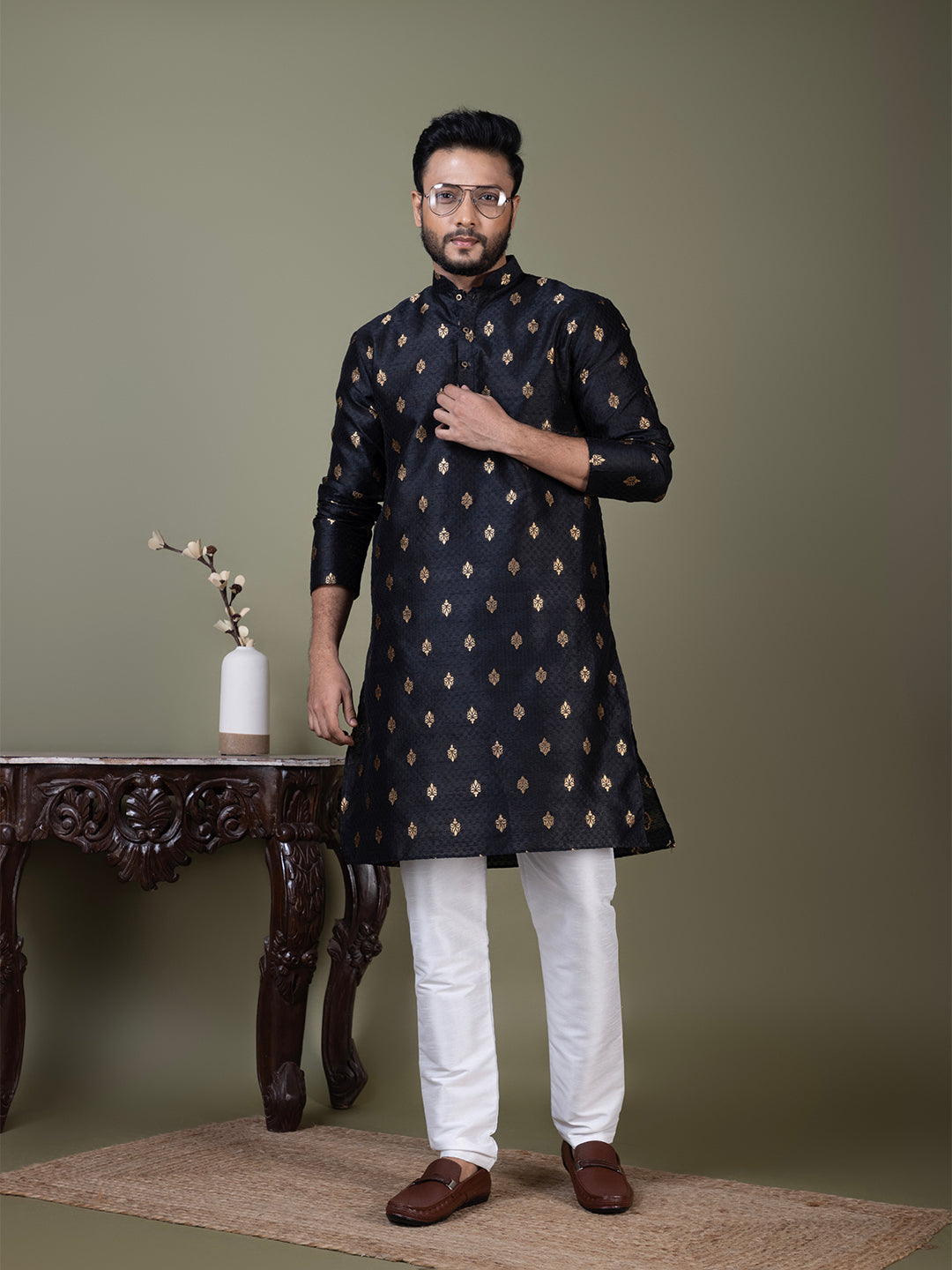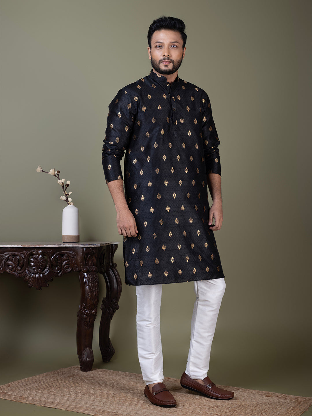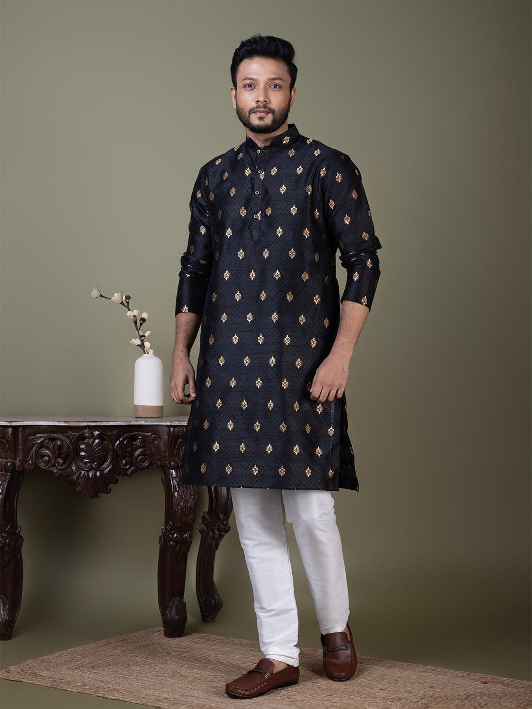 Pair this Black Jacquard kurta with white churidar or trousers for a bold yet sophisticated ethnic look. Perfectly suited for evening parties and traditional celebrations.