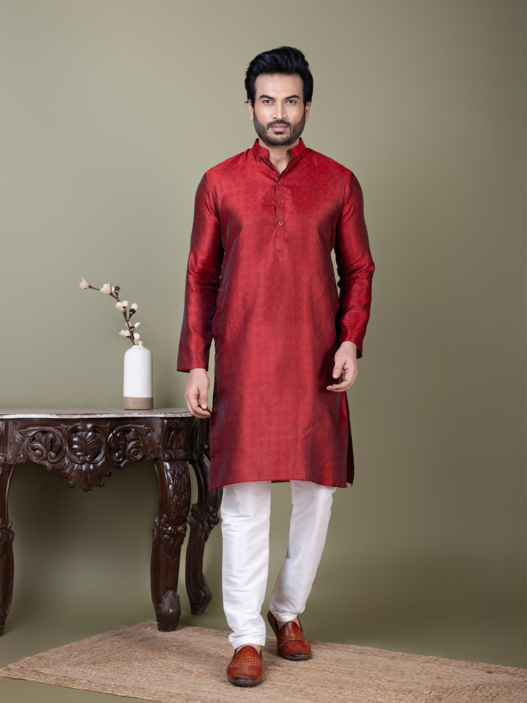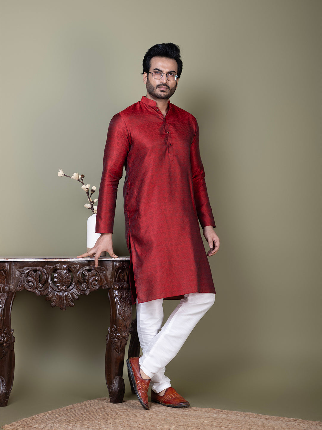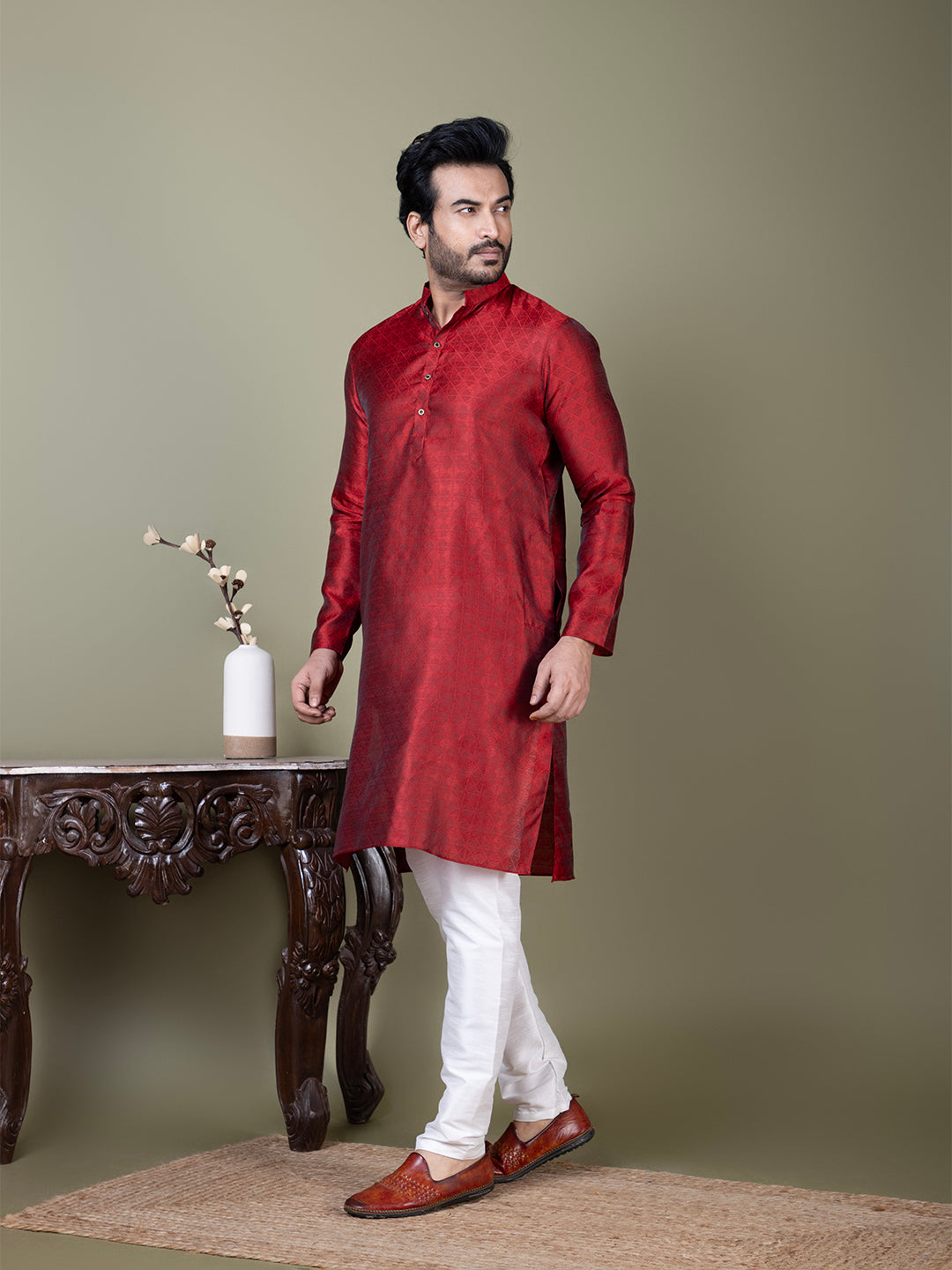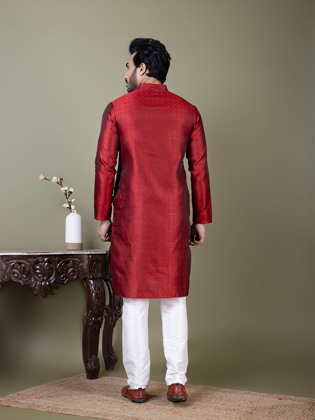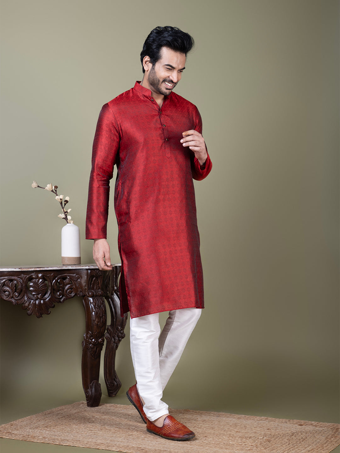 Pair this Red Jacquard kurta with white churidar or trousers for a bold yet sophisticated ethnic look. Perfectly suited for evening parties and traditional celebrations.
