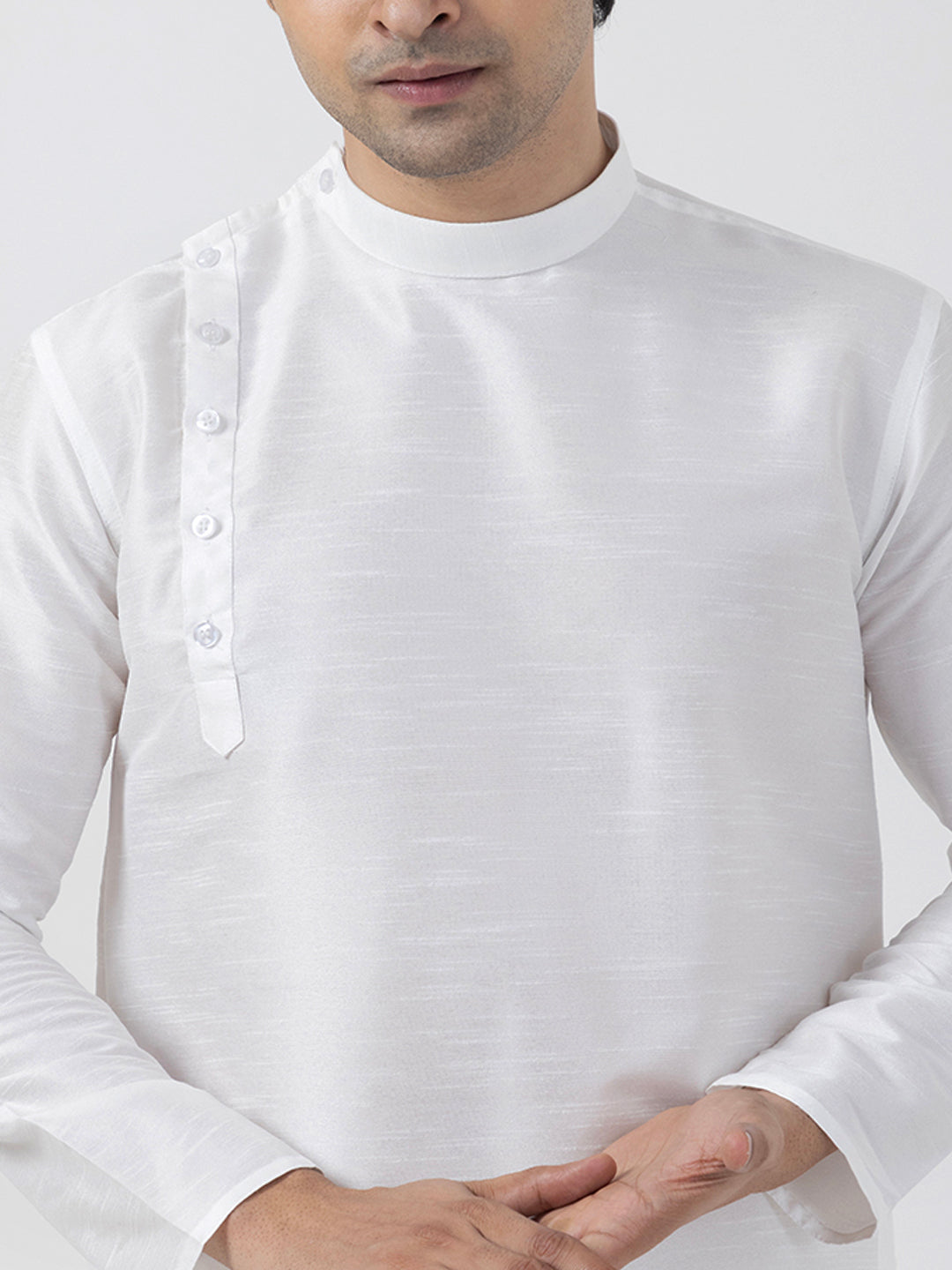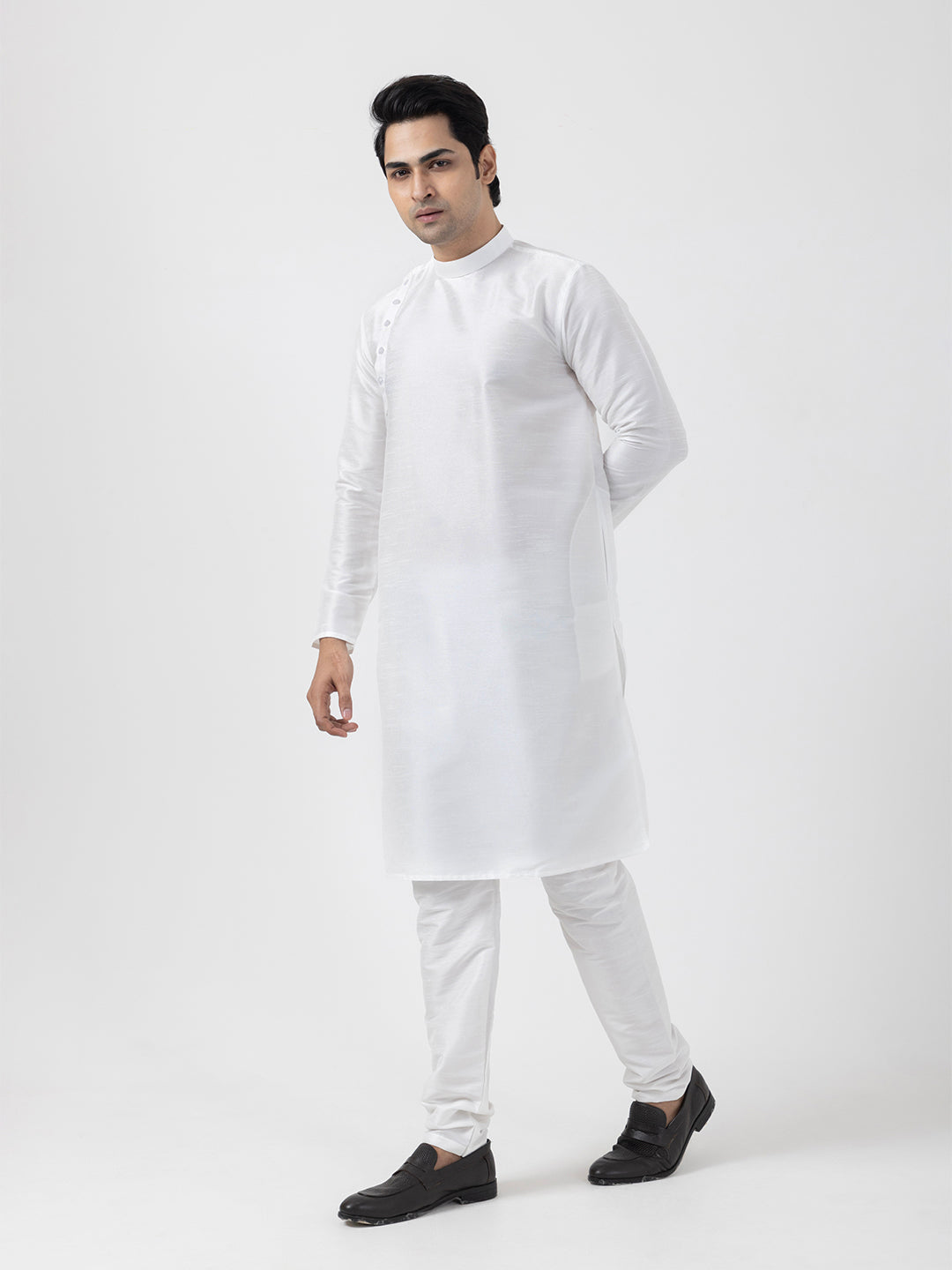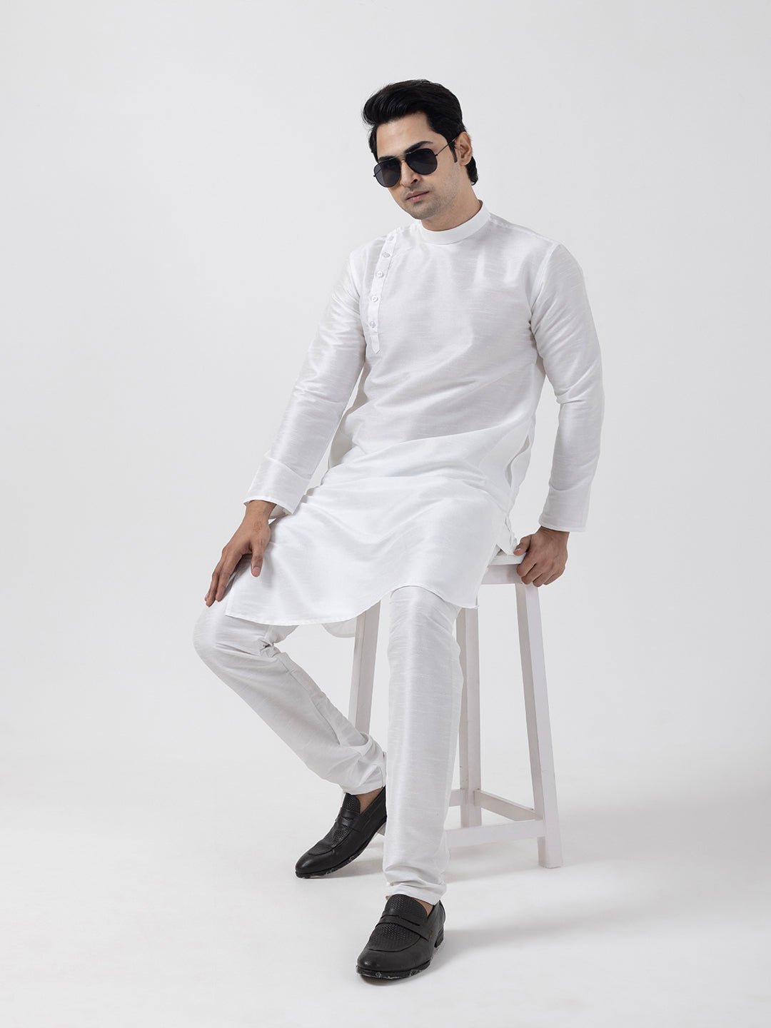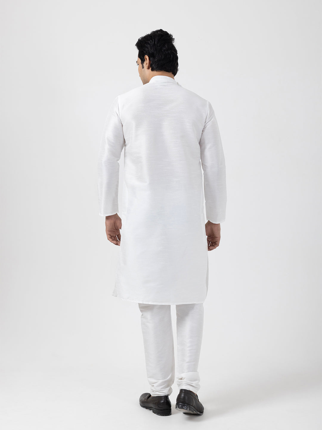 Elevate your ethnic style with this White Dupion Silk Kurta and White pyjama set . Crafted with fine detailing and a side placket closure, this outfit is perfect for festive occasions, weddings, and special celebrations where style meets tradition.