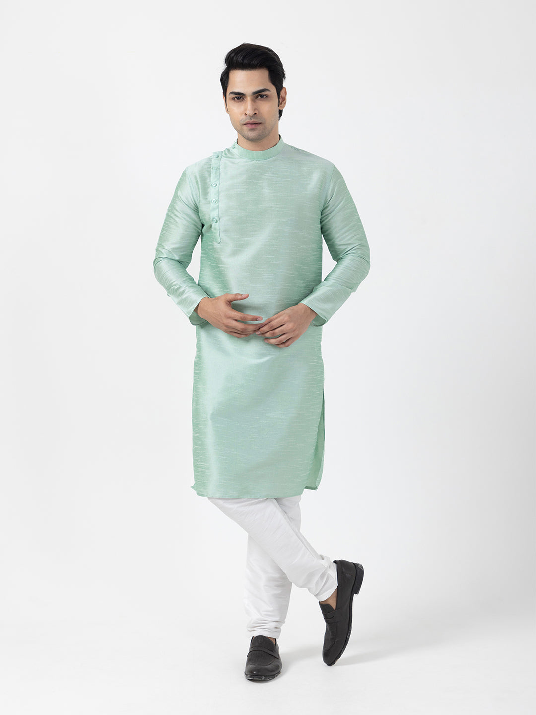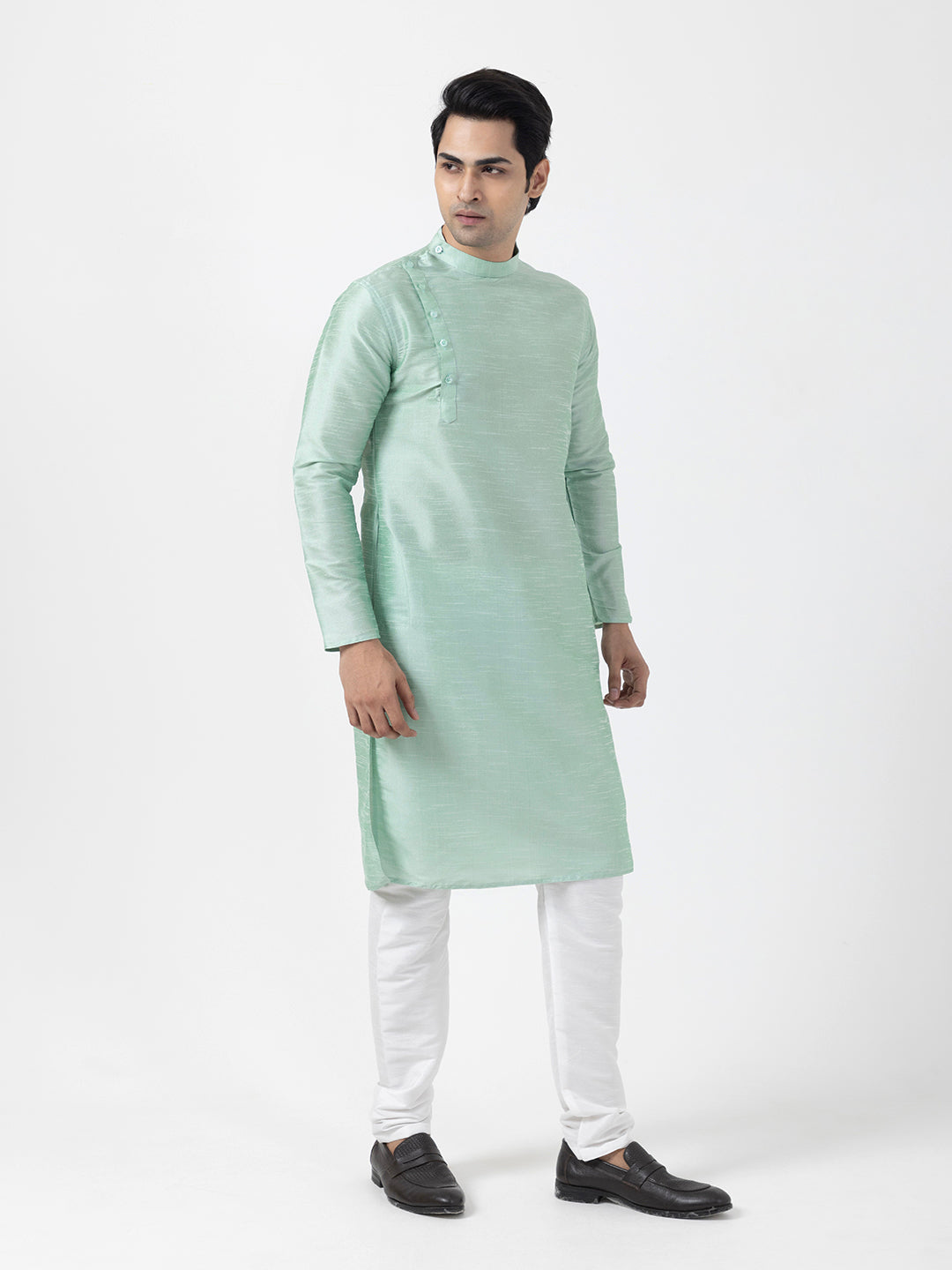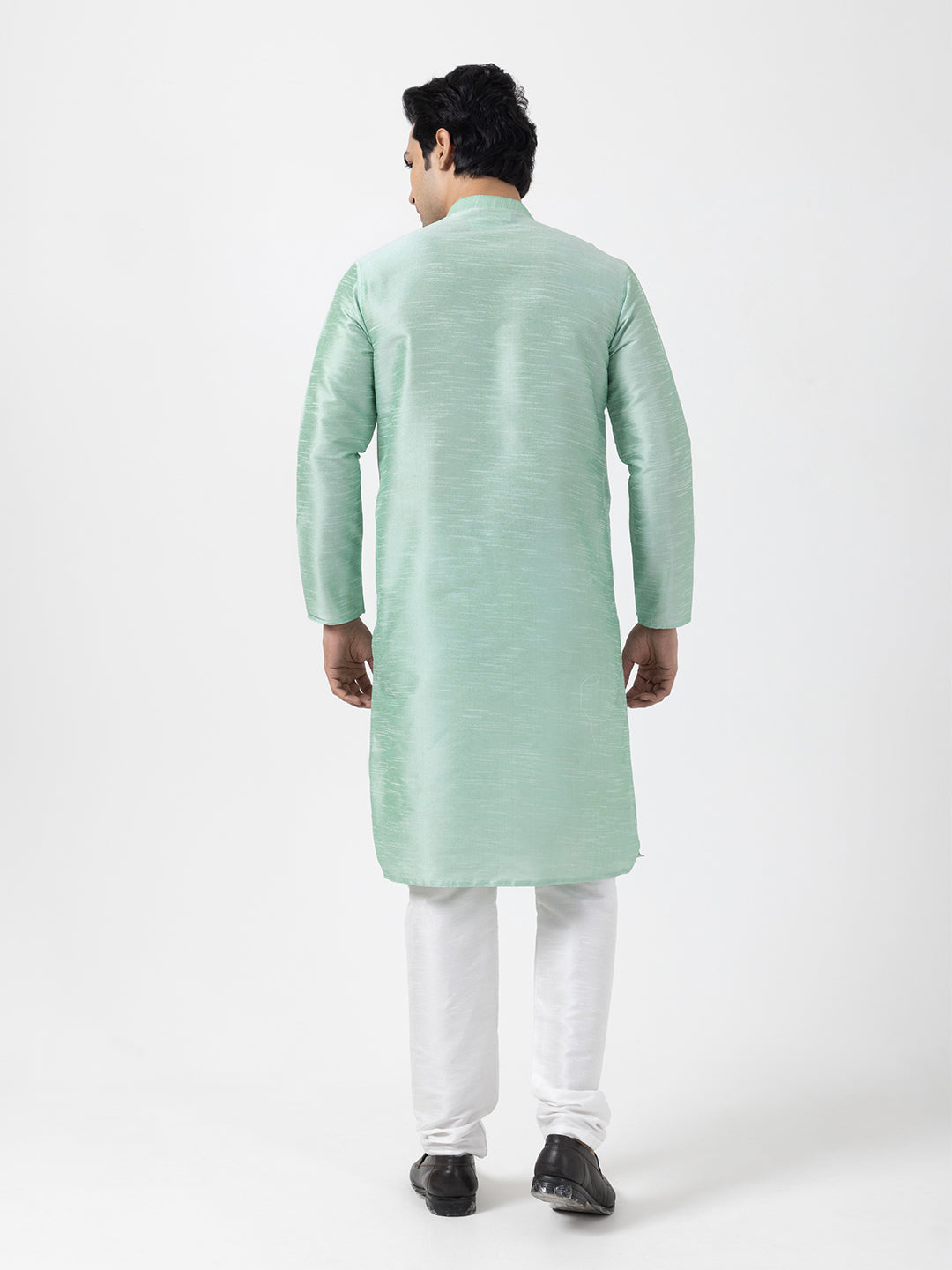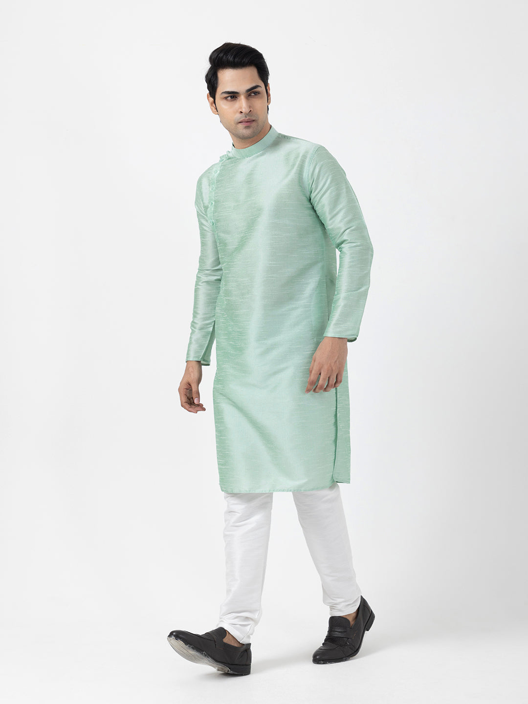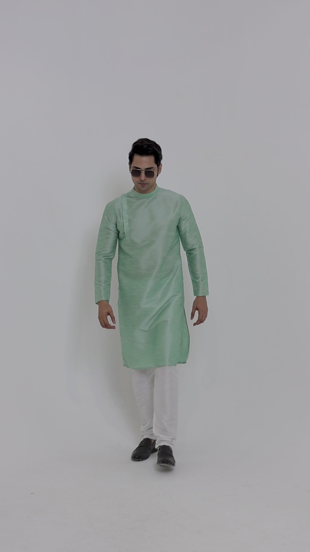 Elevate your ethnic style with this Green Dupion Silk Kurta and White pyjama set . Crafted with fine detailing and a side placket closure, this outfit is perfect for festive occasions, weddings, and special celebrations where style meets tradition.