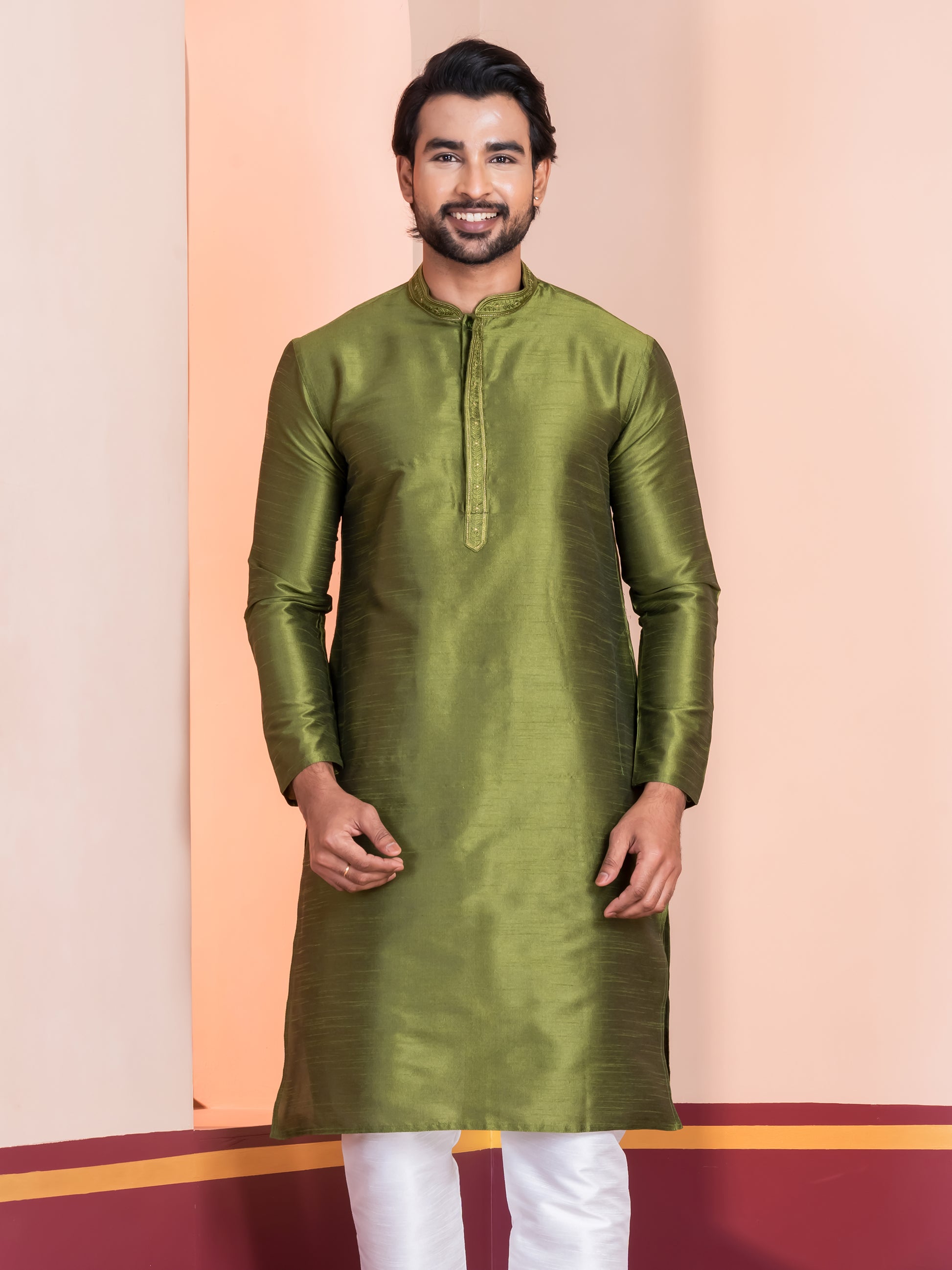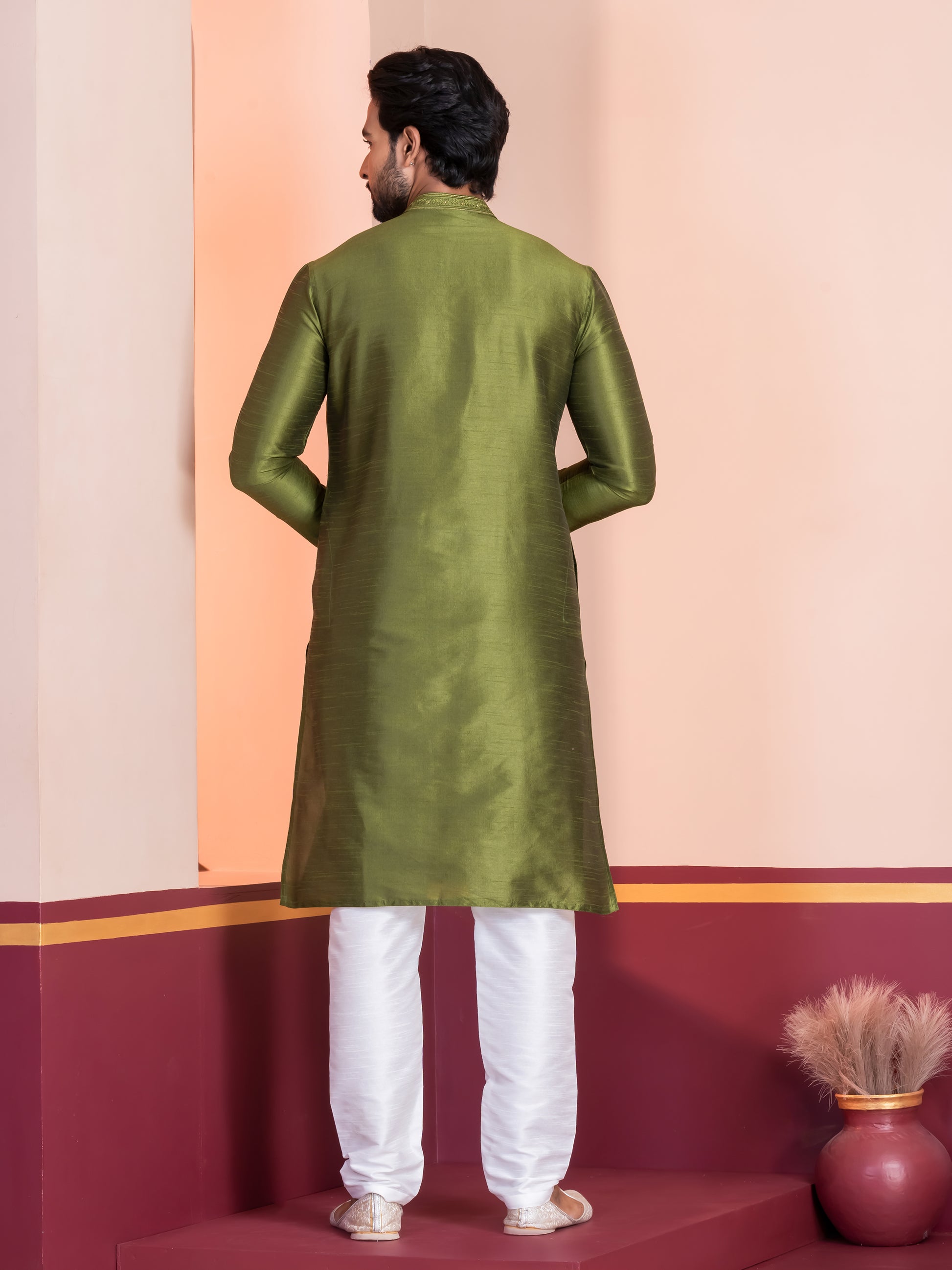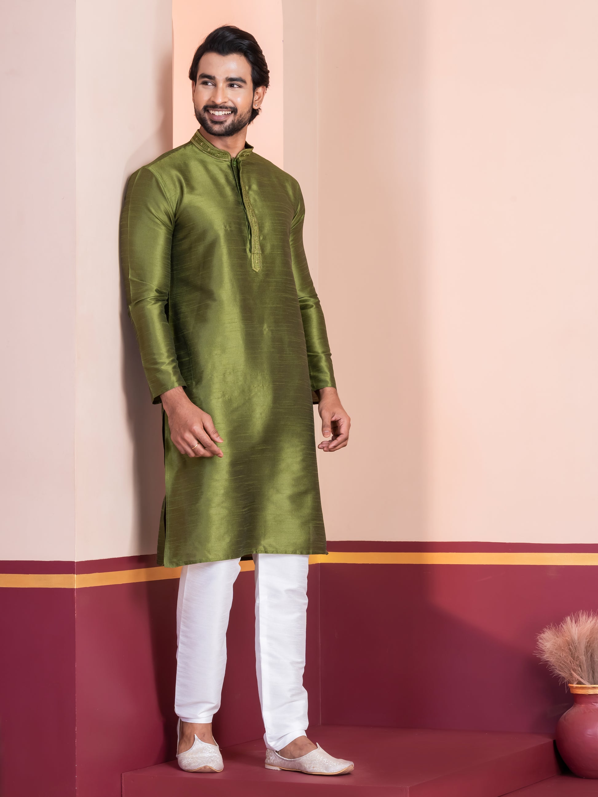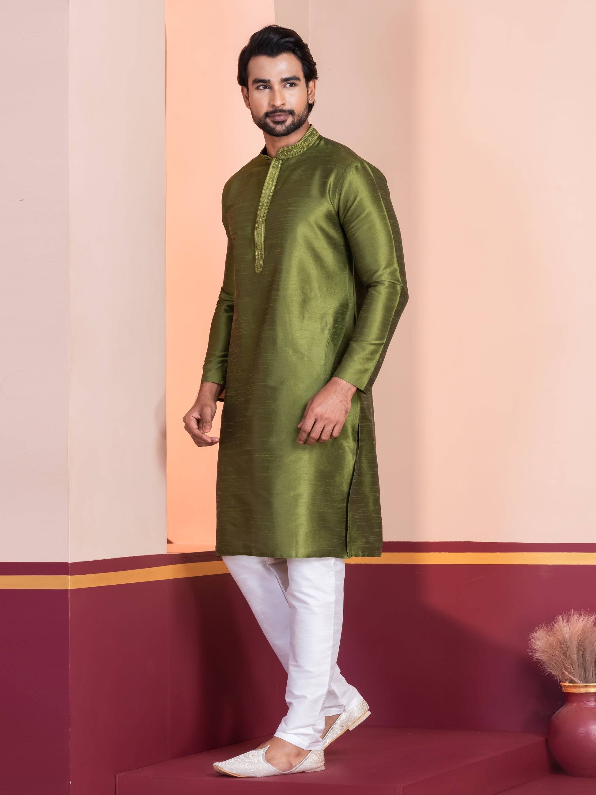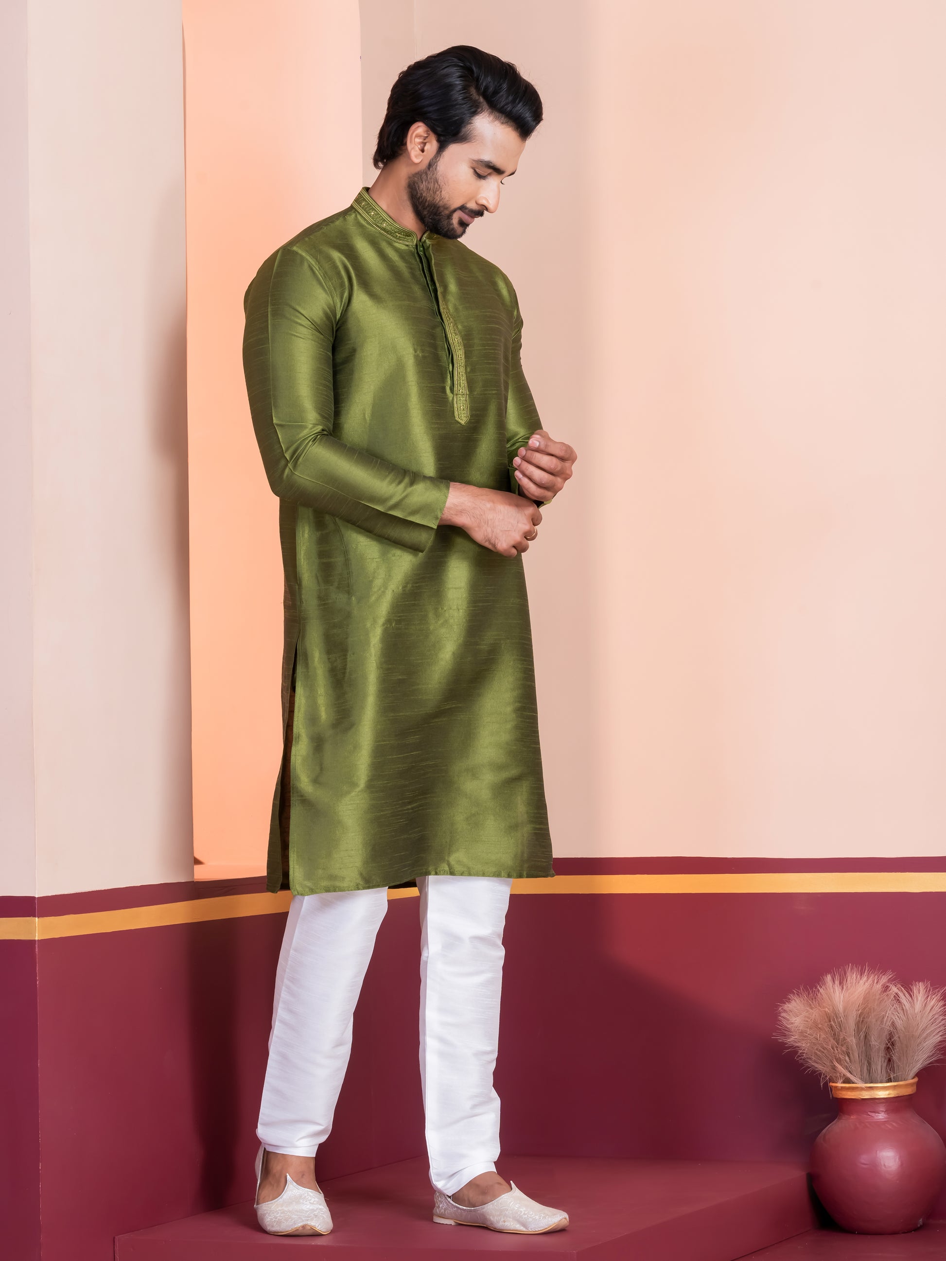 Pair this Green kurta with a White churidar or slim-fit trousers for a sophisticated ethnic look. Complete the ensemble with traditional mojris or leather loafers to exude elegance and charm.