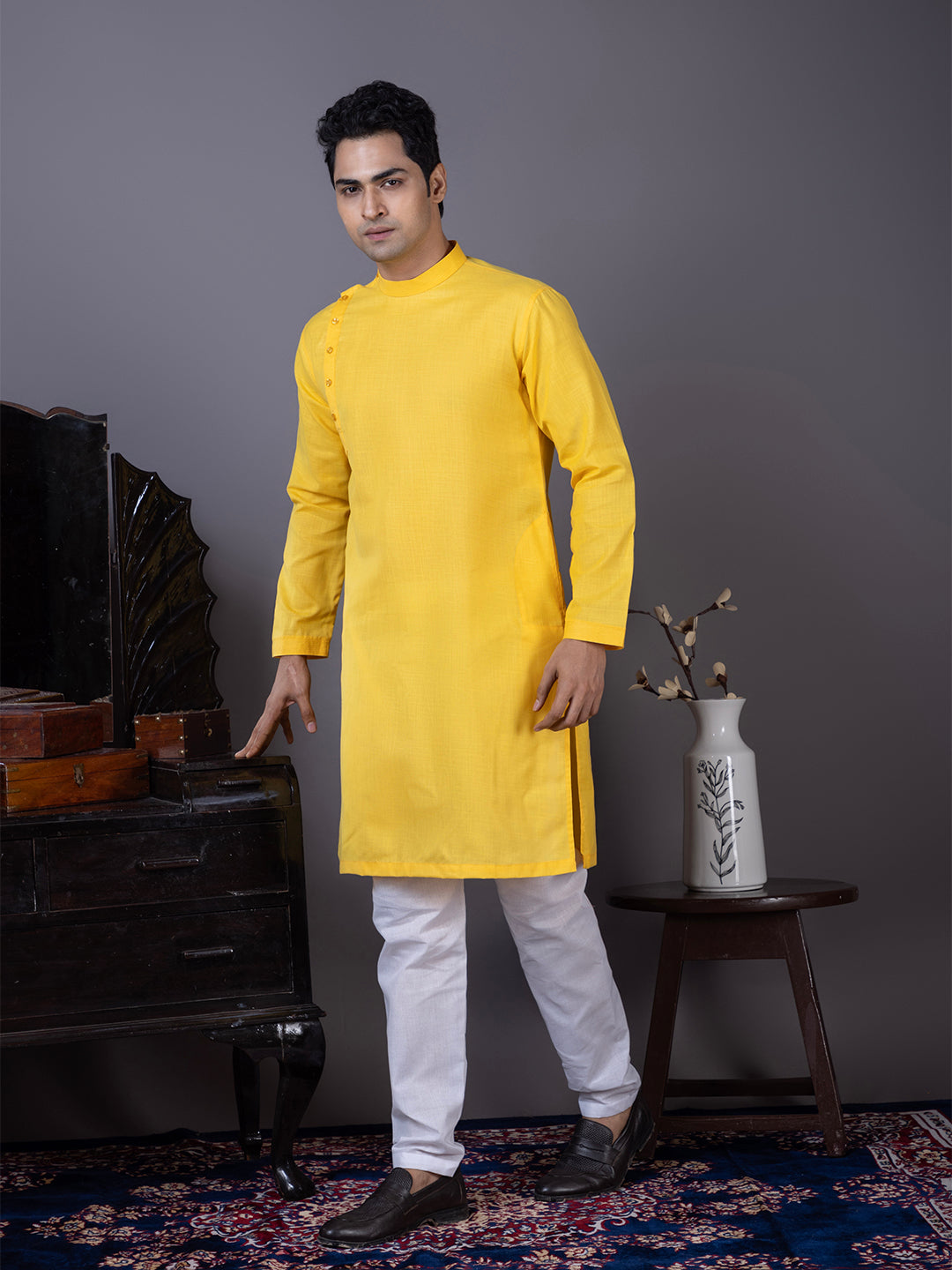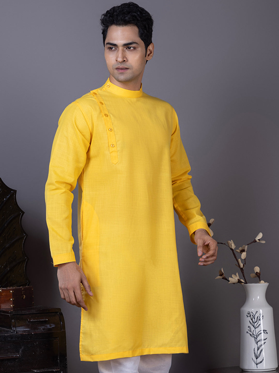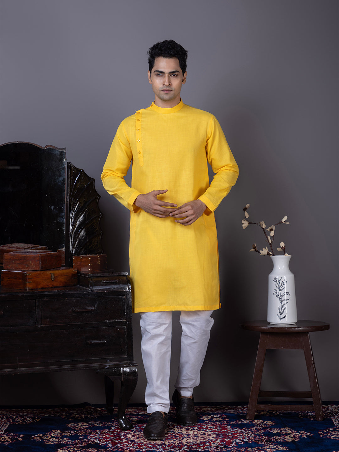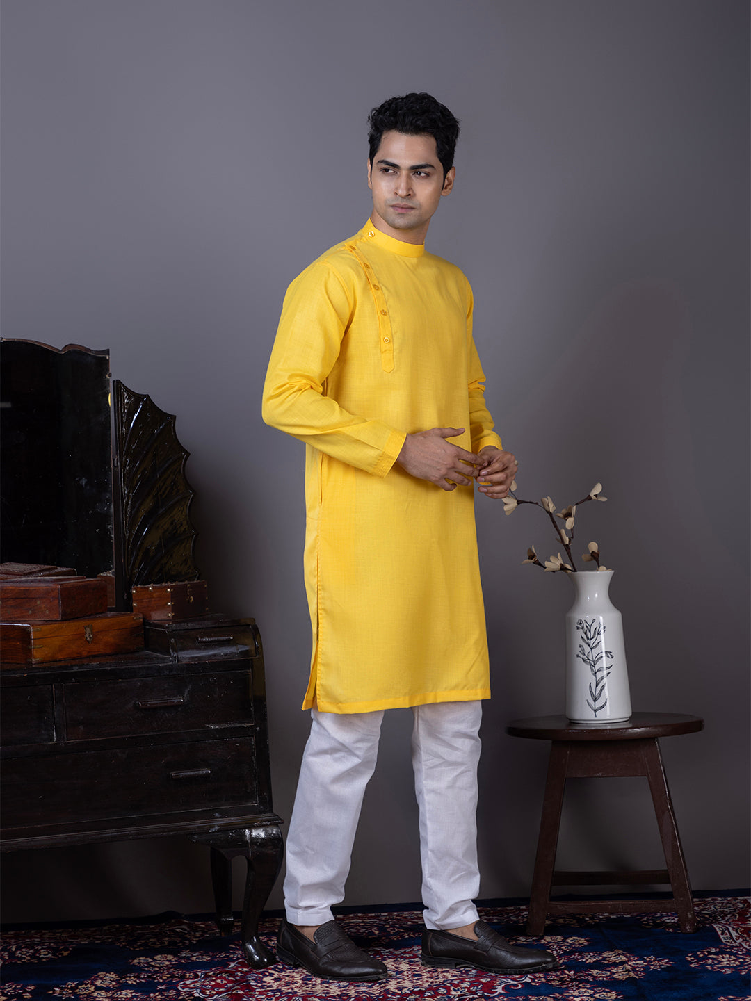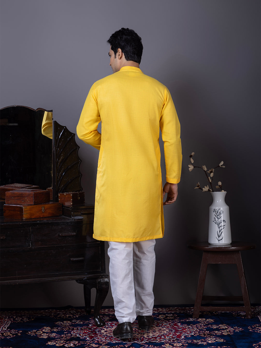 Pair this classic Yellow kurta with traditional mojaris or embroidered juttis for a royal look. Add a contrasting stole or a statement watch to enhance your festive attire effortlessly.