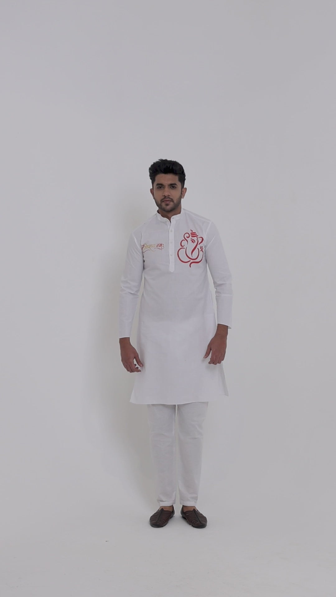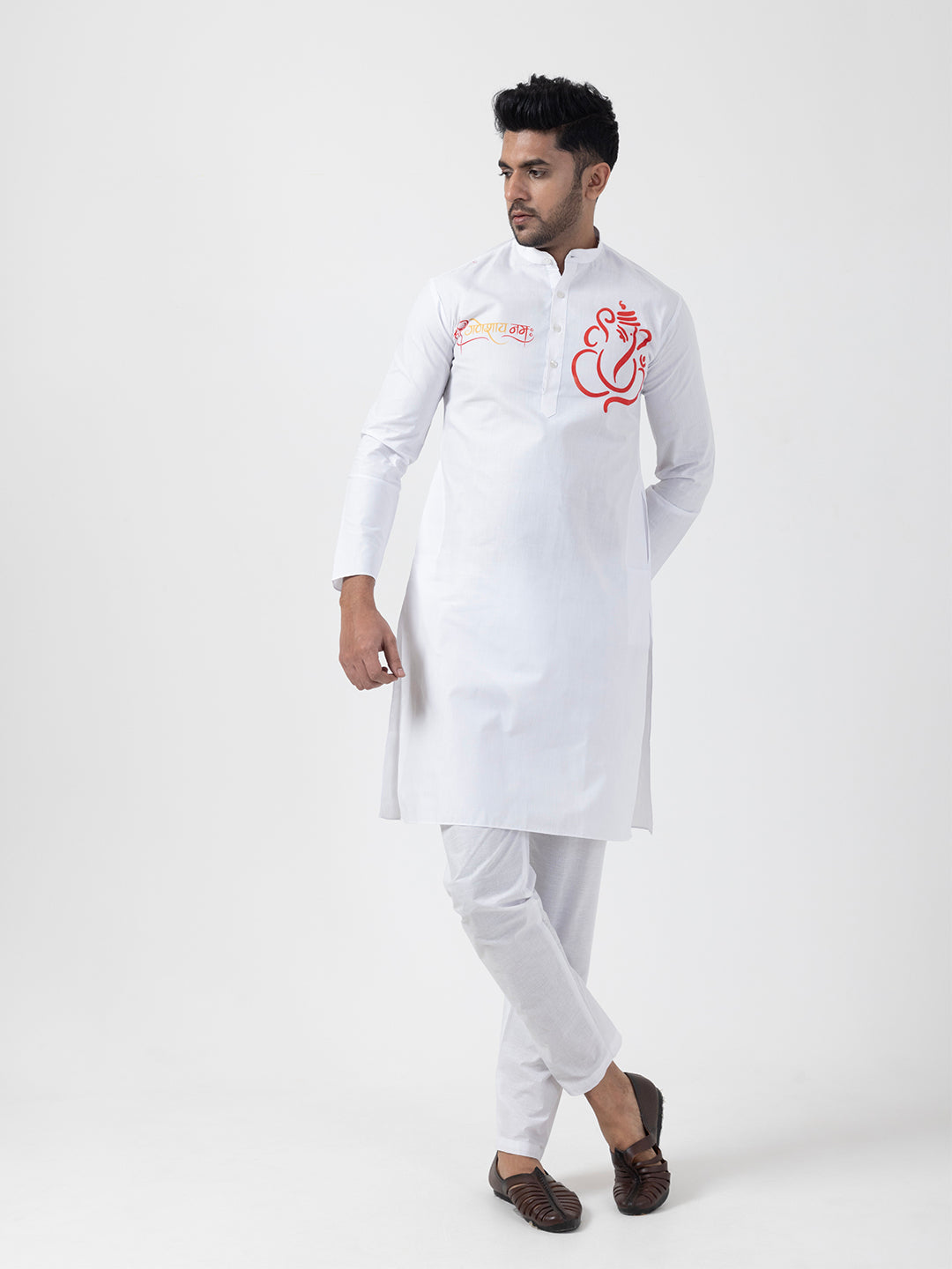 "Elevate your ethnic style with this White cotton kurta and white pyjama set. Designed for comfort and elegance, it features a subtle print and a mandarin collar, perfect for festive and cultural occasions."